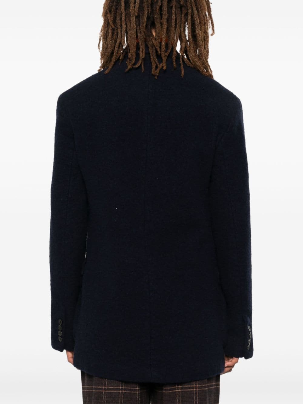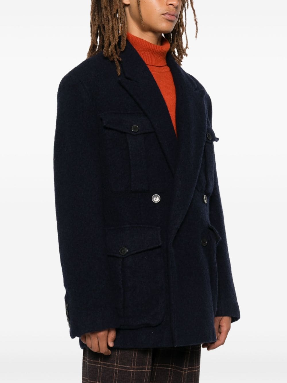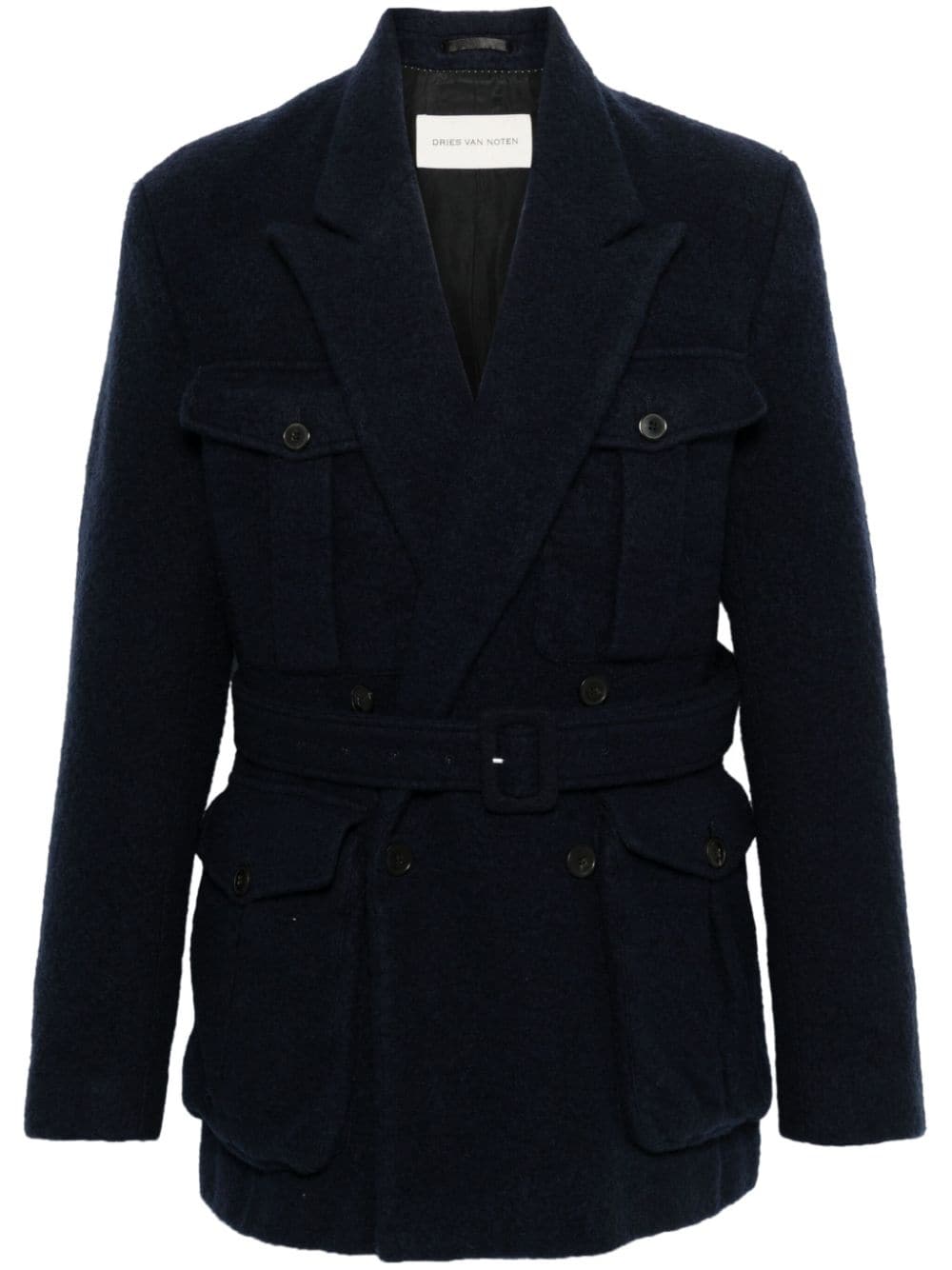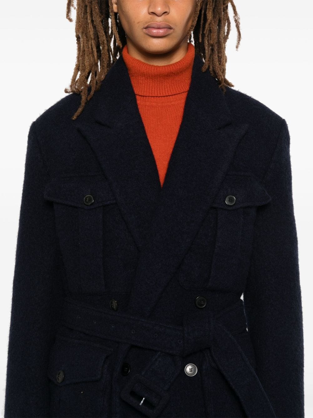 jacket, heavy fabric, peak lapels, double breasted, button closure, removable belt with belt loops, front pockets with flaps and buttons, lined, long sleeves, cuffs with buttons Composition: 97% wool 2% cotton 1% linen Washing instructions: dry clean