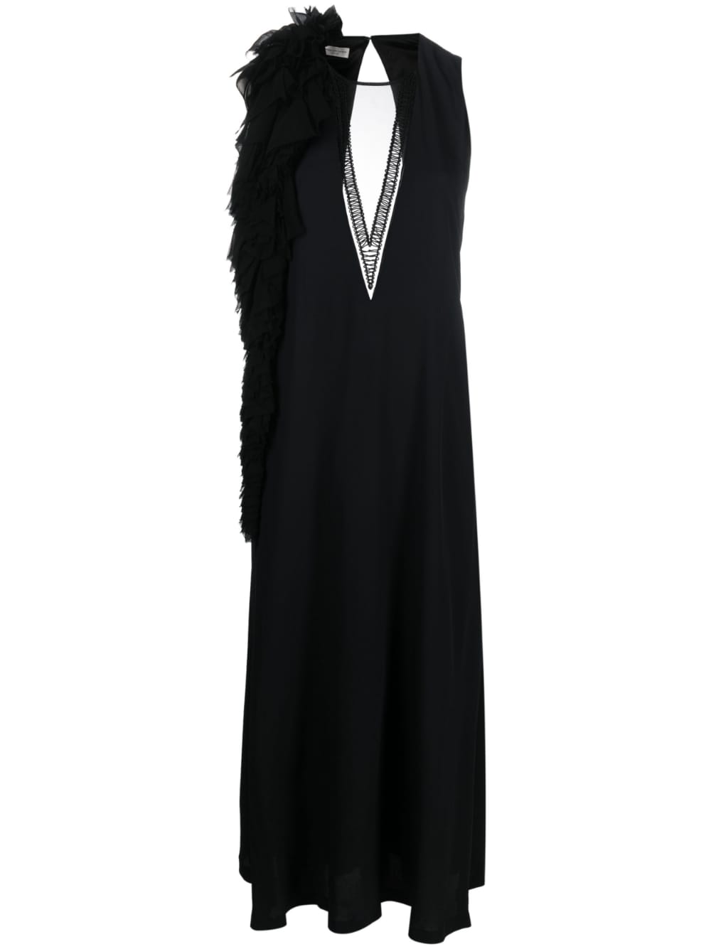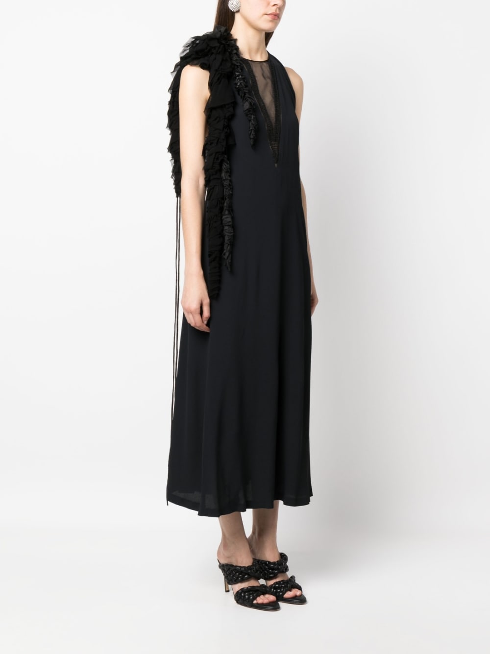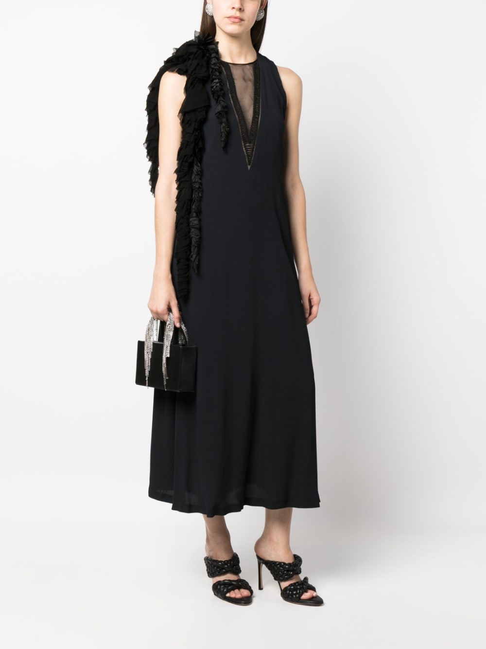 midi dress, hanging flower on shoulder, sleeveless, front sheer fabric, back neckline, flared bottom, linedComposition: 65% acetate 35% silkWashing instructions: dry clean