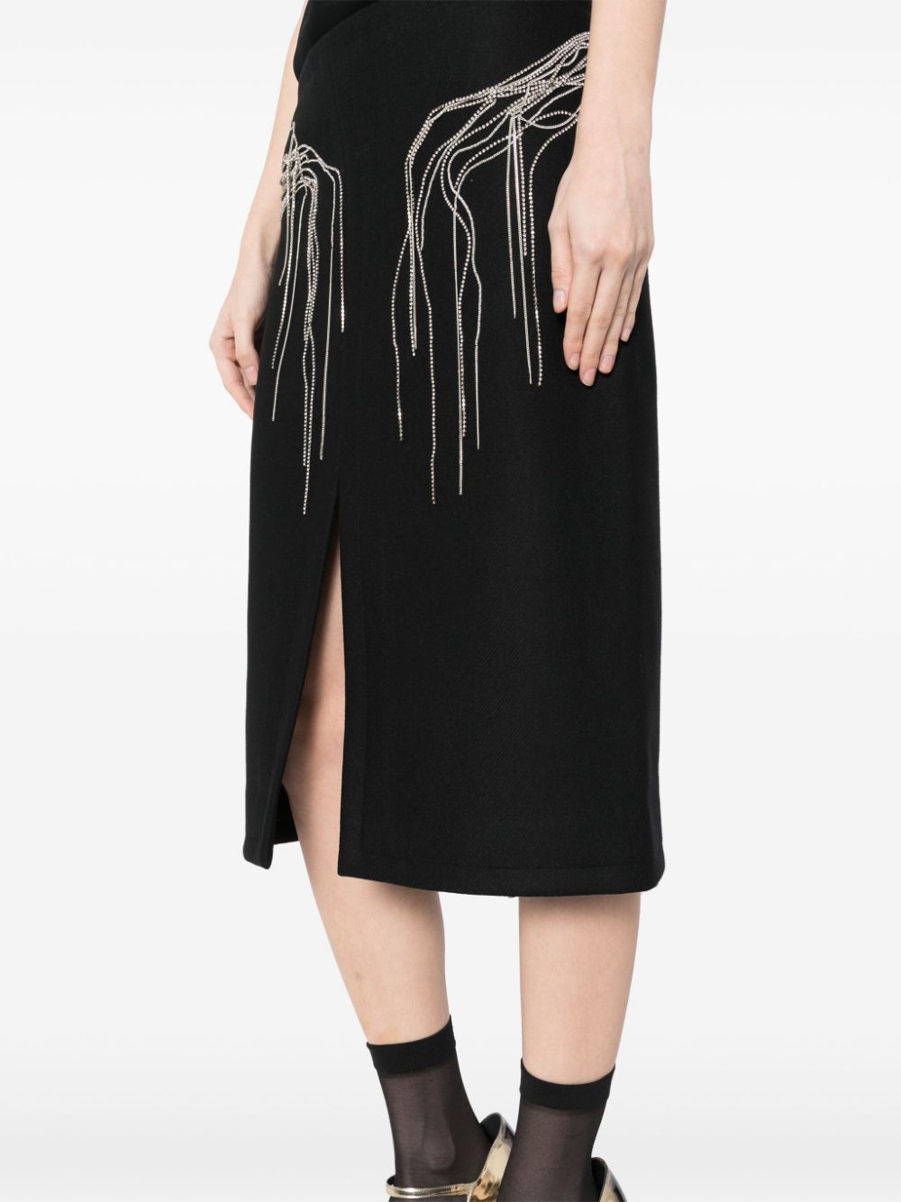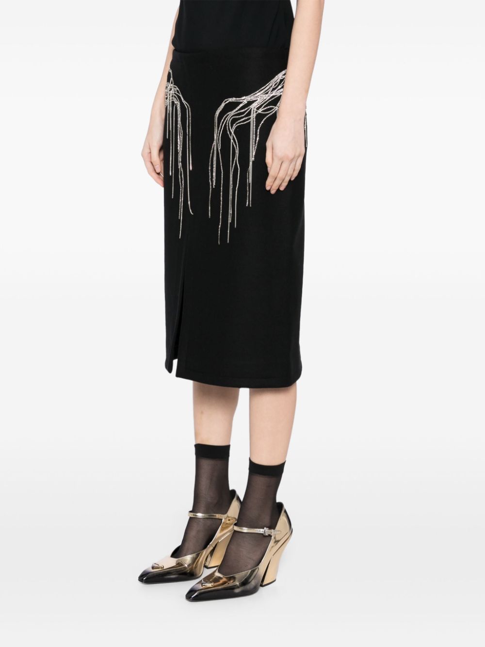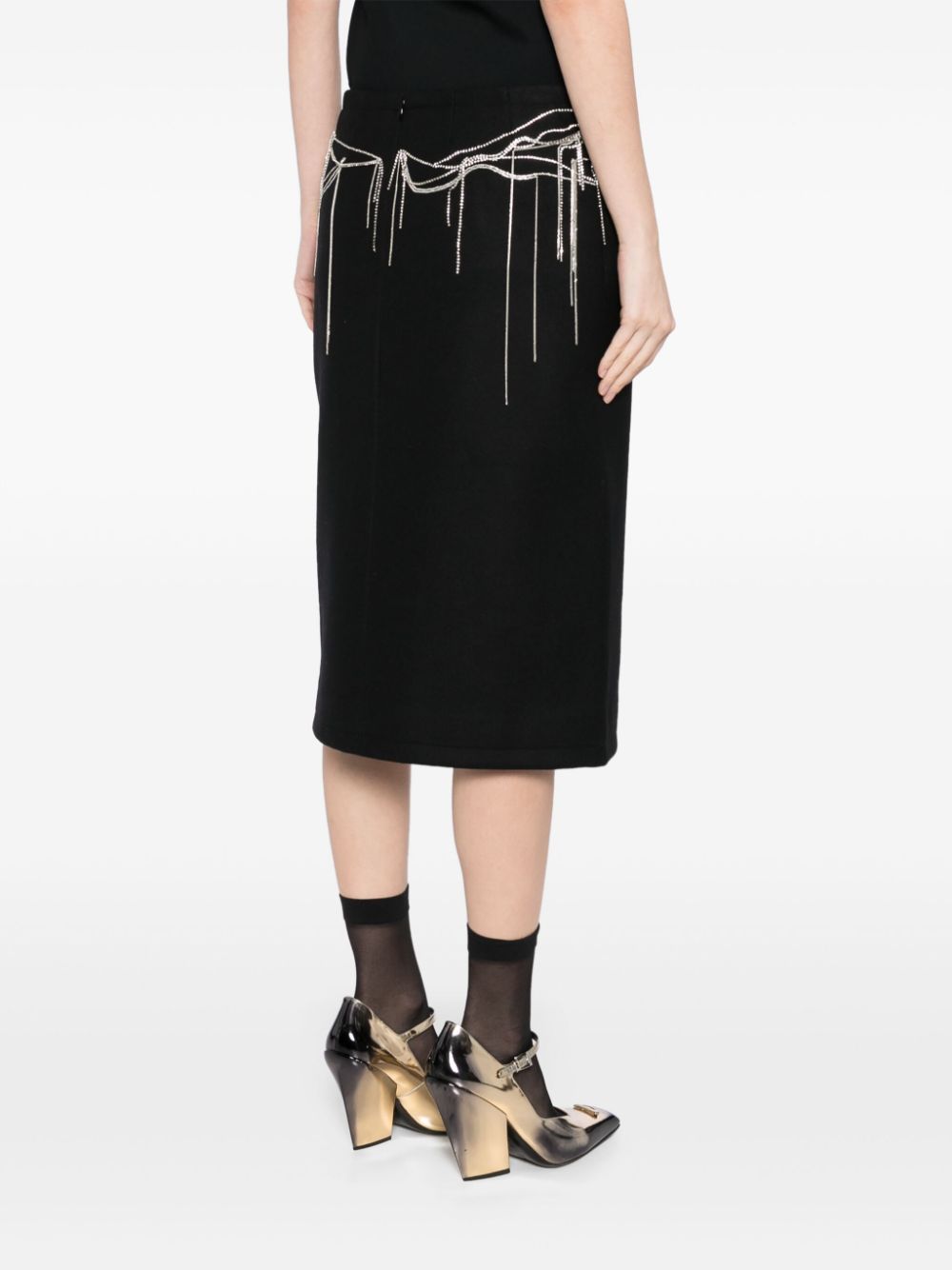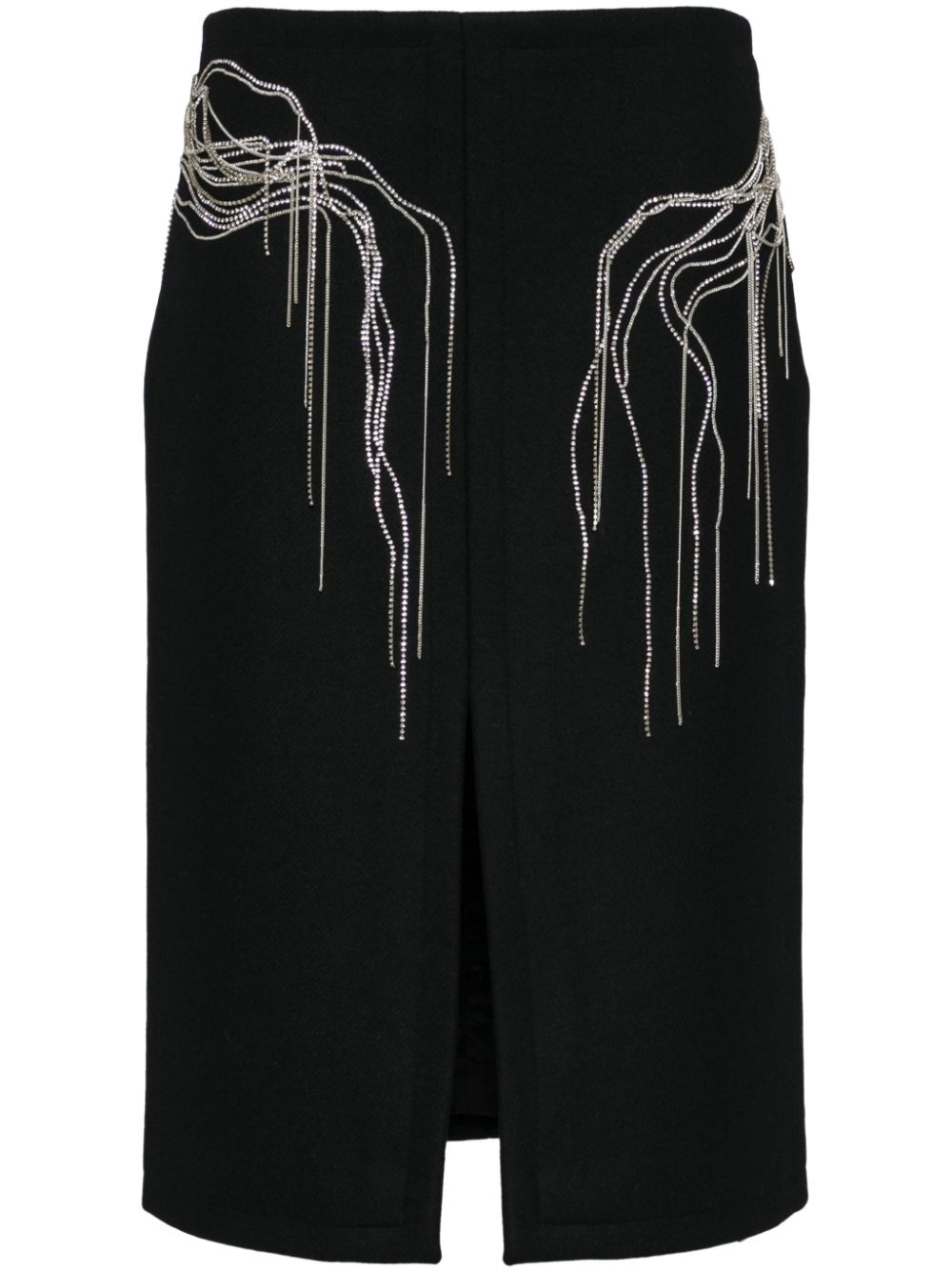 pencil skirt, central slit, metal chain applique with crystals, back zip fasteningComposition: 80% wool 20% polyamideWashing instructions: dry clean