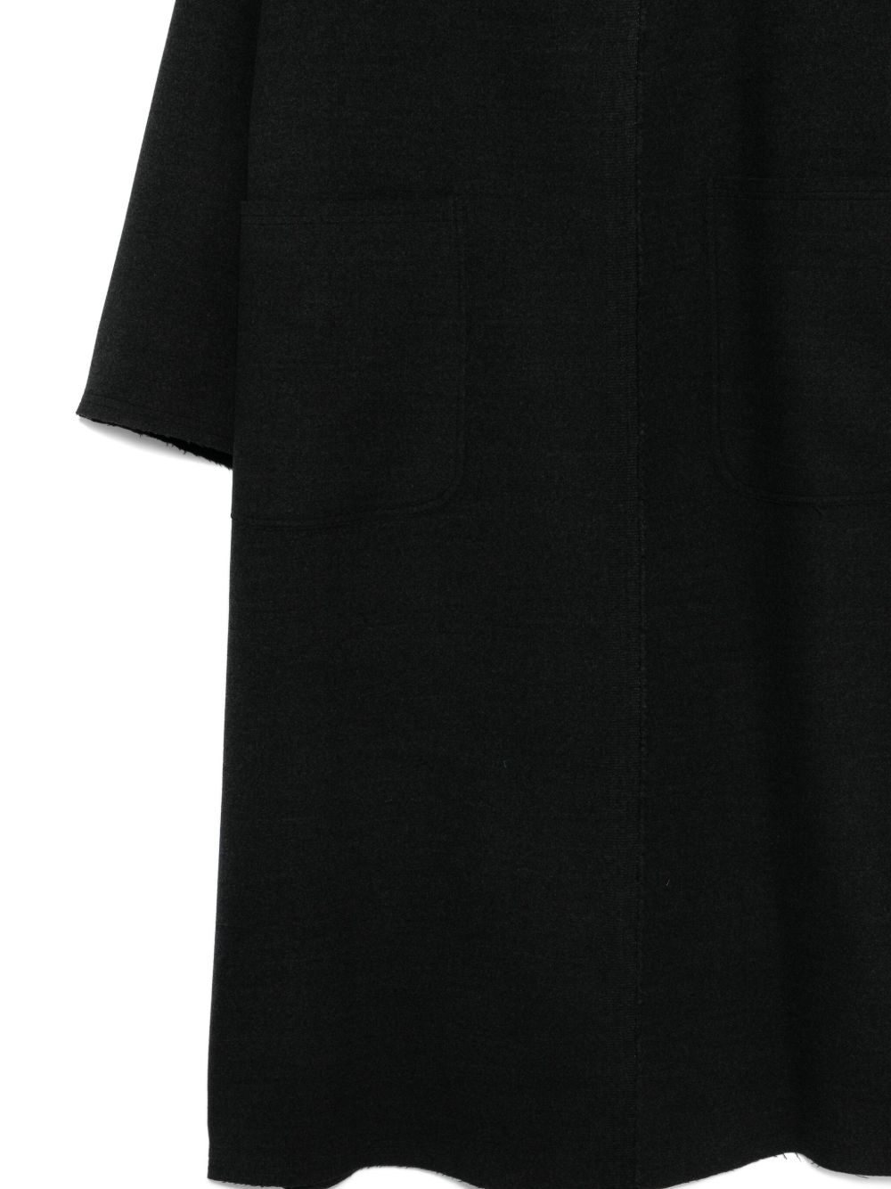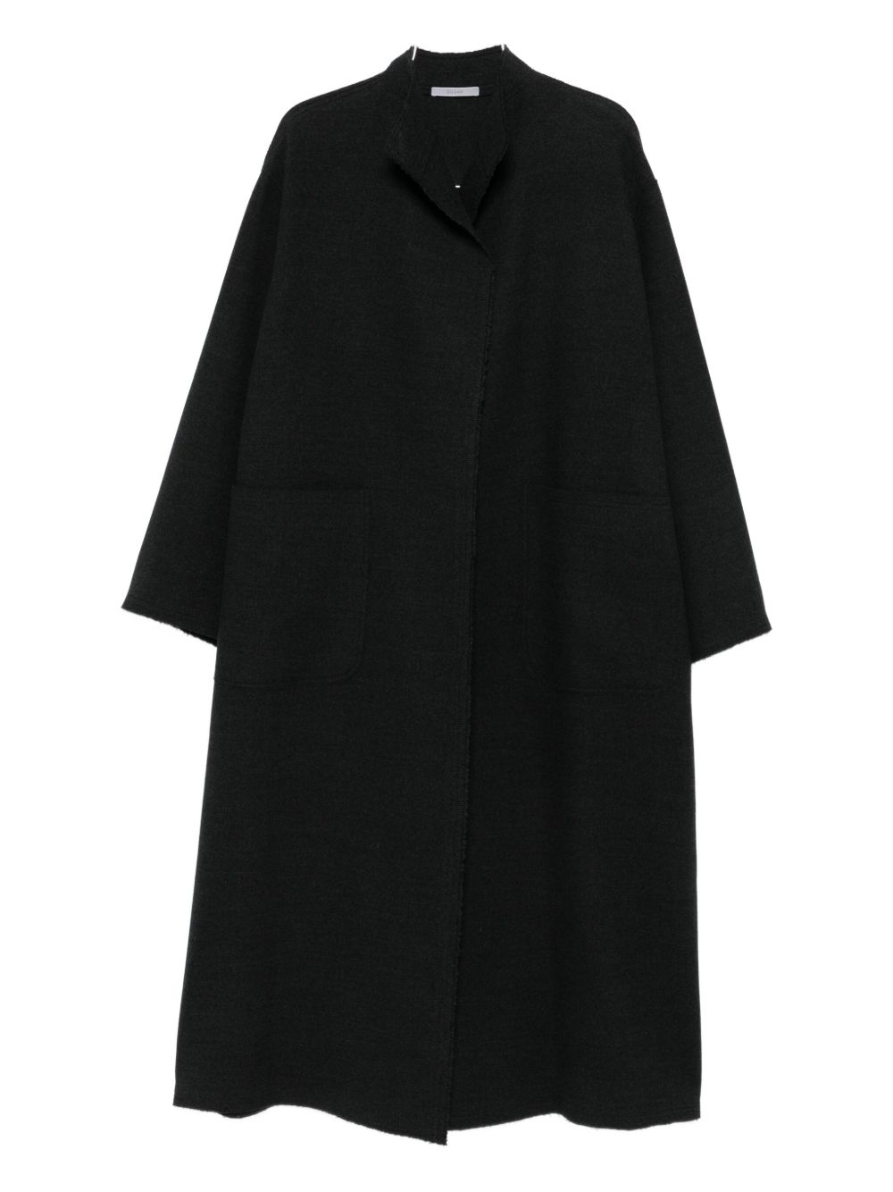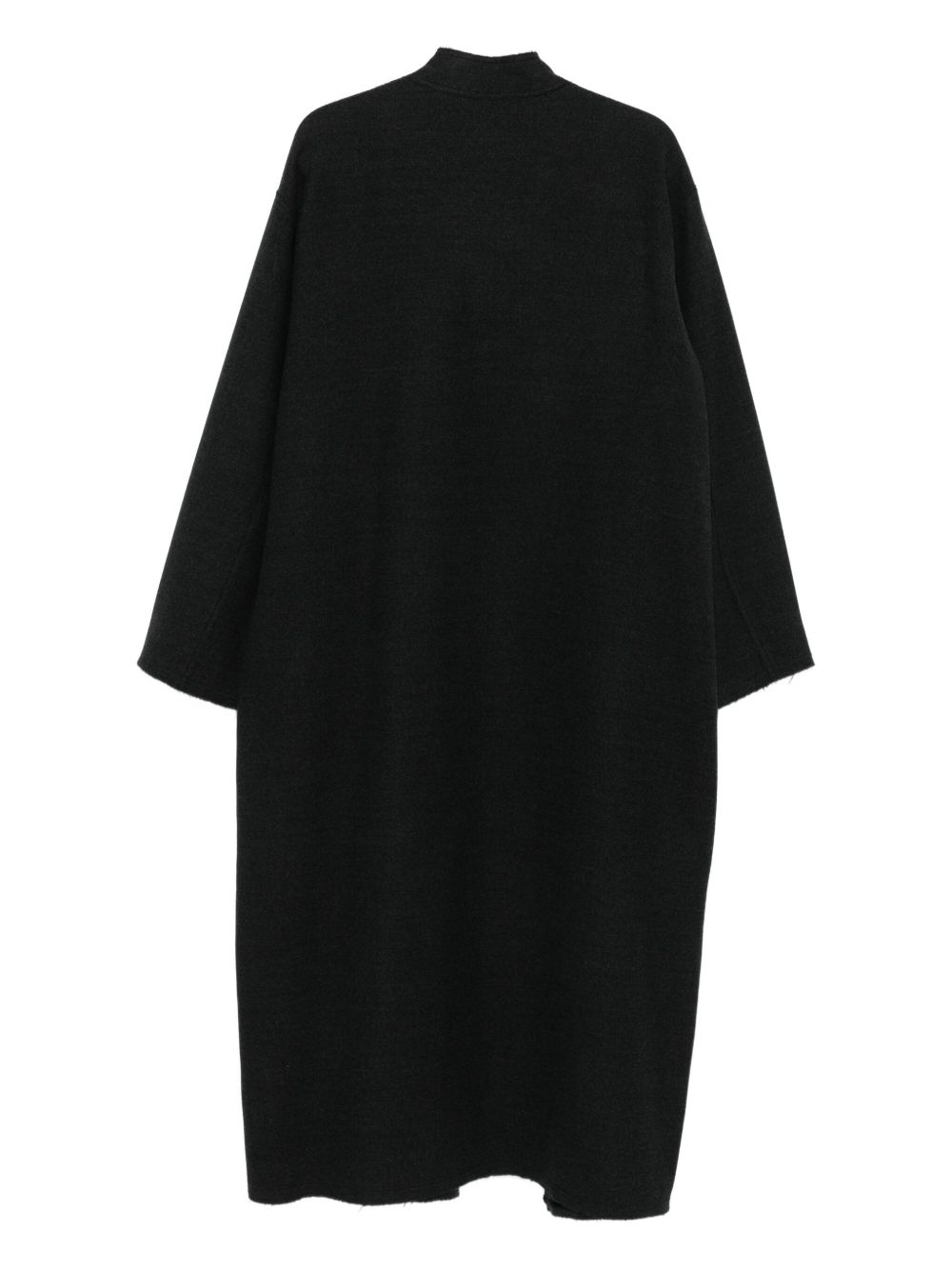 Long, oversized coat, collarless, raw-cut edges, long sleeves, side patch pockets, double-knit fabric