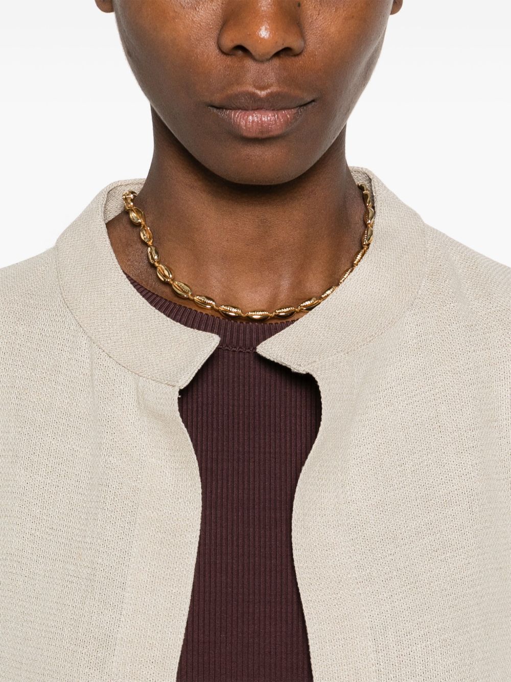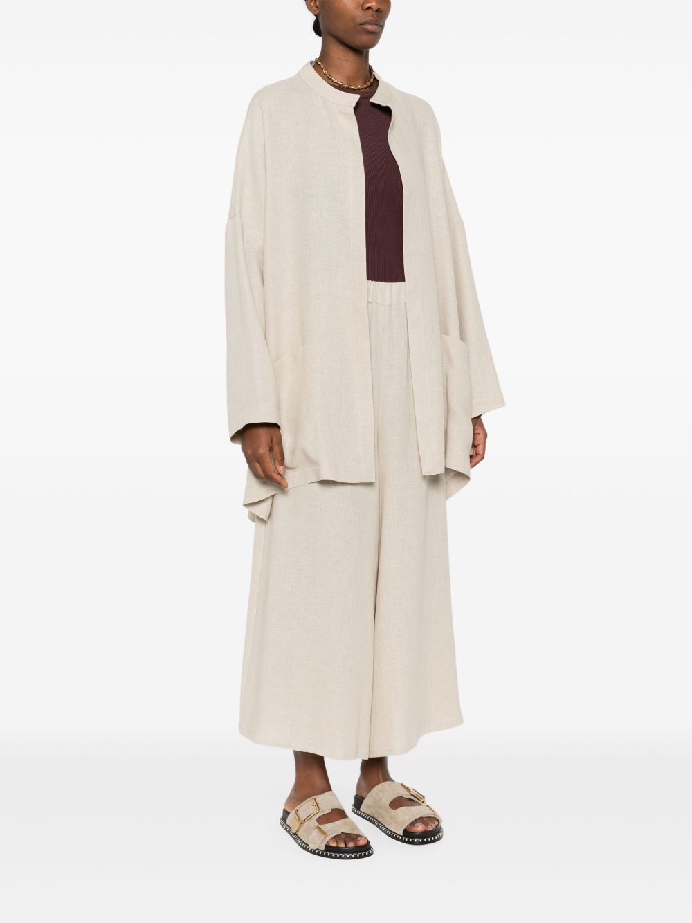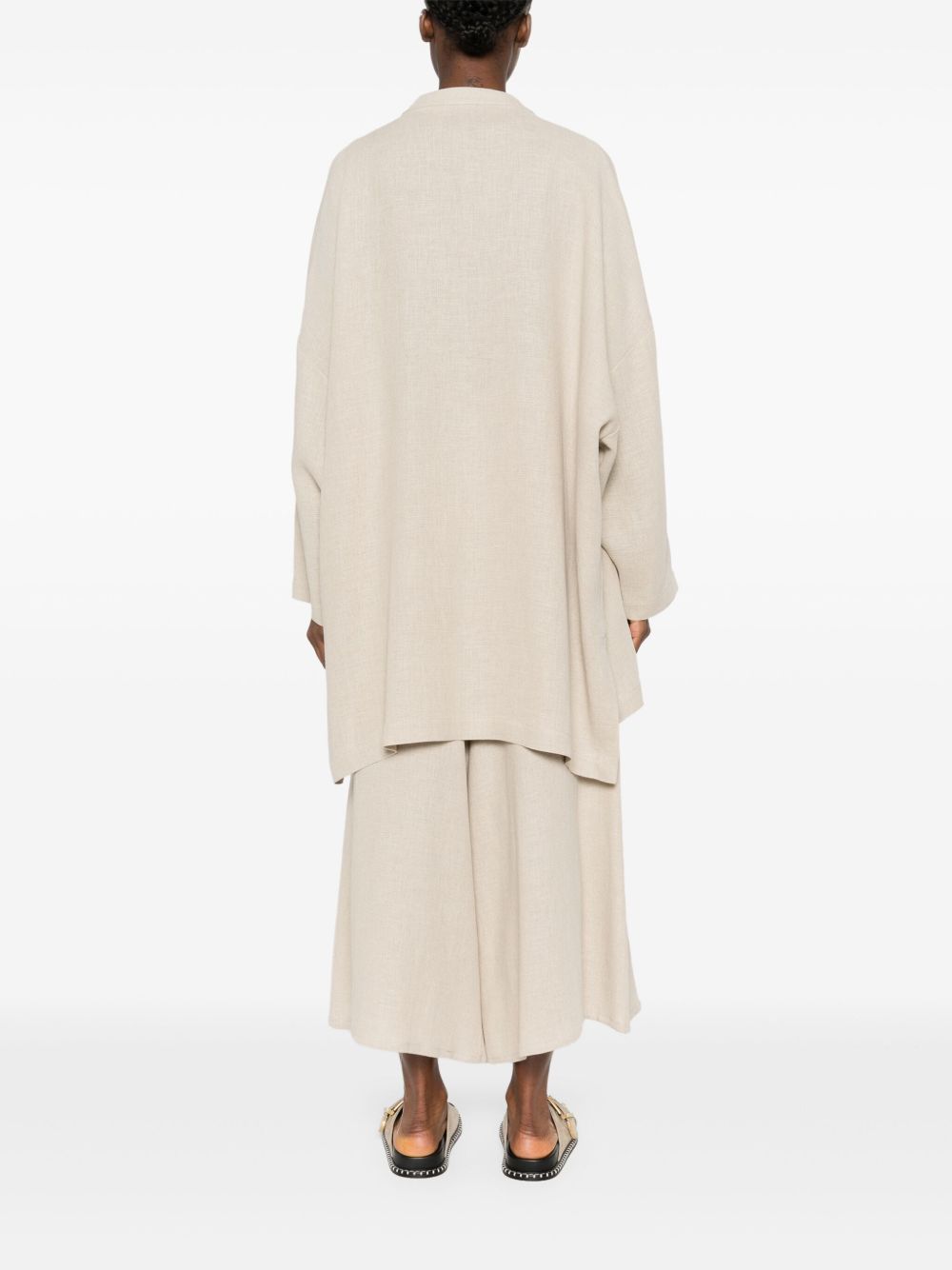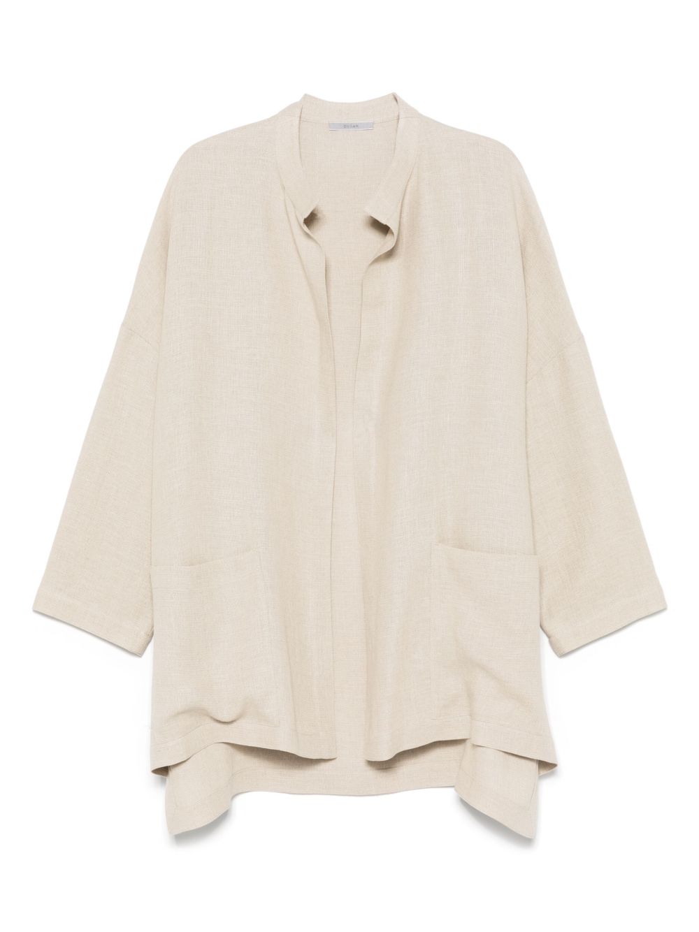 jacket, oversized, mandarin collar, long sleeve, no closure, side patch pockets, side slits, longer backComposition:100% linenWashing instructions: dry clean
