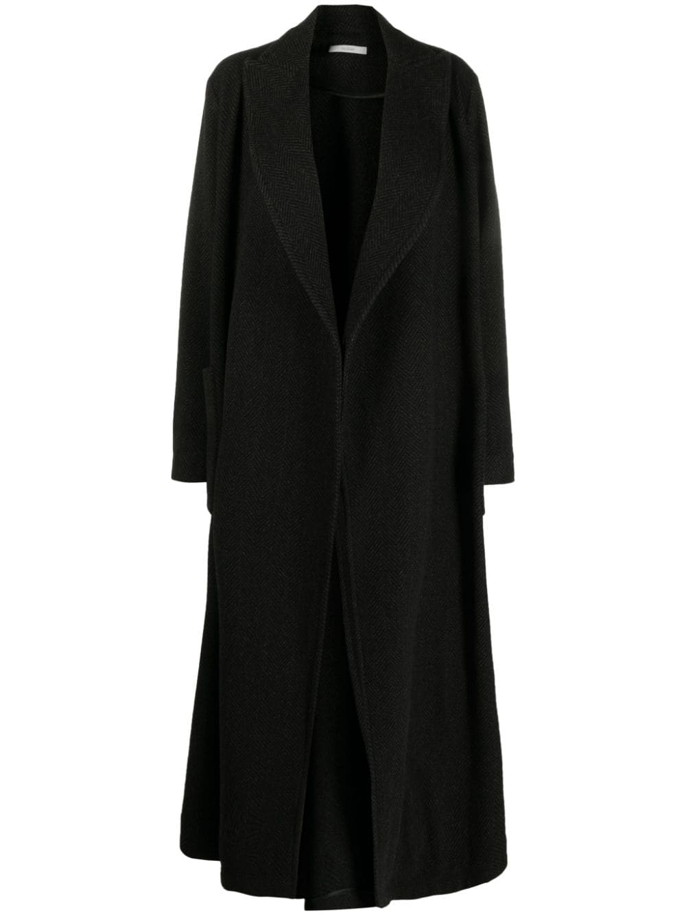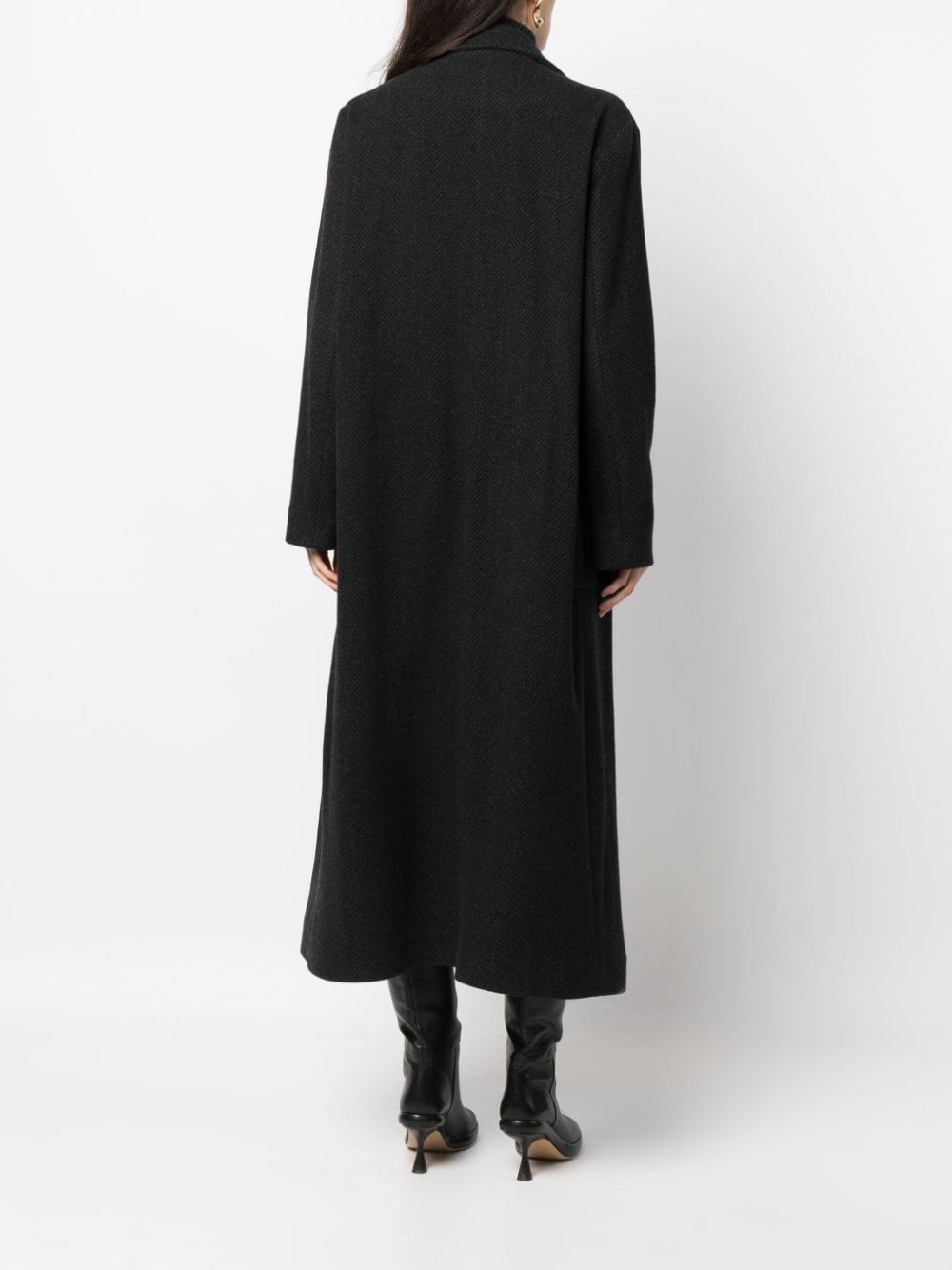 long coat, loose fit, peak lapel collar, patch pockets, flared bottom, unlined, herringbone fabric
