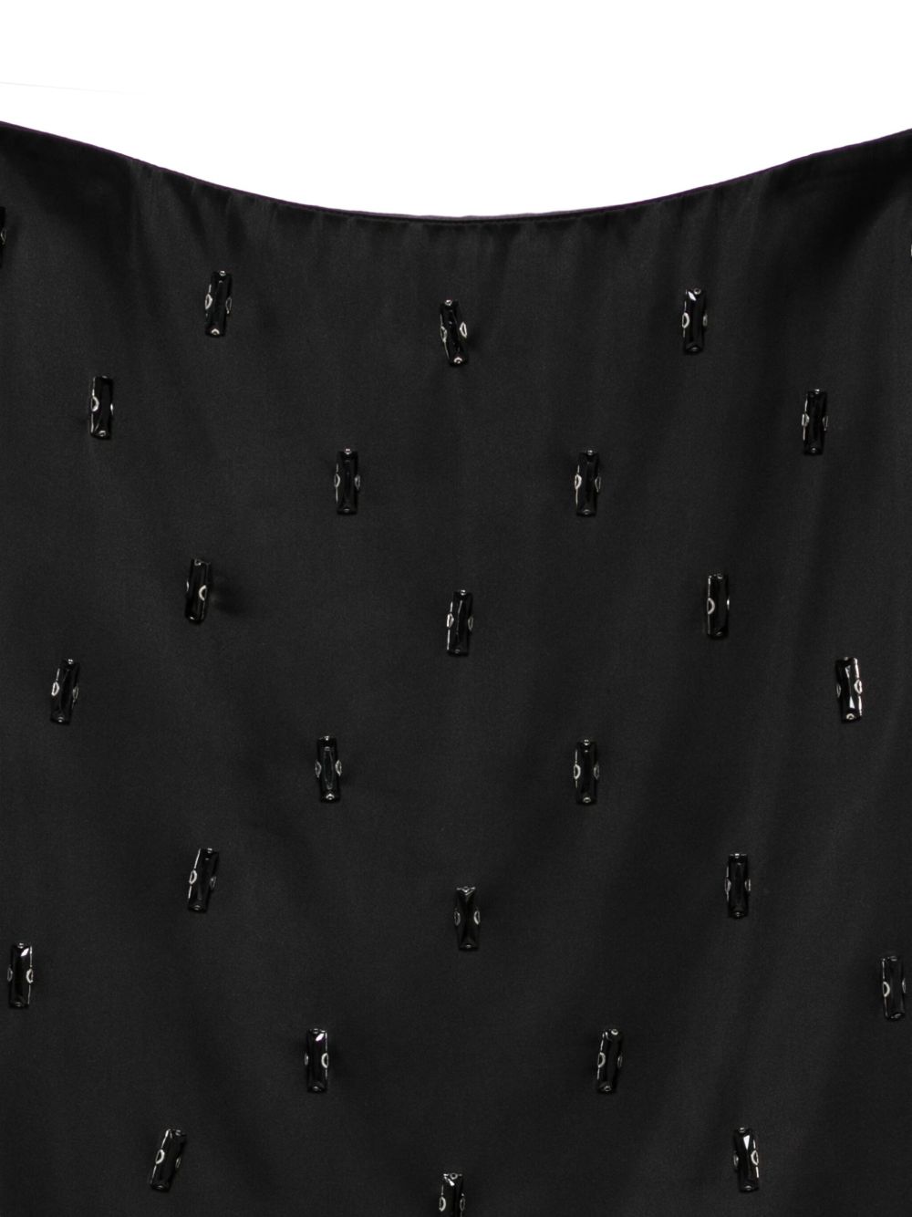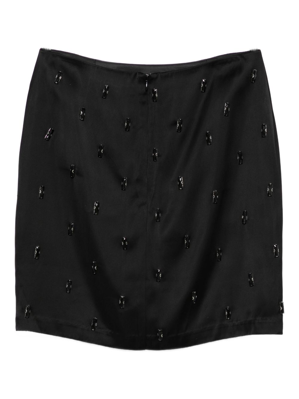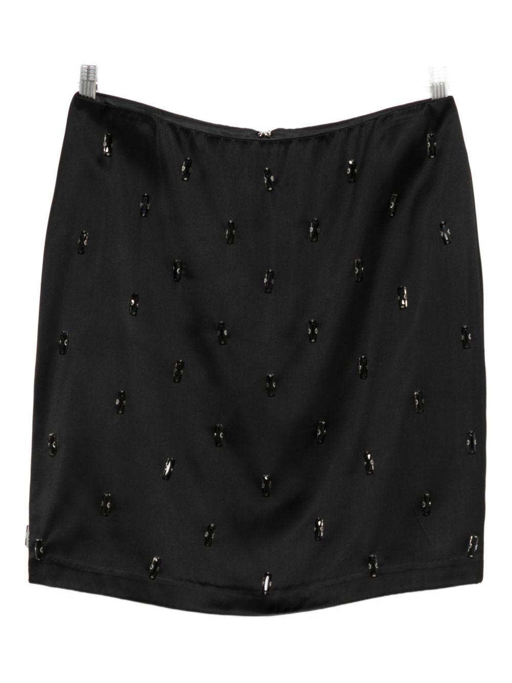 Short skirt, flowing satin, back zip and hook closure, all-over hand-appliqués, lined