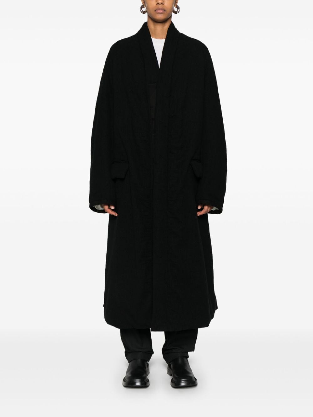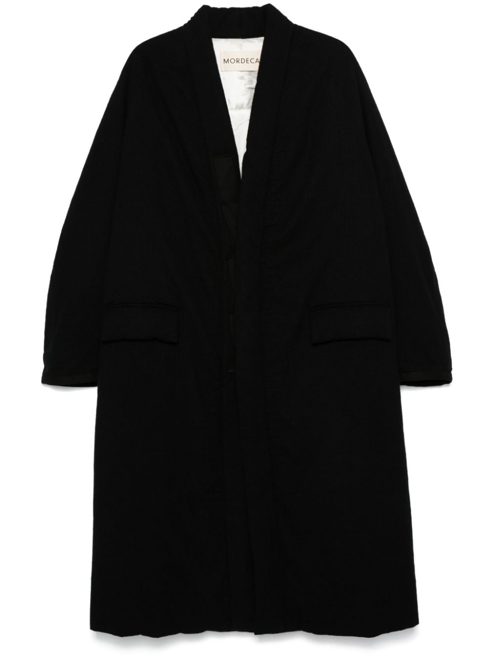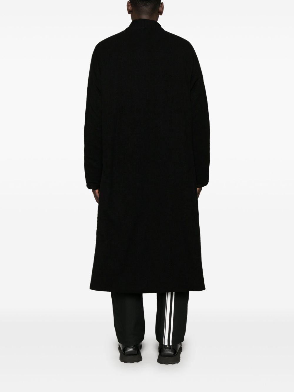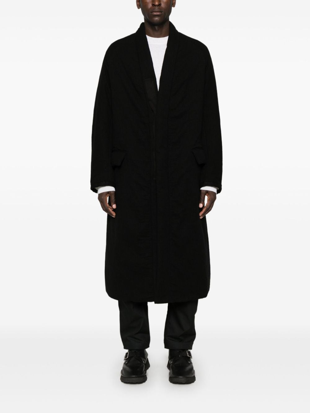 coat, synthetic padded, v-neck, closure with buttons sewn on grosgrain ribbon, side pockets with flaps, pakka raglan, long sleeve, lined, back vent, inside pocket with button