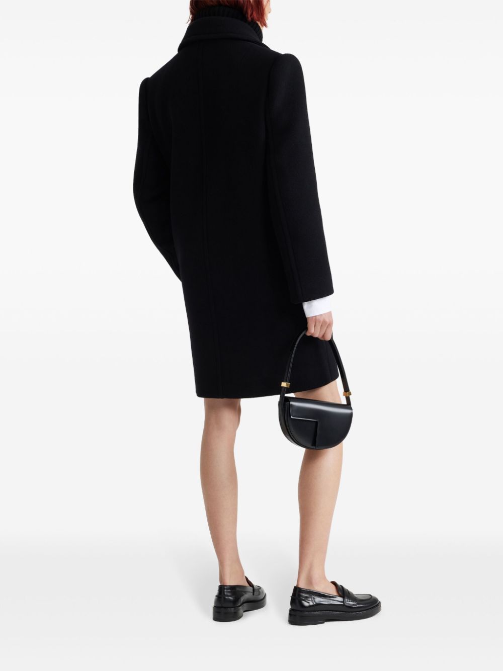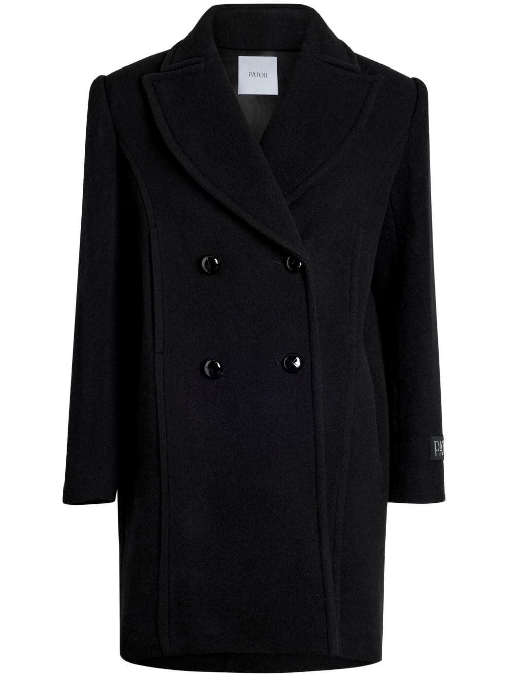 coat, double breasted, button closure, peak lapels, side welt pockets, fabric label with logo, lined