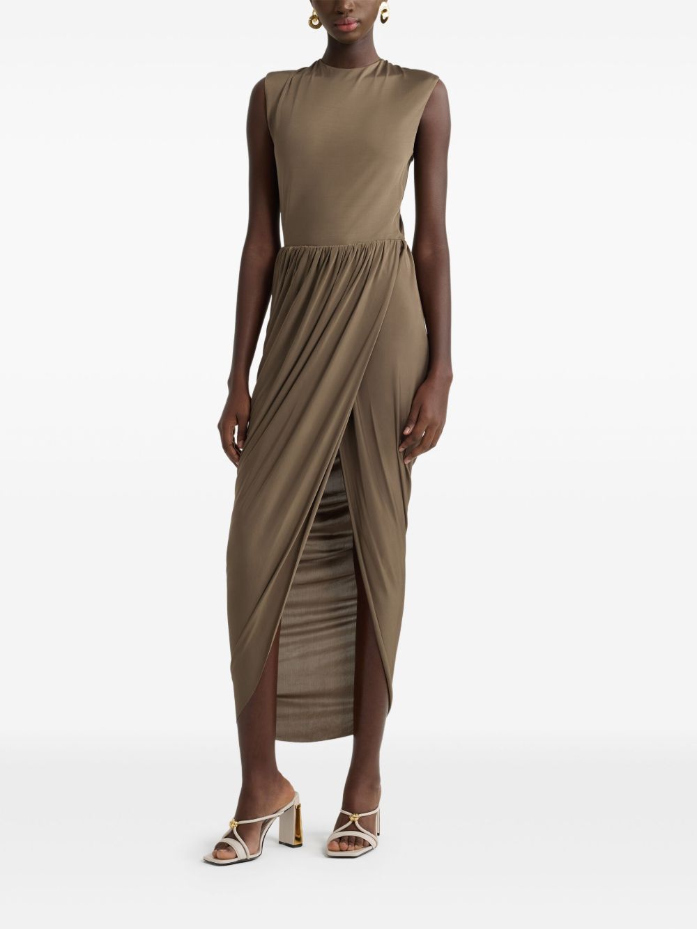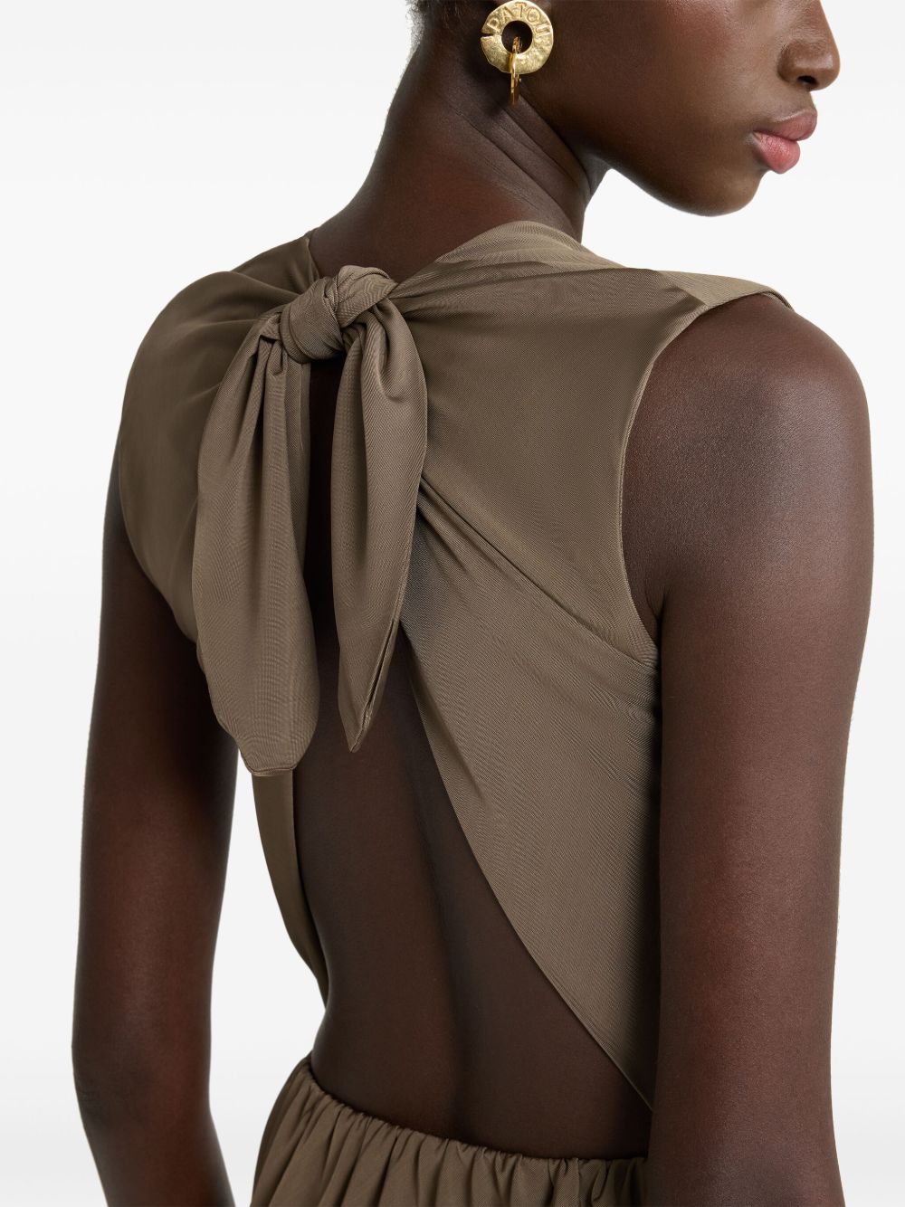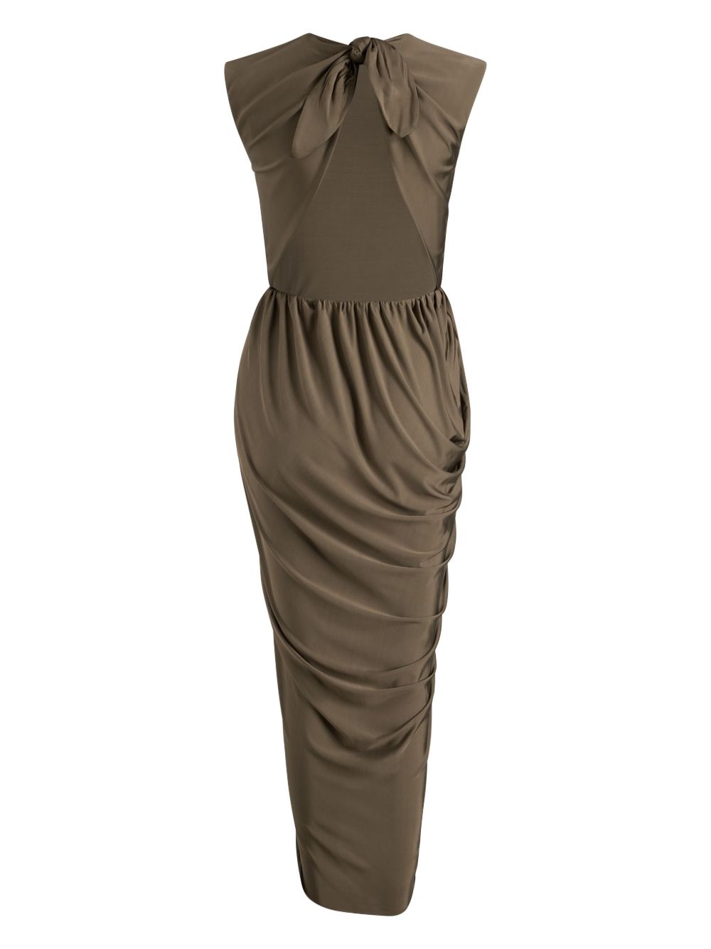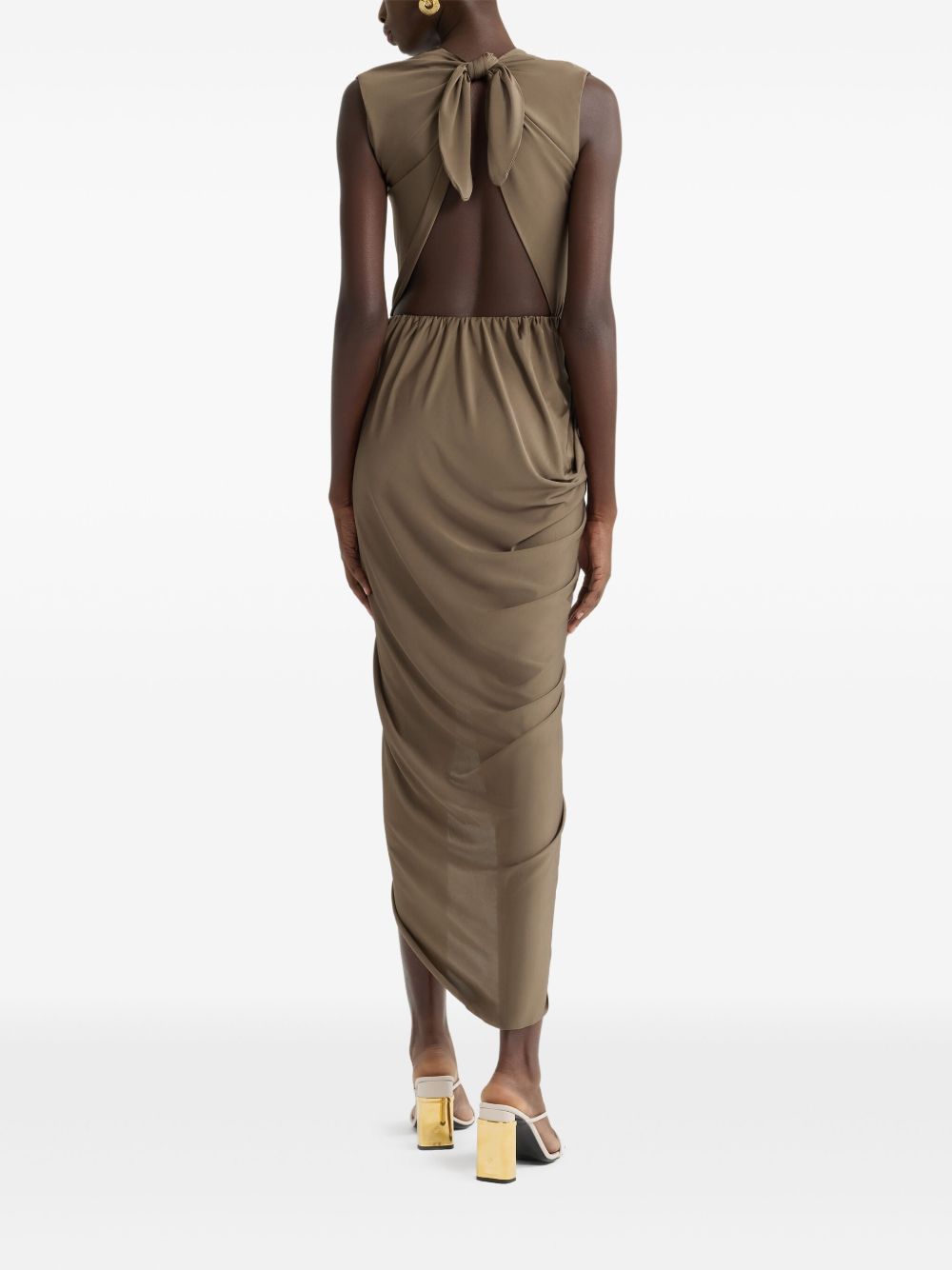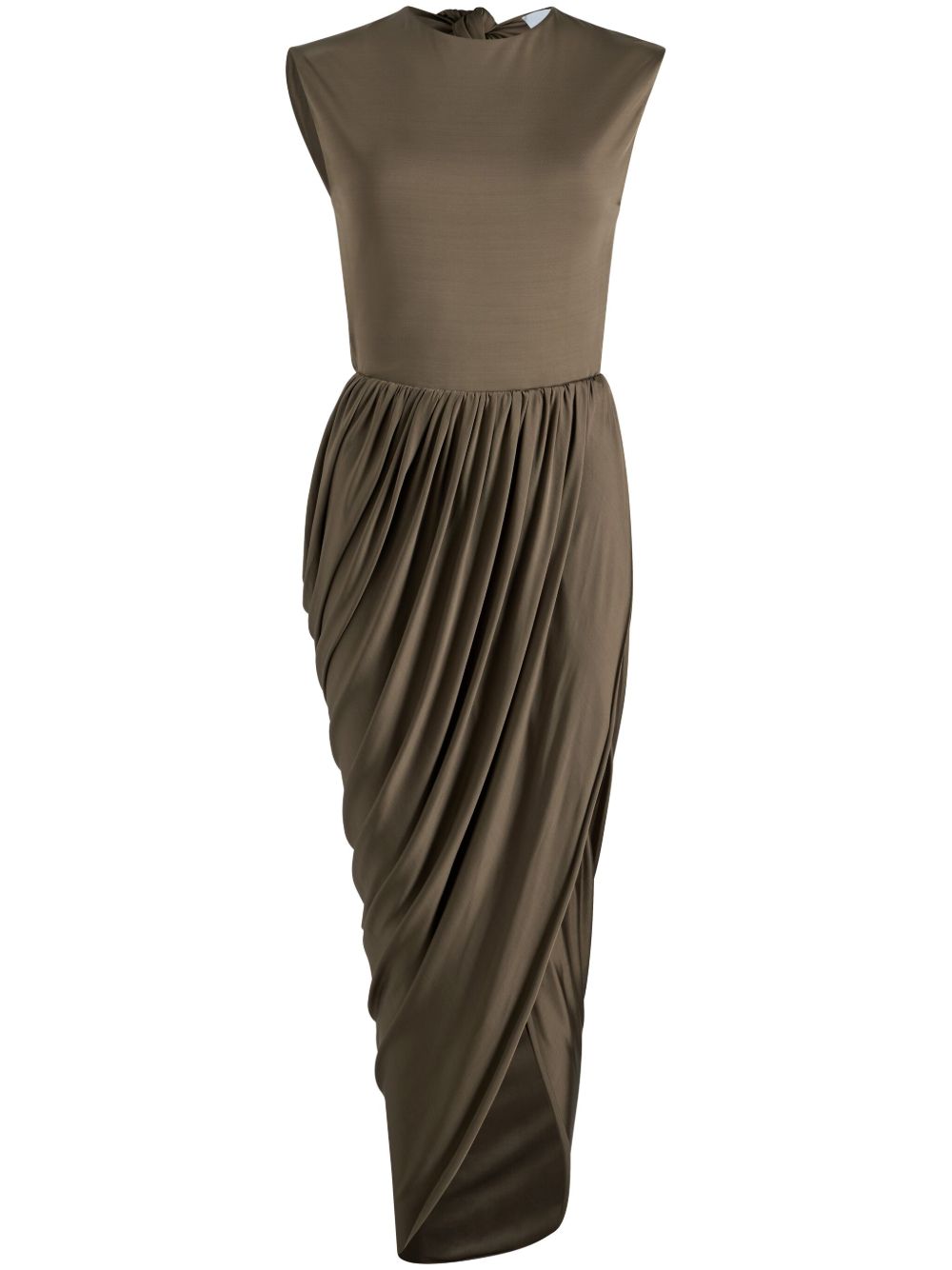 dress, jersey, crew neck, sleeveless, gathered waist, back tie closure, open back, elastic back waist, asymmetrical hem, front slitComposition: 94% rayon 6% elastaneCare instructions: dry clean
