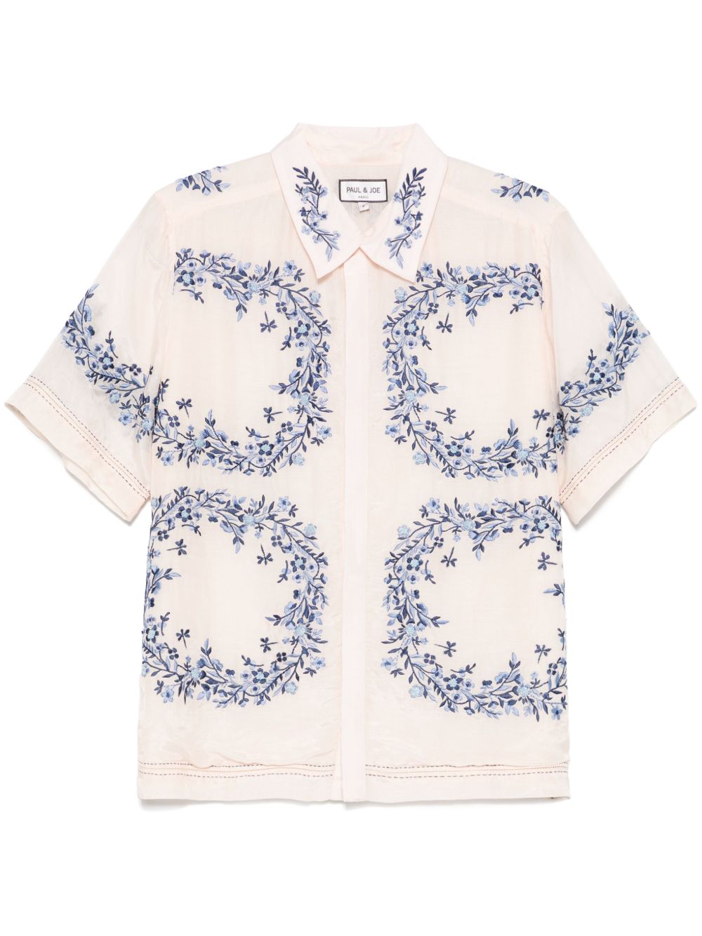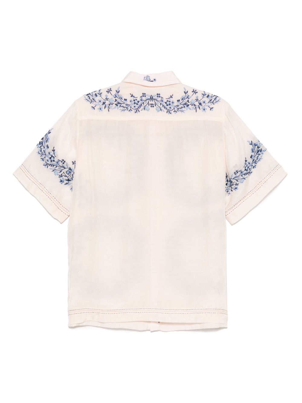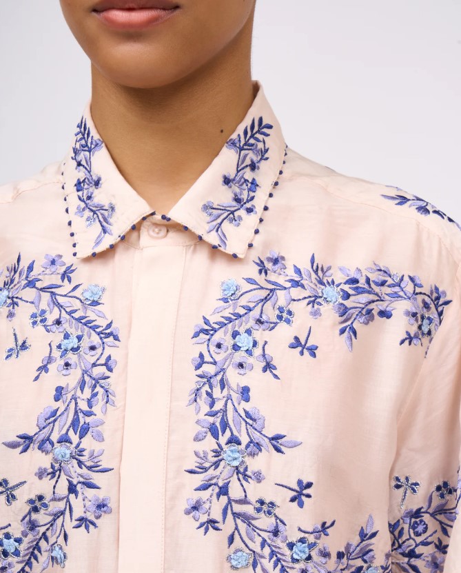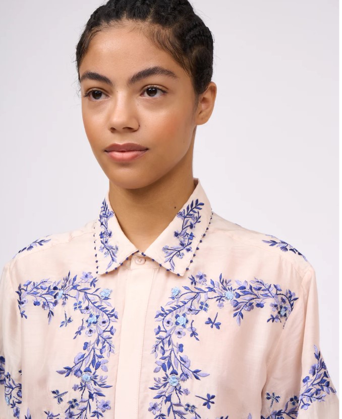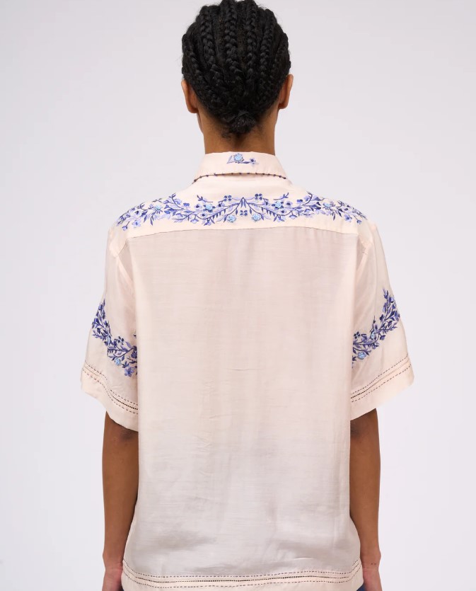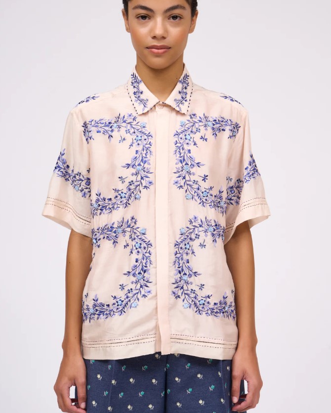 shirt, short sleeve, pointed collar, hidden button closure, hemstitched edges, contrasting floral embroideryComposition: 100% viscoseWashing instructions: machine wash