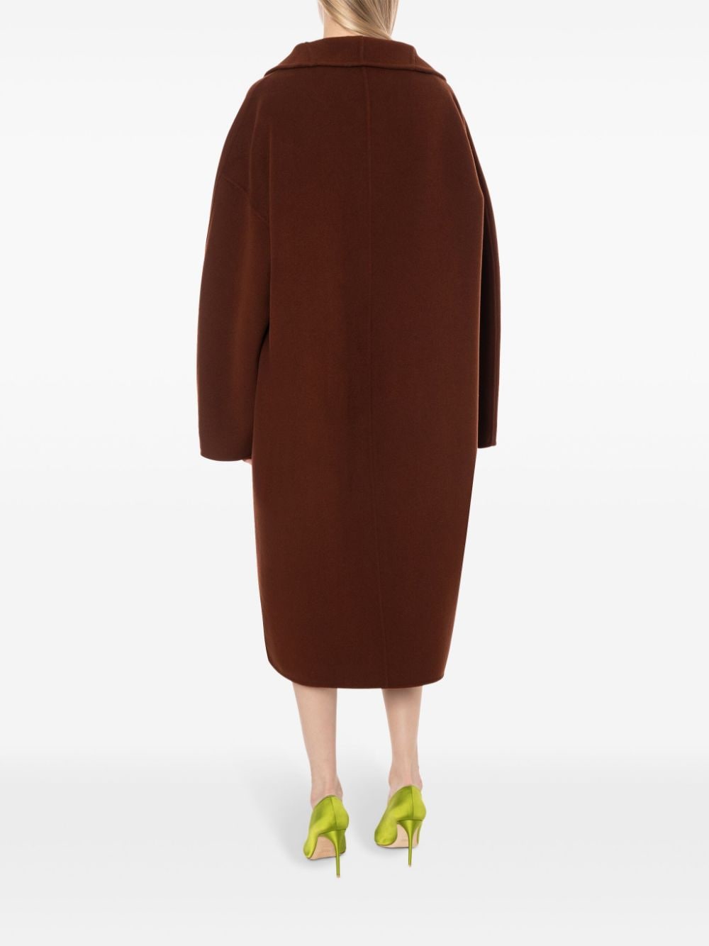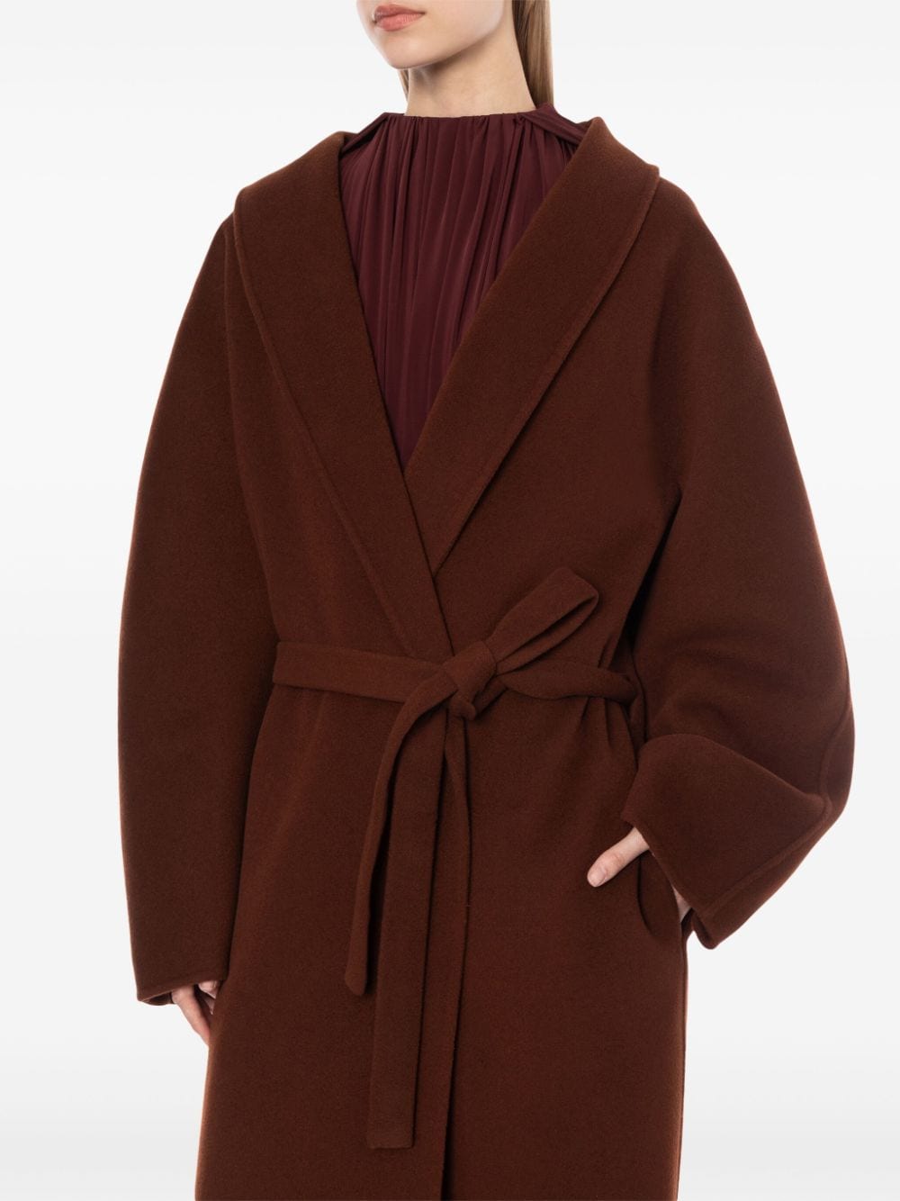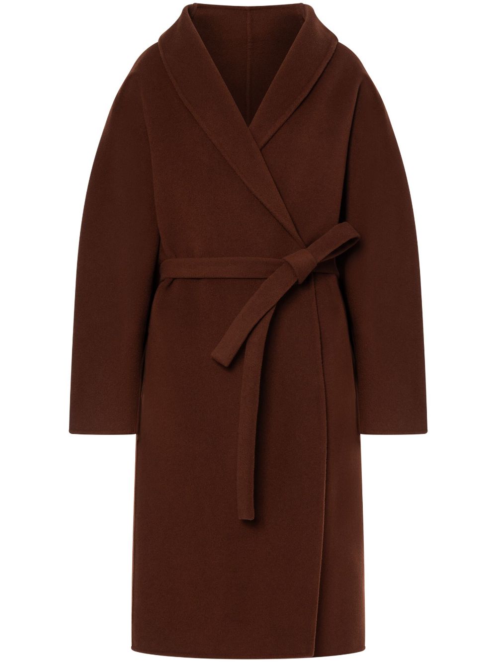 coat, double tailored, shawl collar, loose fit, detachable belt, no buttons, long sleeves, side pockets, no lining
