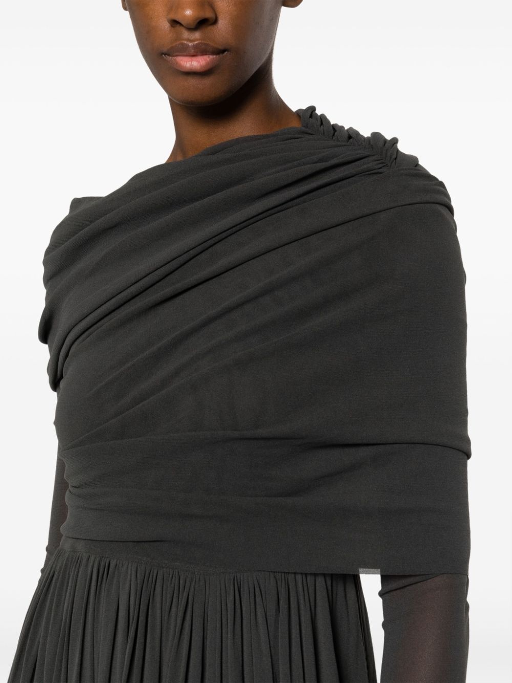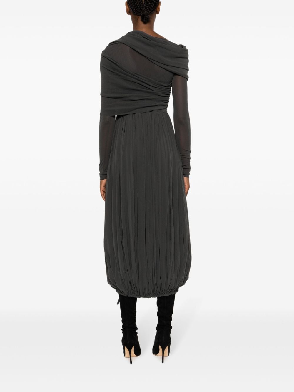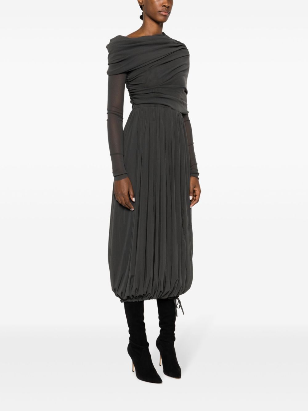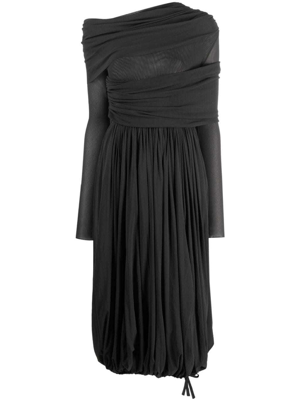dress, stretch tulle, crew neck, long sleeves, draping, balloon skirt, drawstring hem