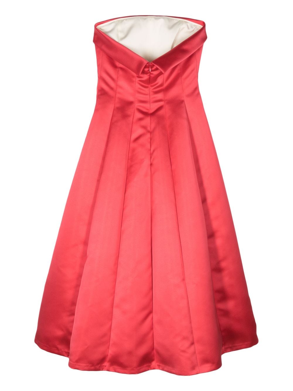 dress, satin, strapless, lapeled corset, side pockets, zip closure, flared hem