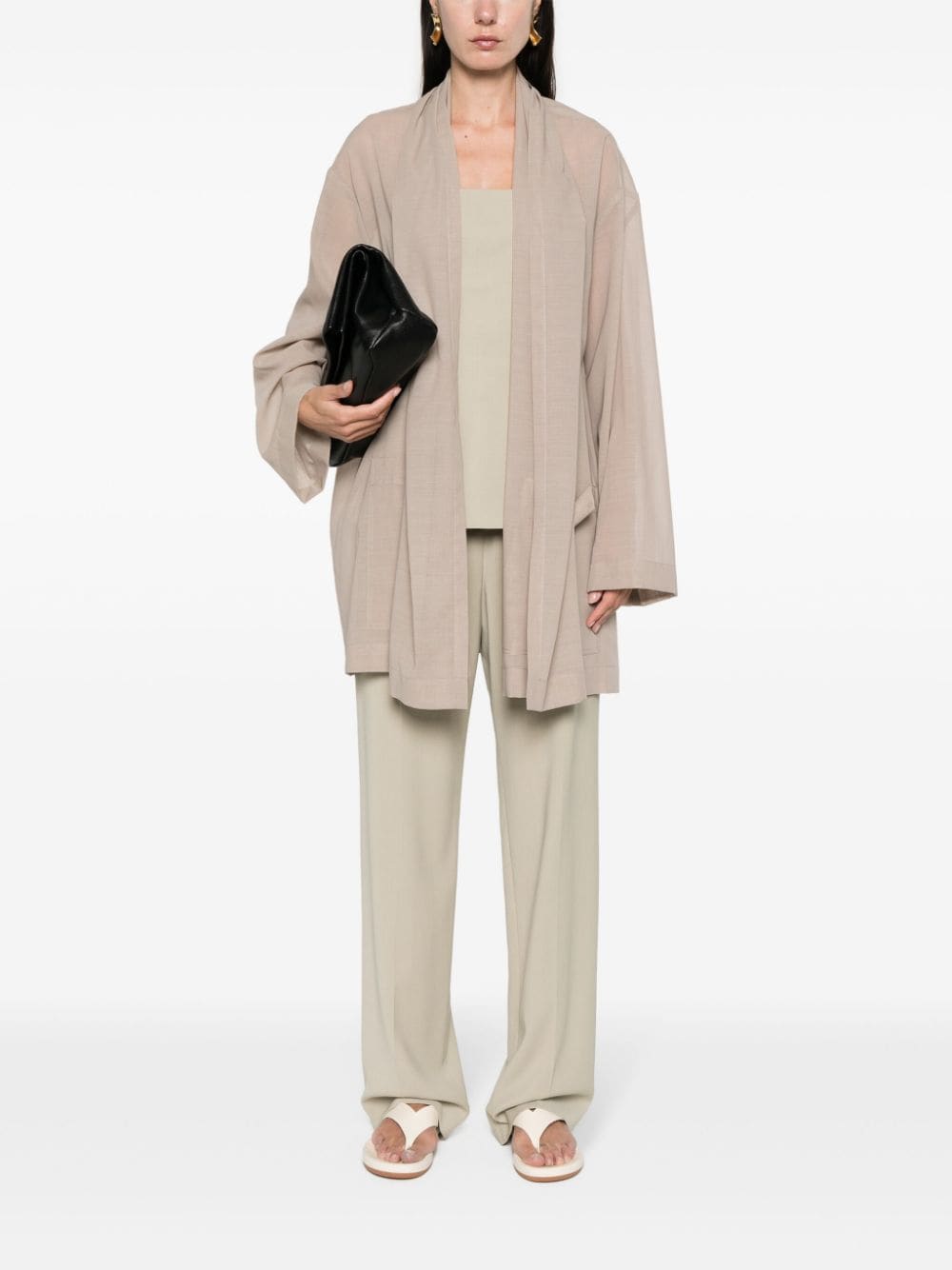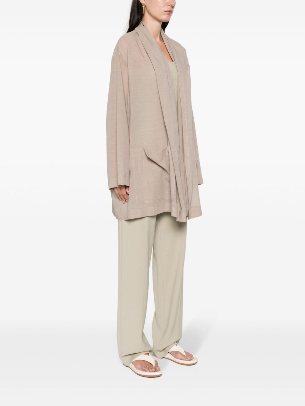 jacket, loose fit, wide long sleeves, shawl collar, no buttons, no lining, semi-transparent fabric, patch pockets