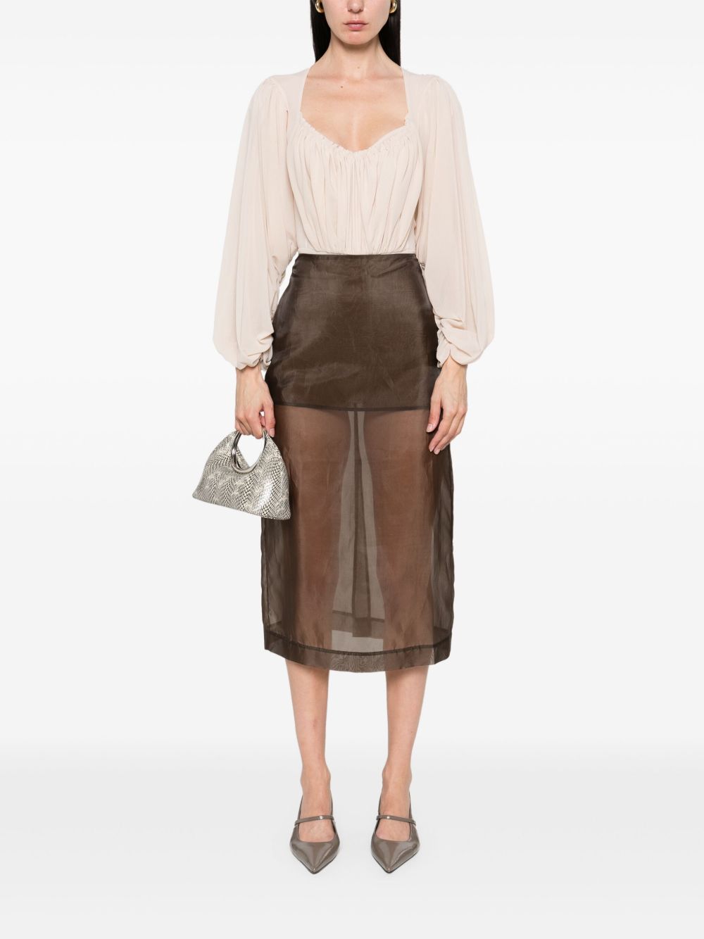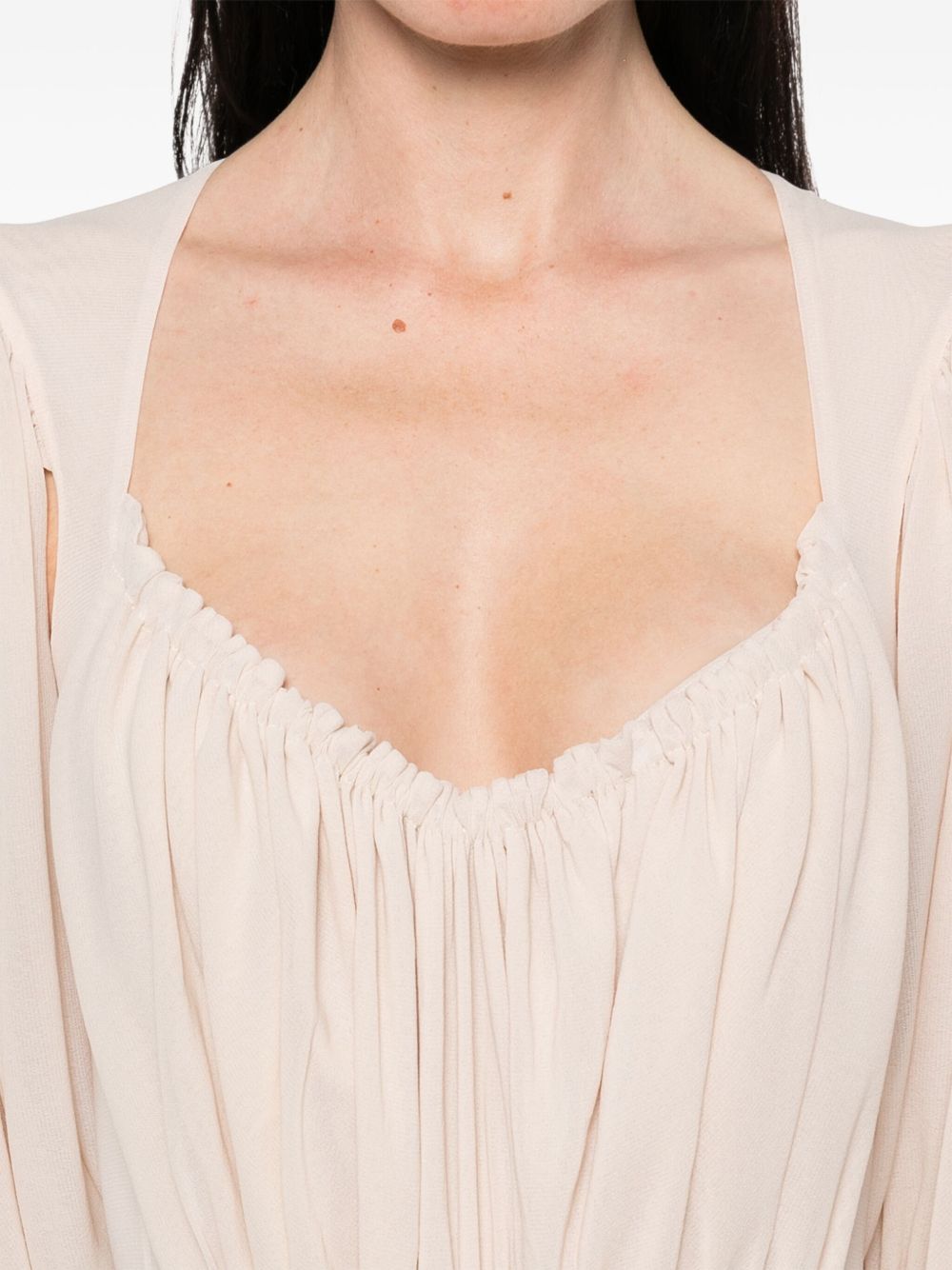 top body, stretch tulle, v-neck, wide sleeve with narrow bottom, draped front with elasticated edge, hook and eye closure at the bottom, semi-linedComposition: 100% polyamideWashing instructions: hand wash