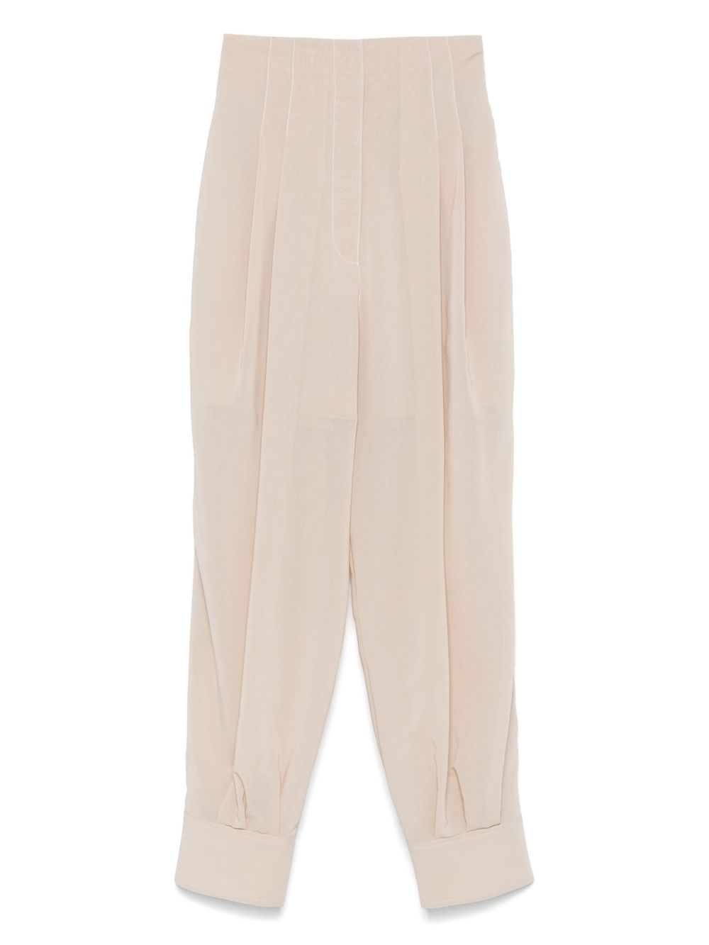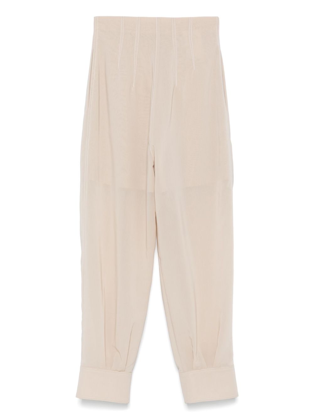 trousers, high waist, pleats, hook and zip fastening, side pockets, wide leg, semi-lined, semi-transparent, bottom with pleats narrowed by cuff Composition: 51% polyester, 49% cotton Washing instructions: dry clean