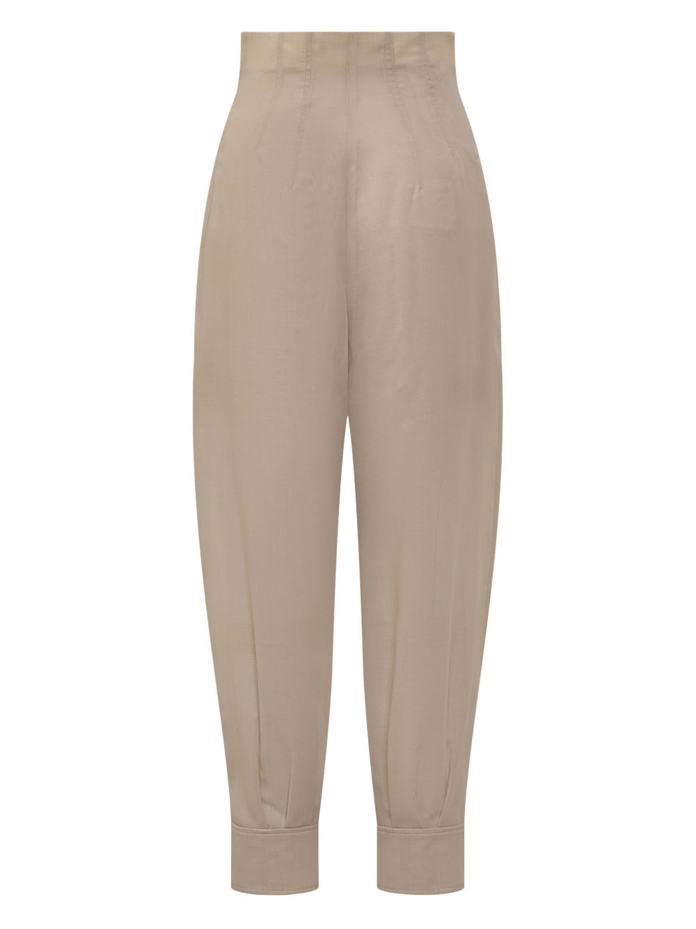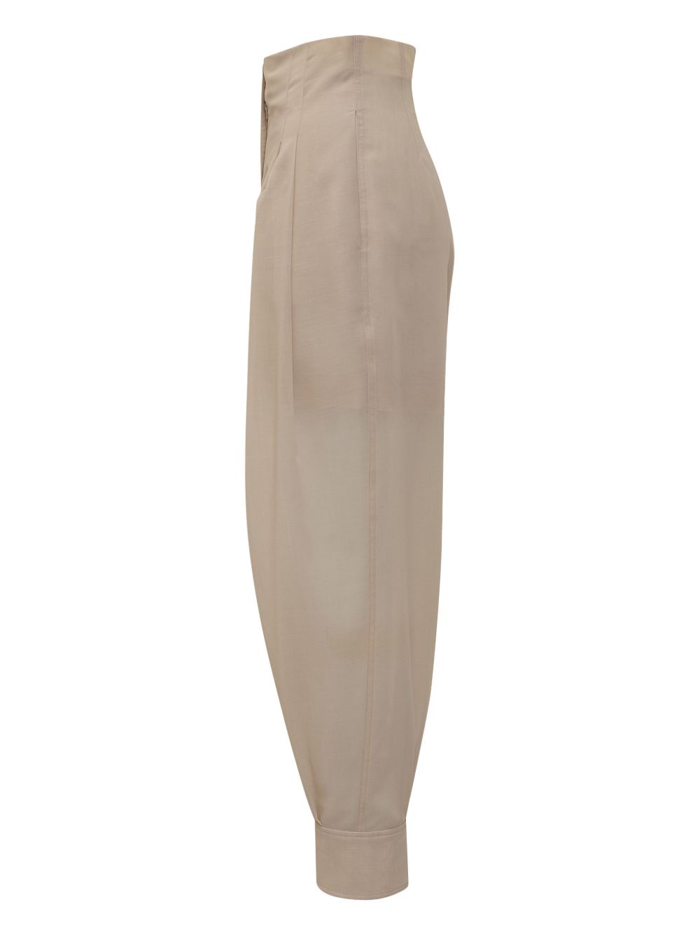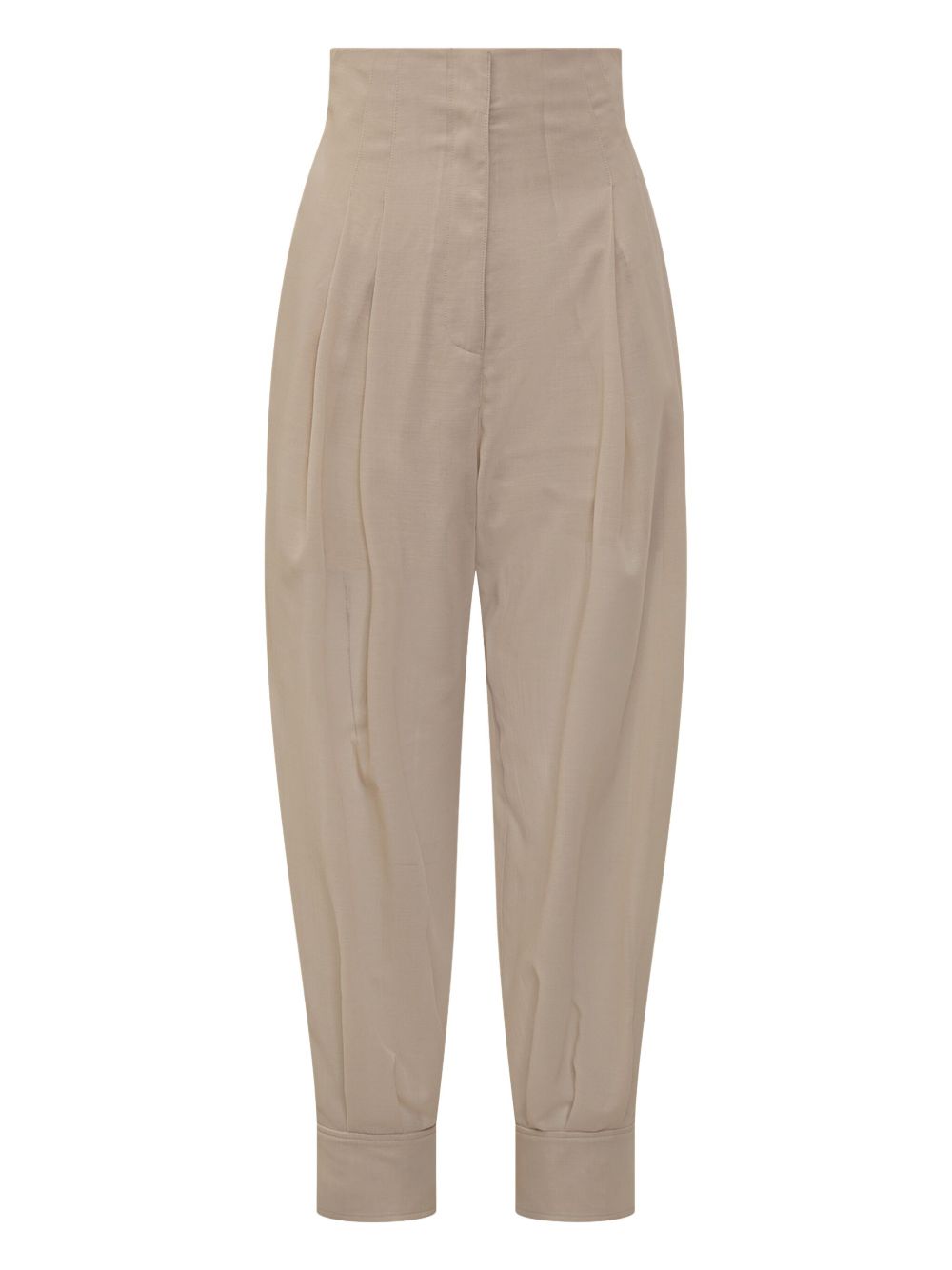 trousers, high waist, pleats, hook and zip fastening, side pockets, wide leg, semi-lined, semi-transparent, bottom with pleats narrowed by cuff Composition: 77% wool, 23% polyester Washing instructions: hand wash