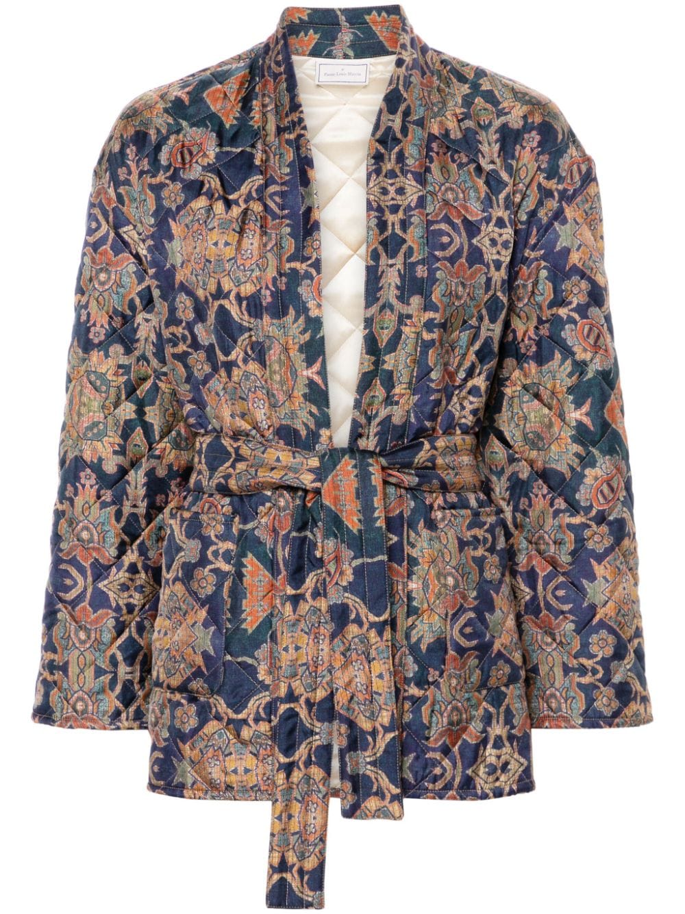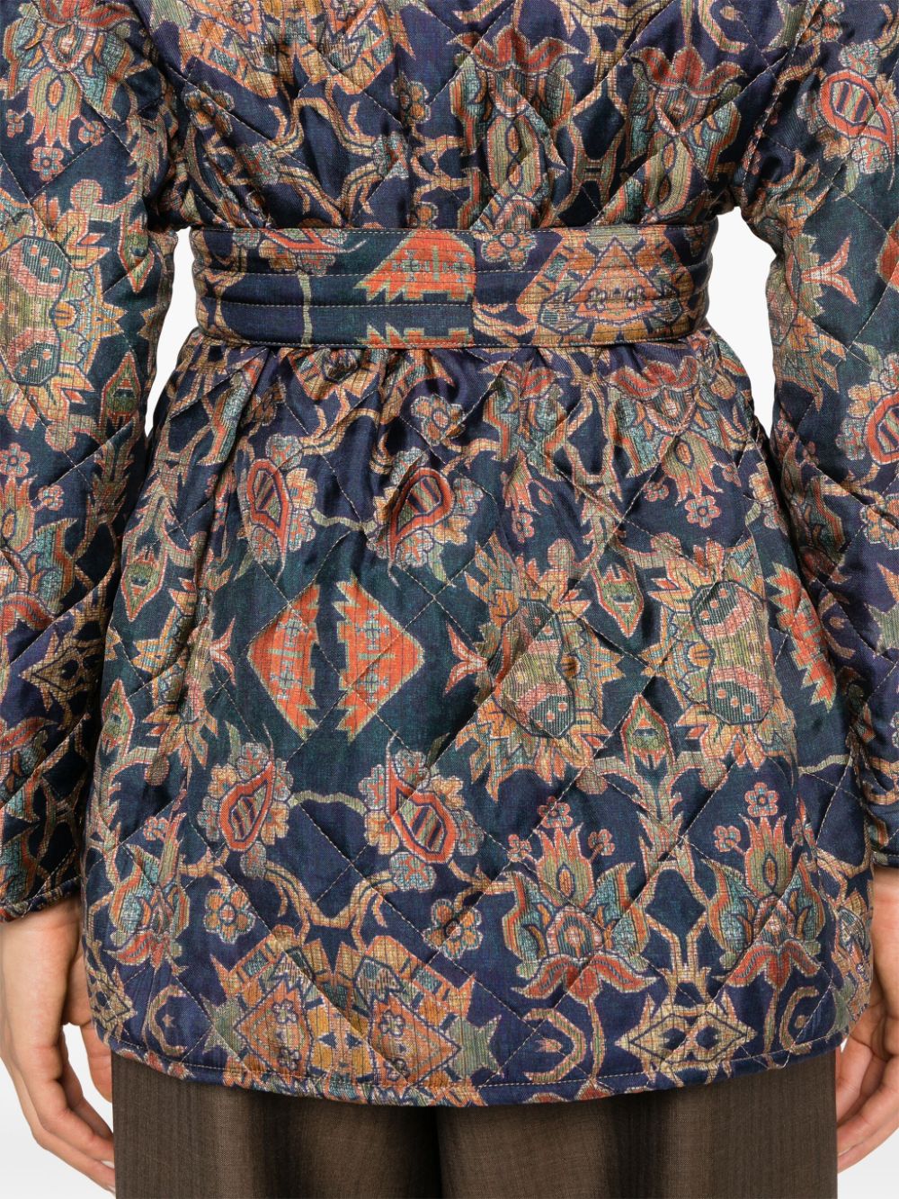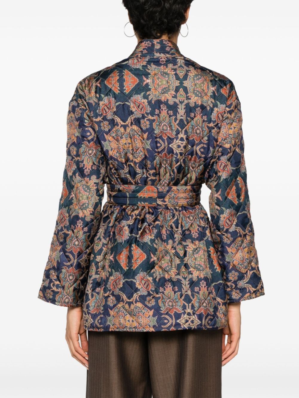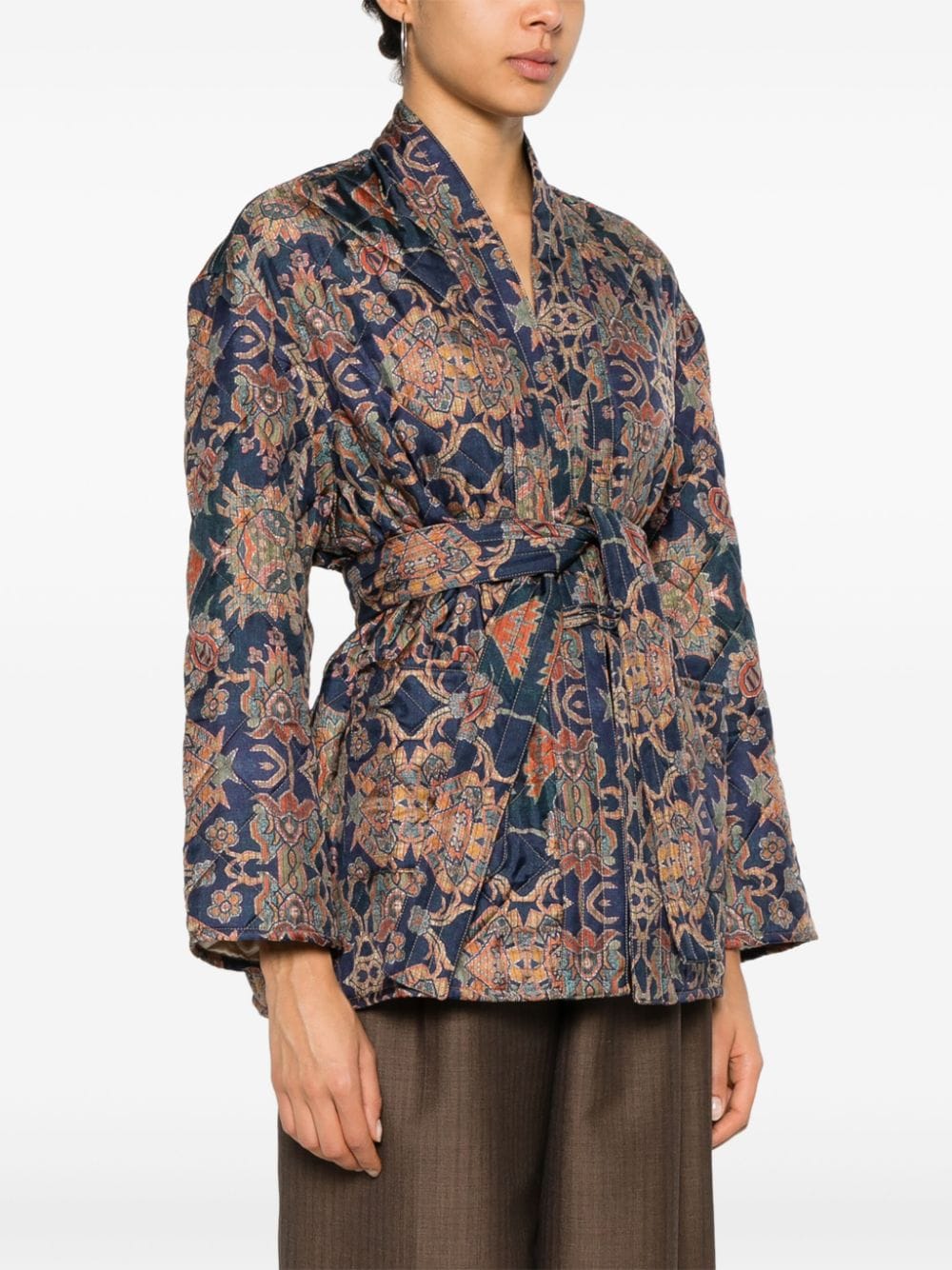 kimono jacket, removable belt, quilted fabric, all-over pattern, patch pockets, fabric button closure