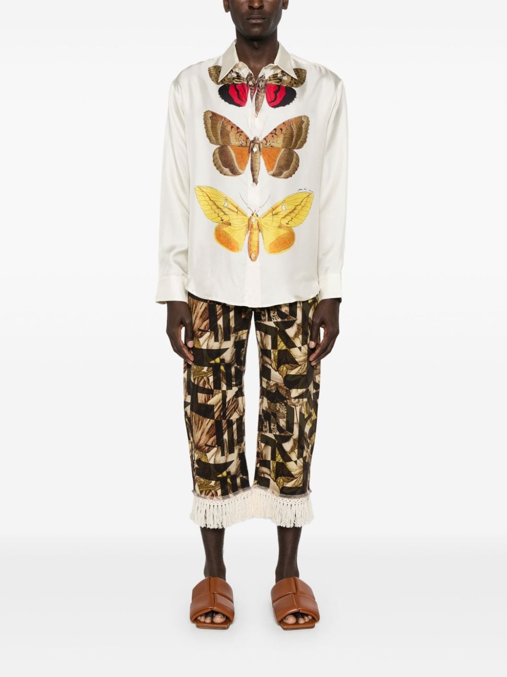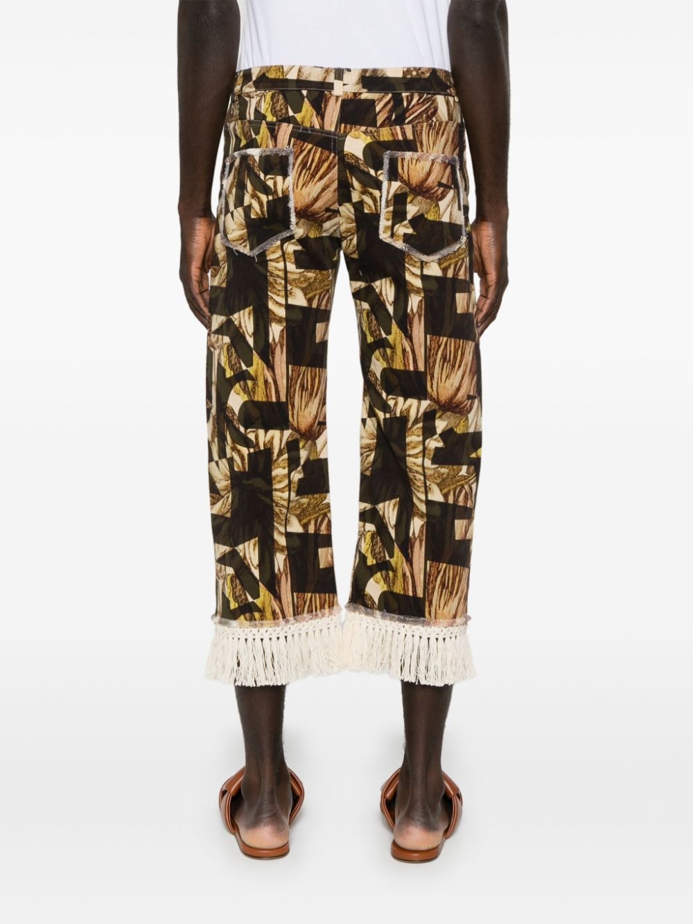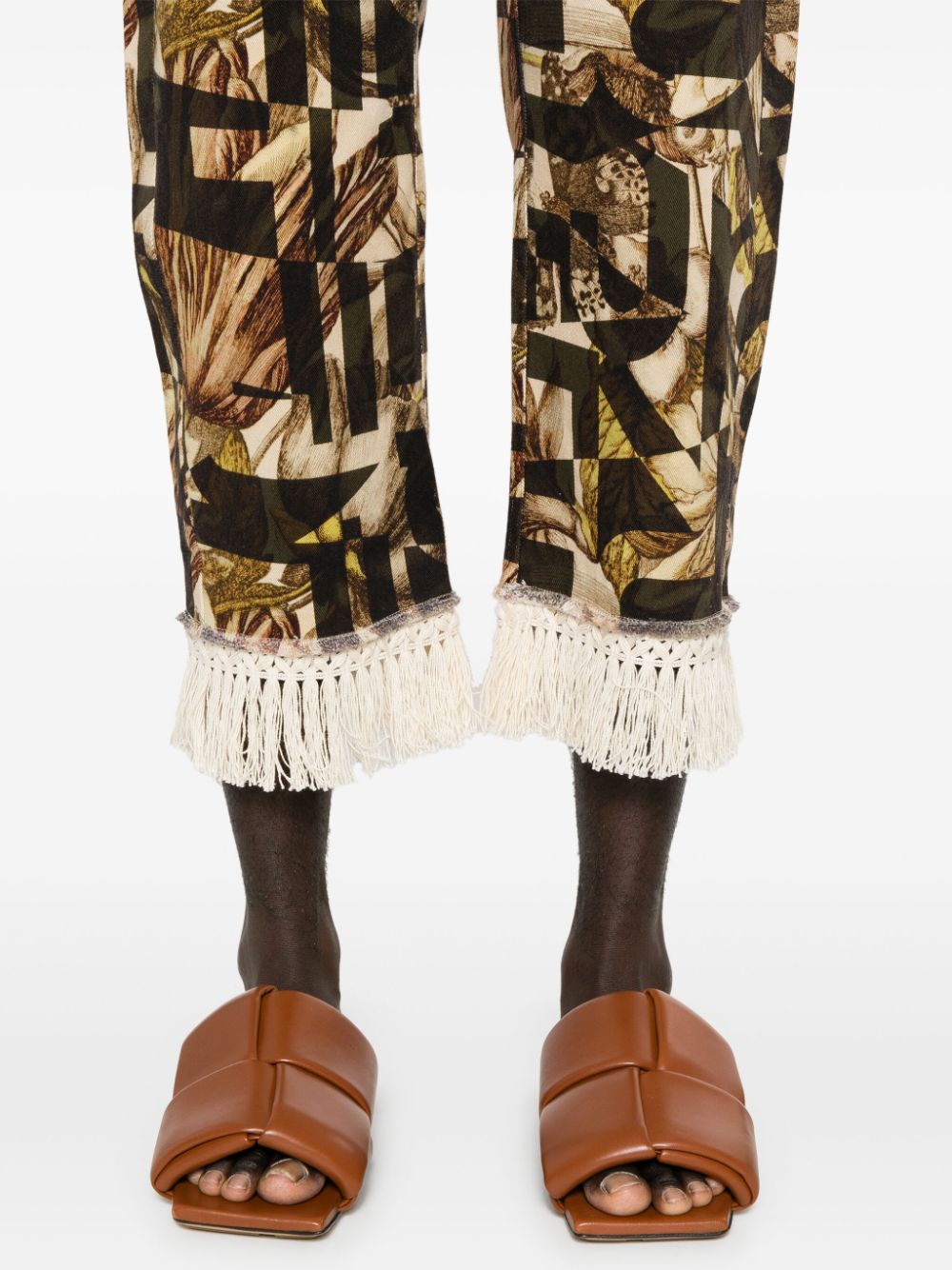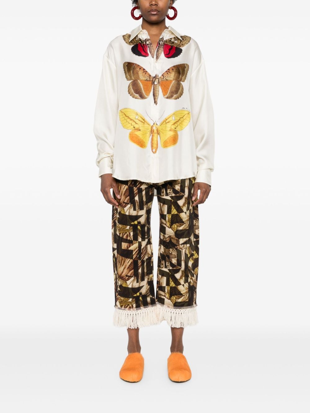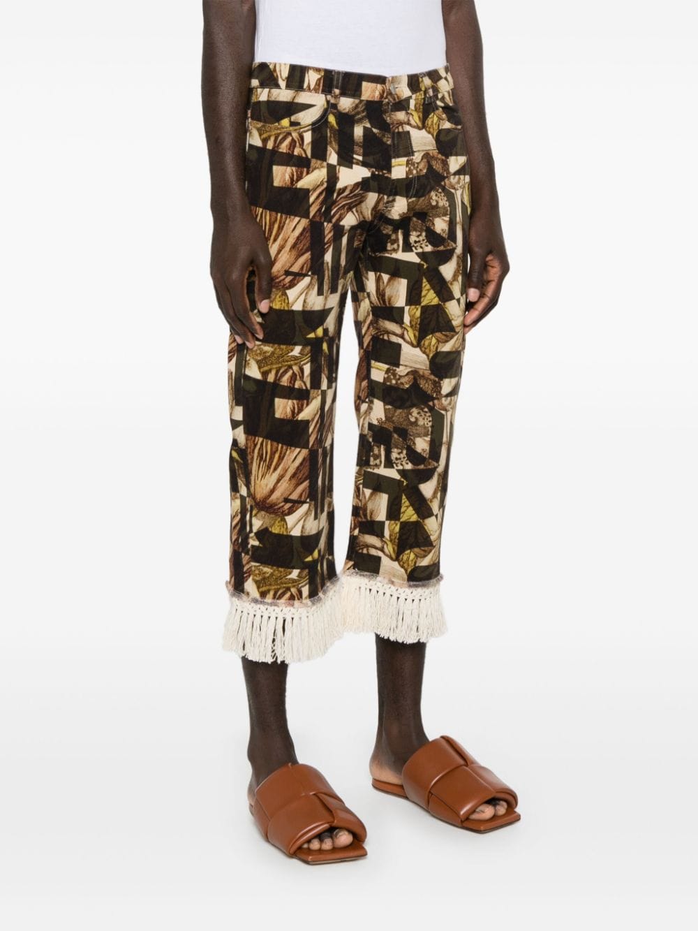 crop pants, stretch fabric, geometric pattern with butterflies, bottom with hand-tied fringes, button and zip closure, belt loops, side pockets, fringed patch pockets on the back.Composition: 98% cotton 2% elastaneWashing instructions: dry clean