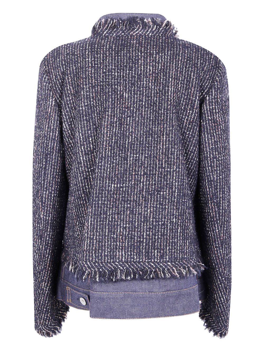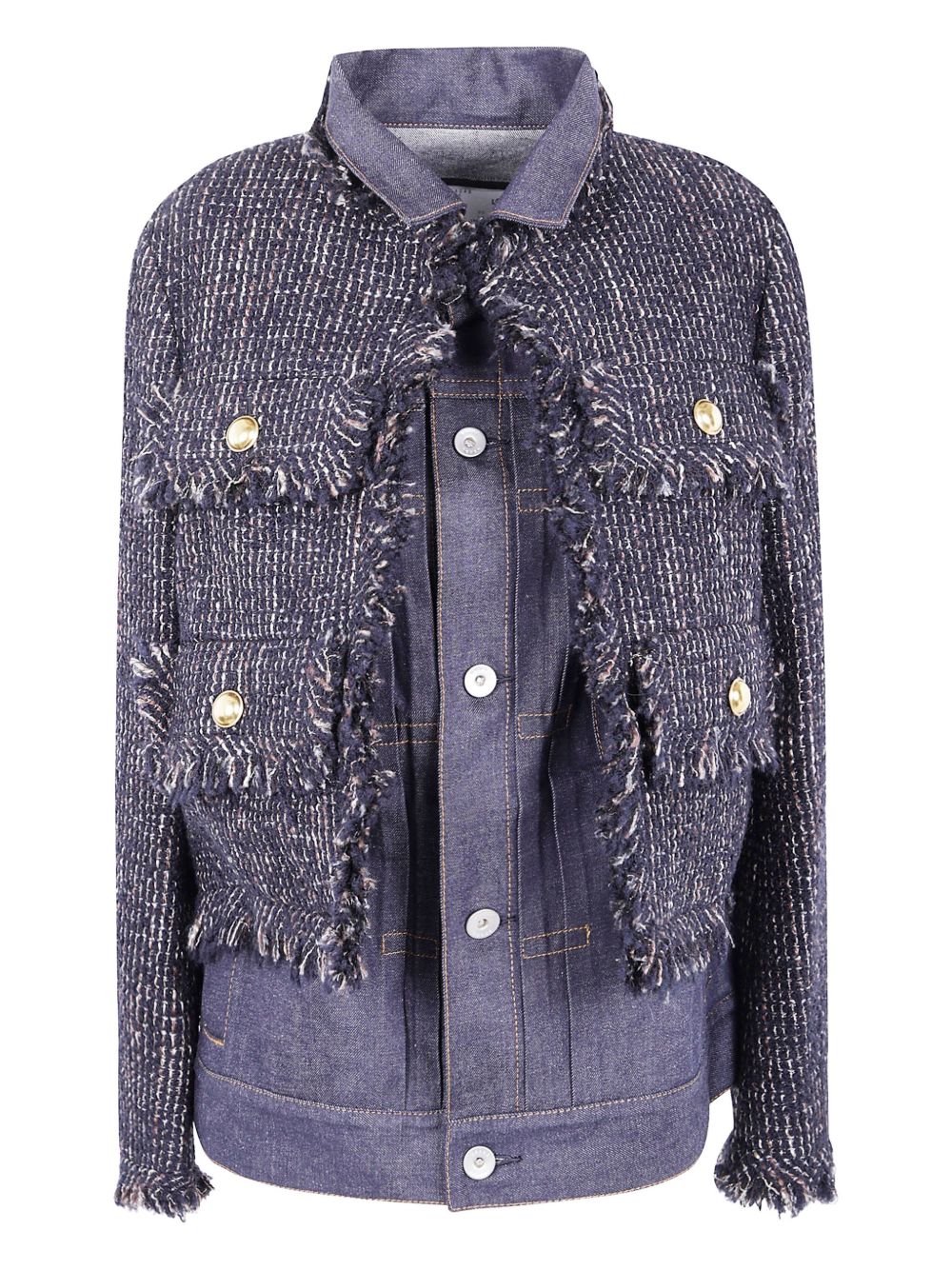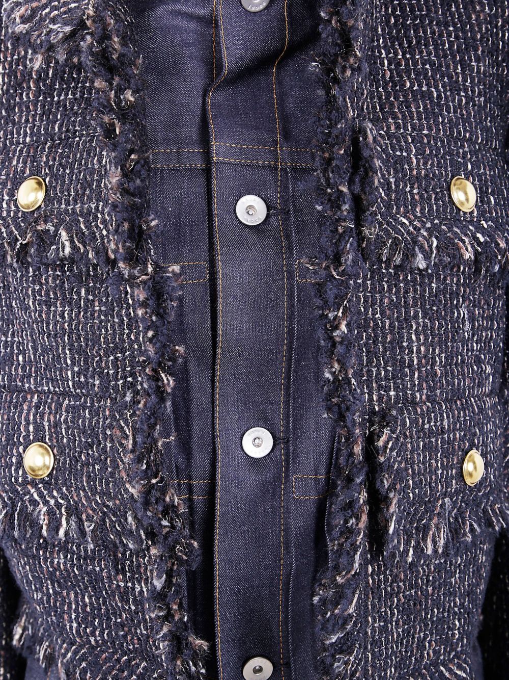 Jacket, tweed and denim, metal button closure on denim, double-jacket effect, chest and side pockets with flaps and gold buttons, frayed edges, long sleeves, flared hem