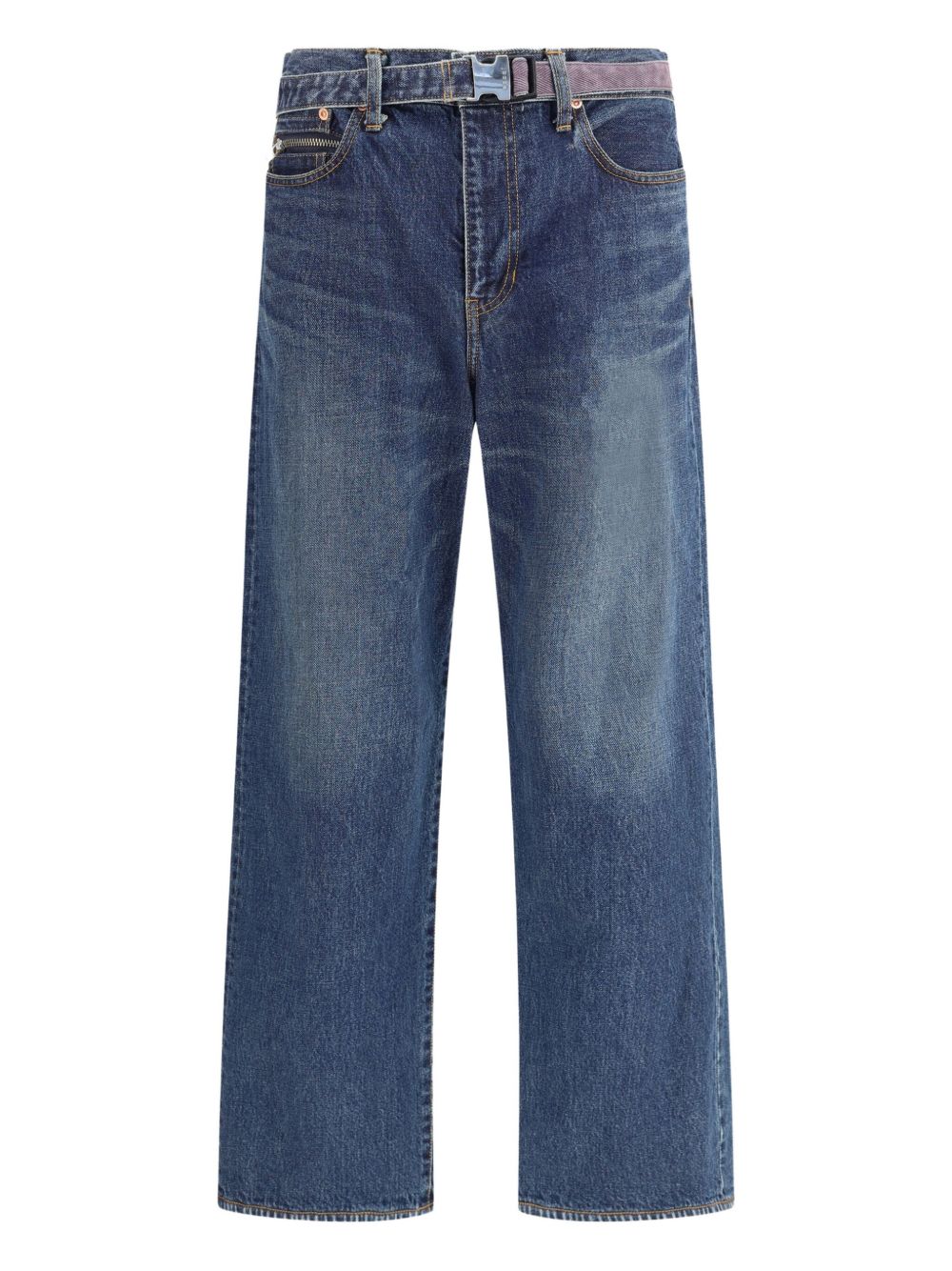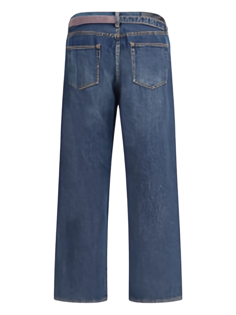 Pants, washed denim, belt loops, removable belt with hook closure, button and zip closure, rounded side pockets, side zip pocket, back patch pockets, wide leg