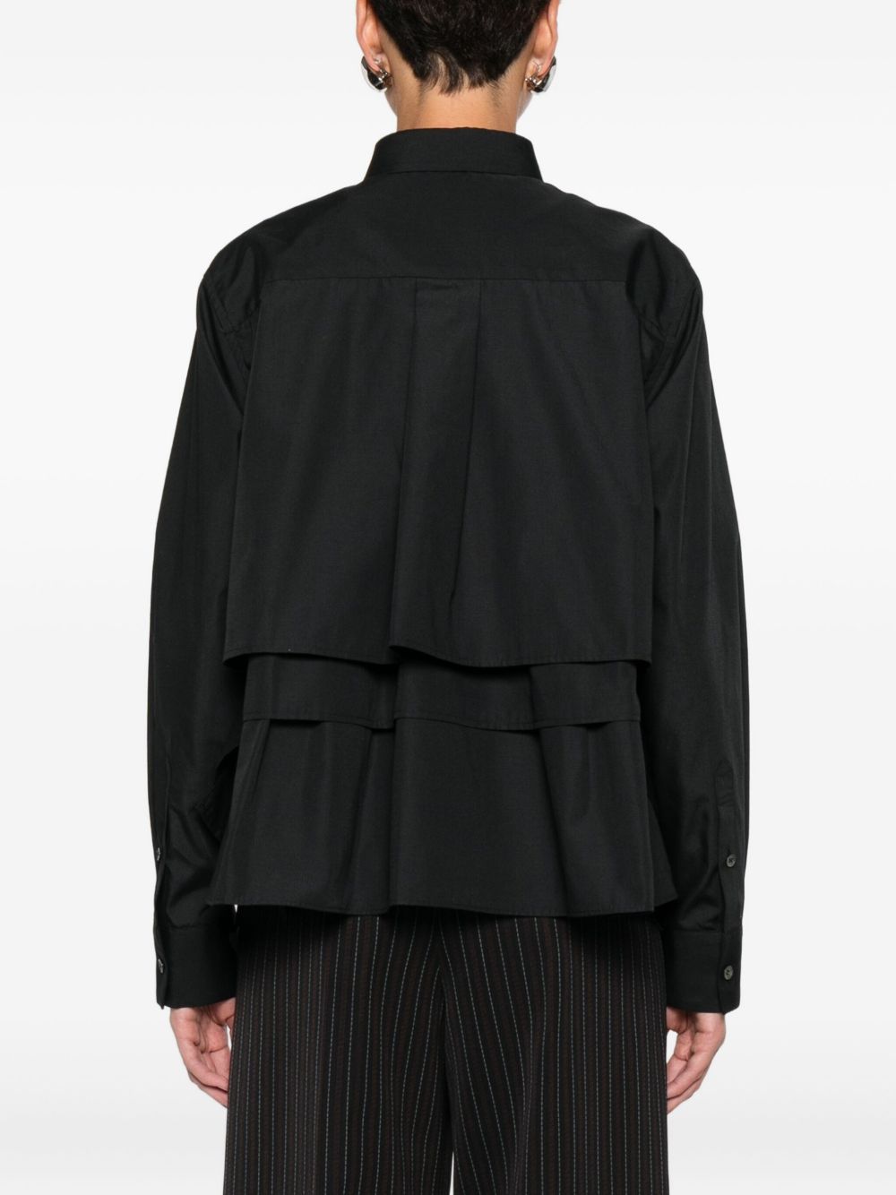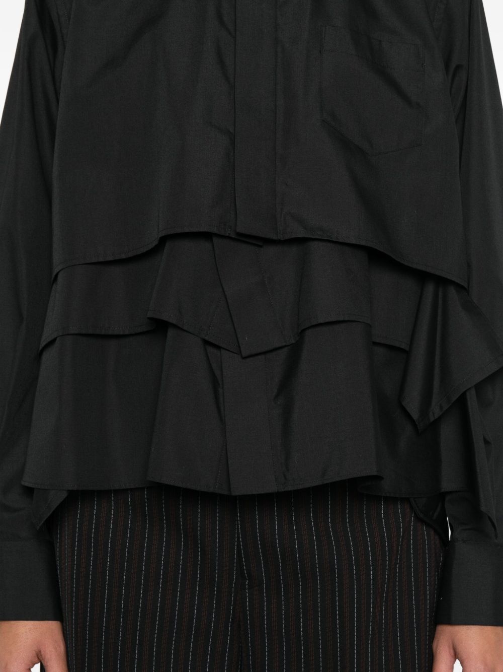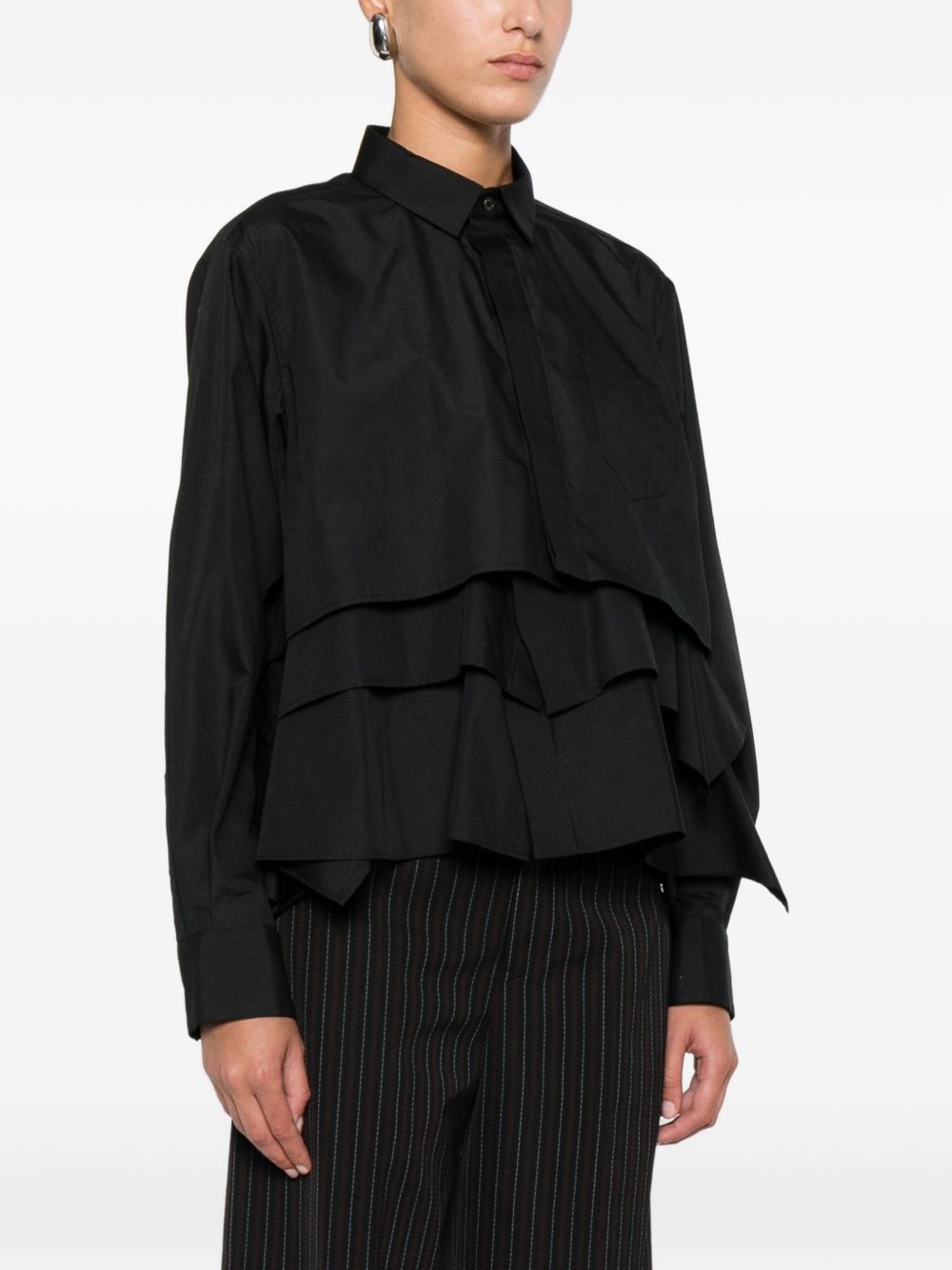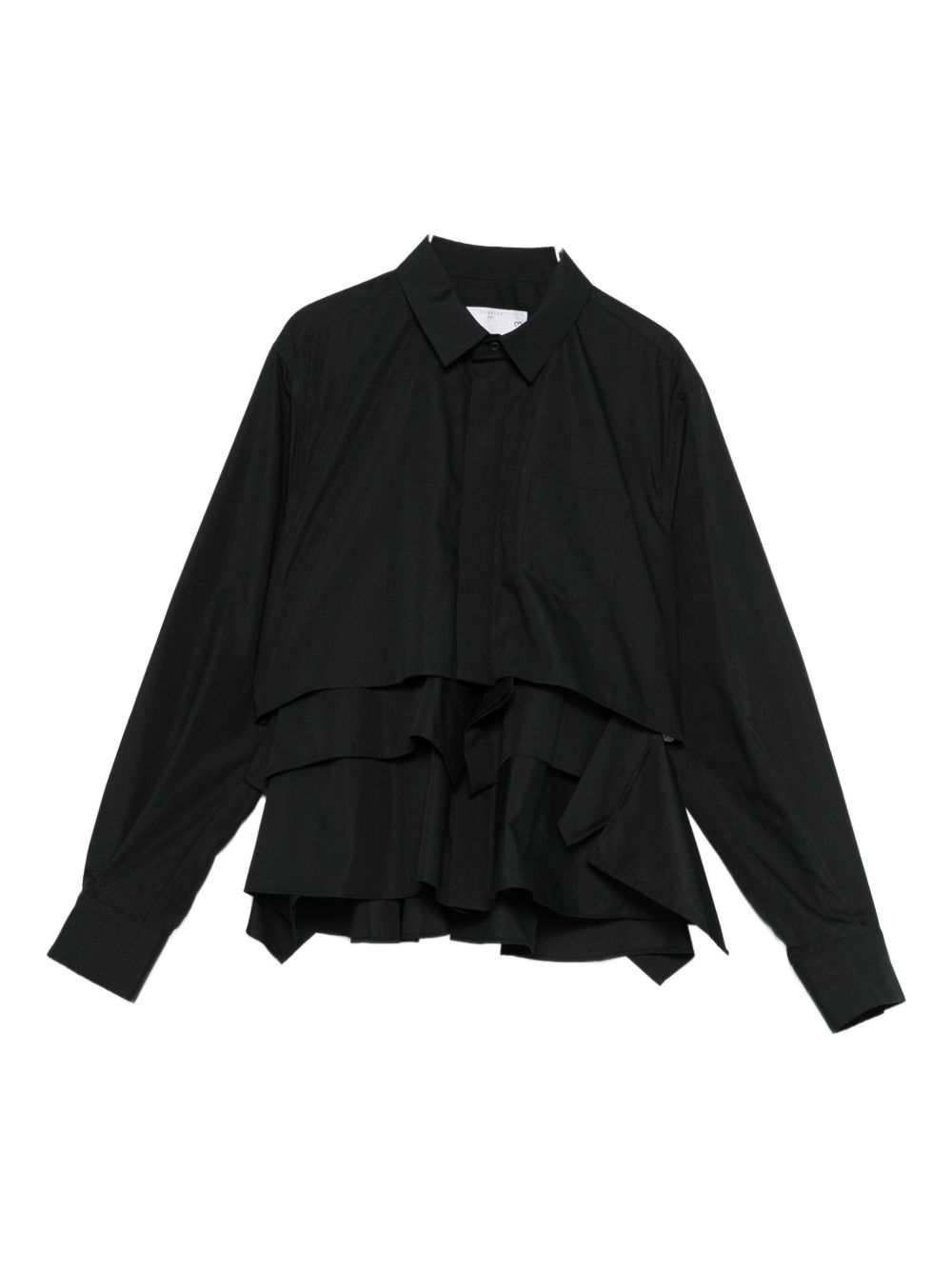 Shirt, point collar, concealed button closure, side pocket, long sleeves, buttoned cuffs, layered and flared hem