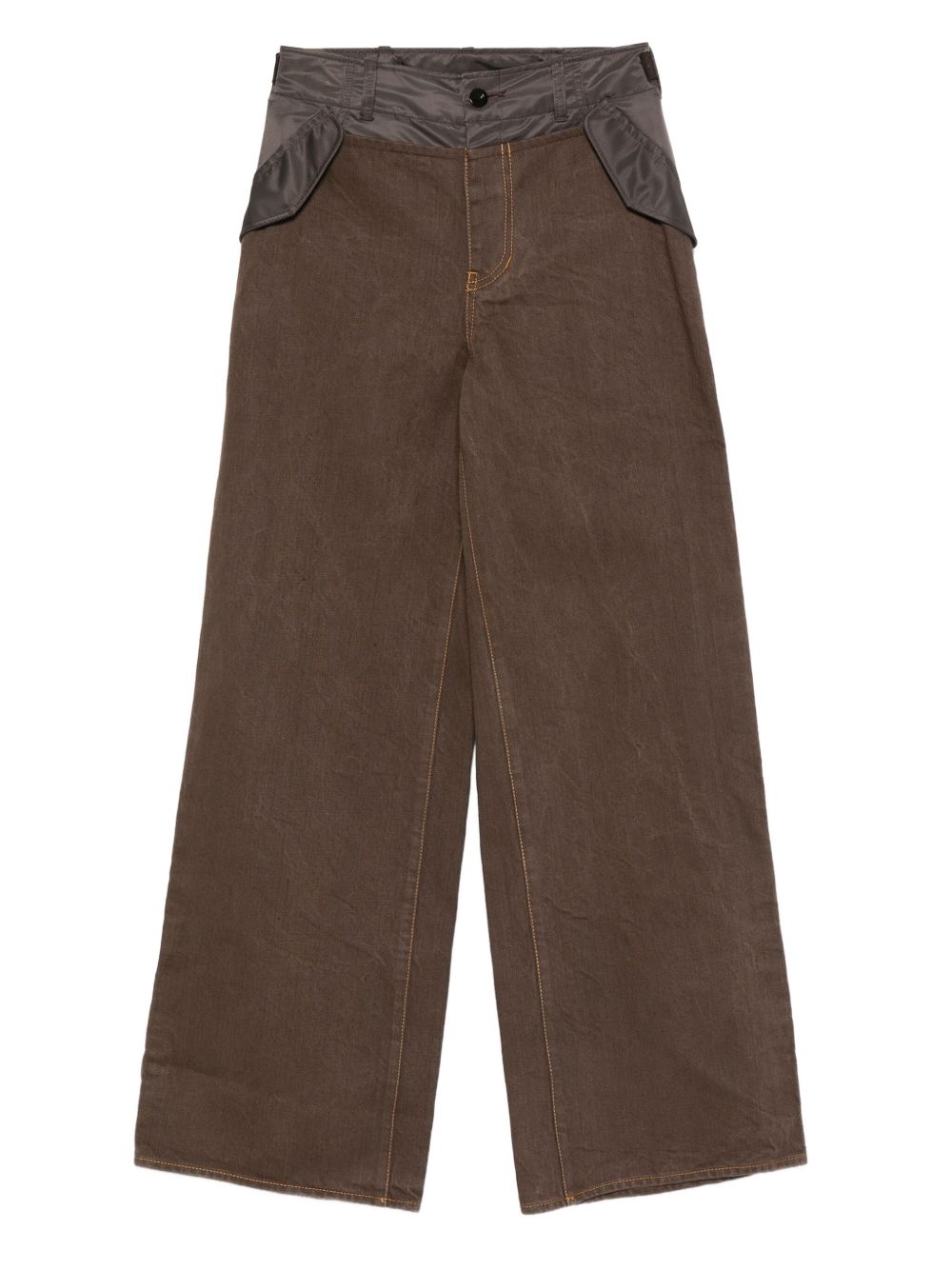 Denim and nylon trousers, wide leg, button and zip closure, adjustable side straps, side pockets with flaps and snaps, back patch pockets