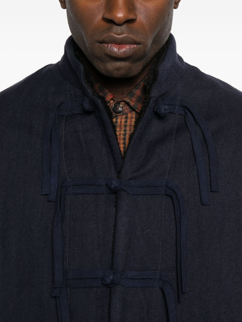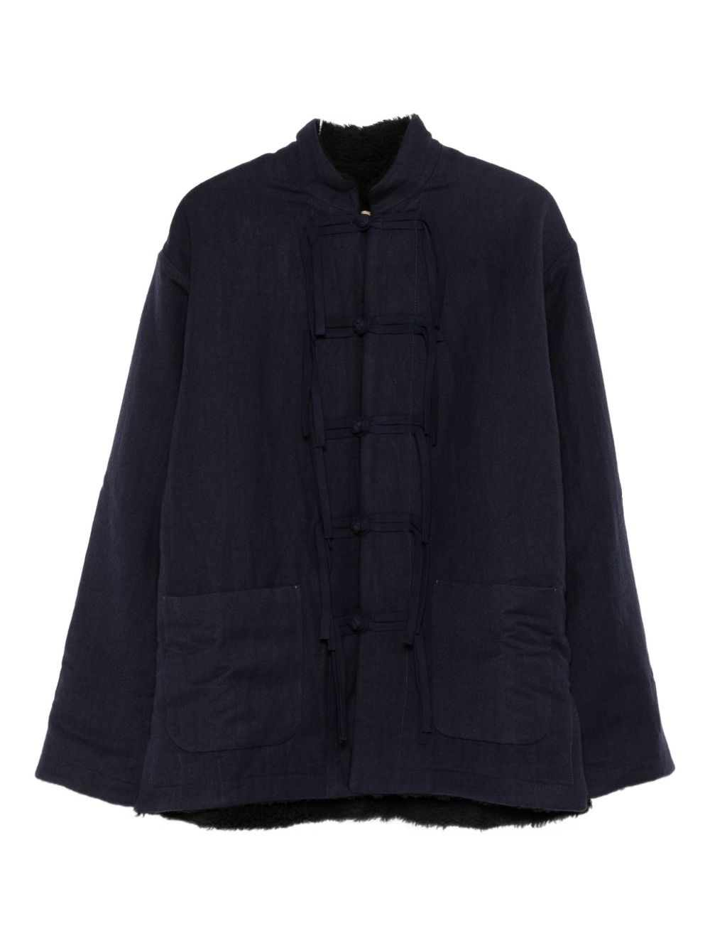 Mandarin-style jacket, fabric button and toggle closure, side patch pockets, loose fit, faux fur lining, long sleeves, side slits