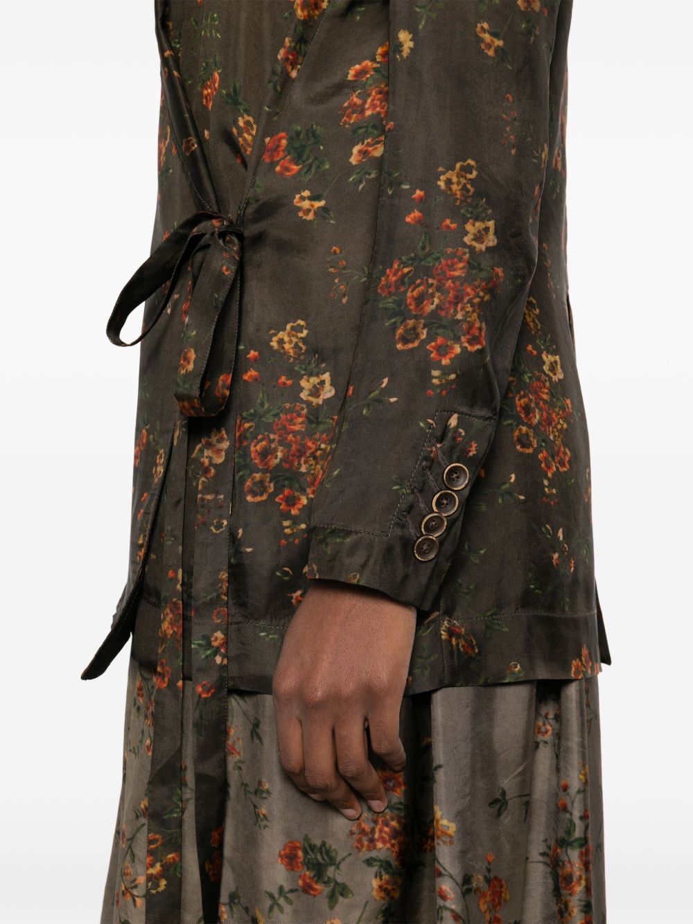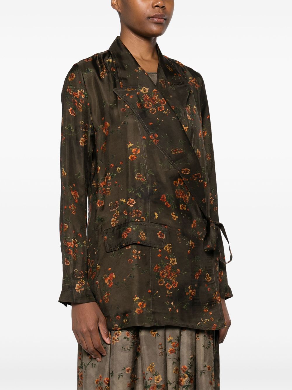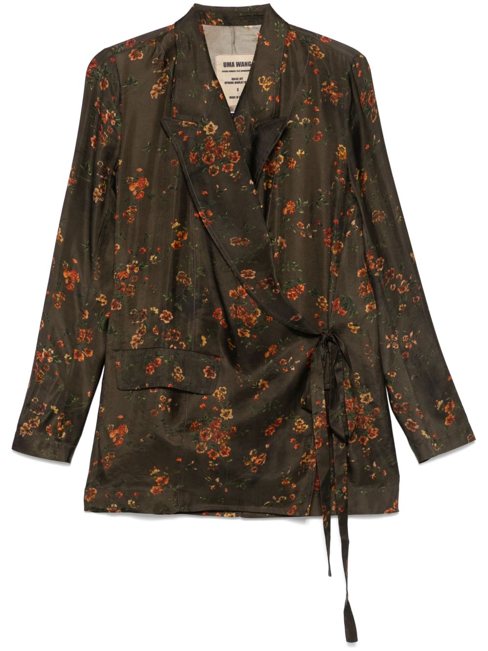 jacket, flowered fabric, peak lapels, side knot closure, flap pockets, long sleeves, buttoned cuffs and open buttonholes, rear vent