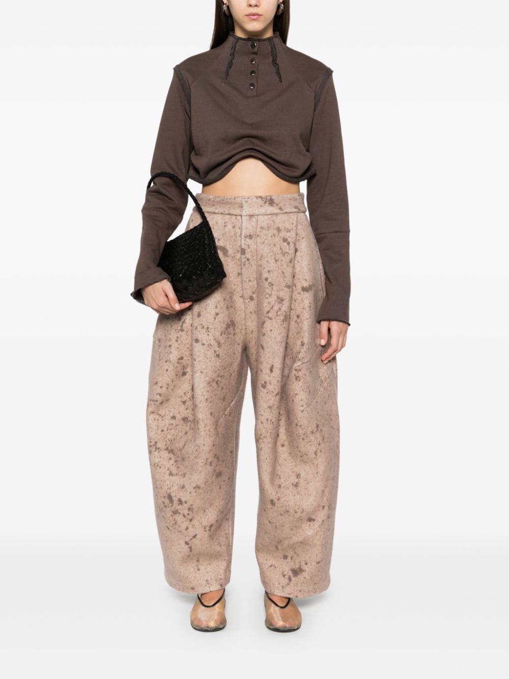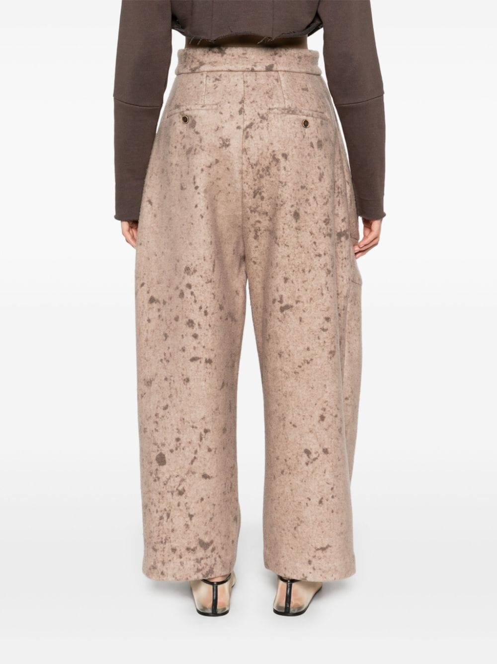 trousers, pollock-inspired printed fabric, thick fabric, pleats, side pockets, back pockets with button, wide leg, hook and button closureComposition: 79% wool 20% polyamide 1% cottonWashing instructions: dry clean