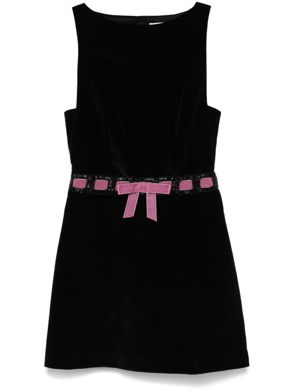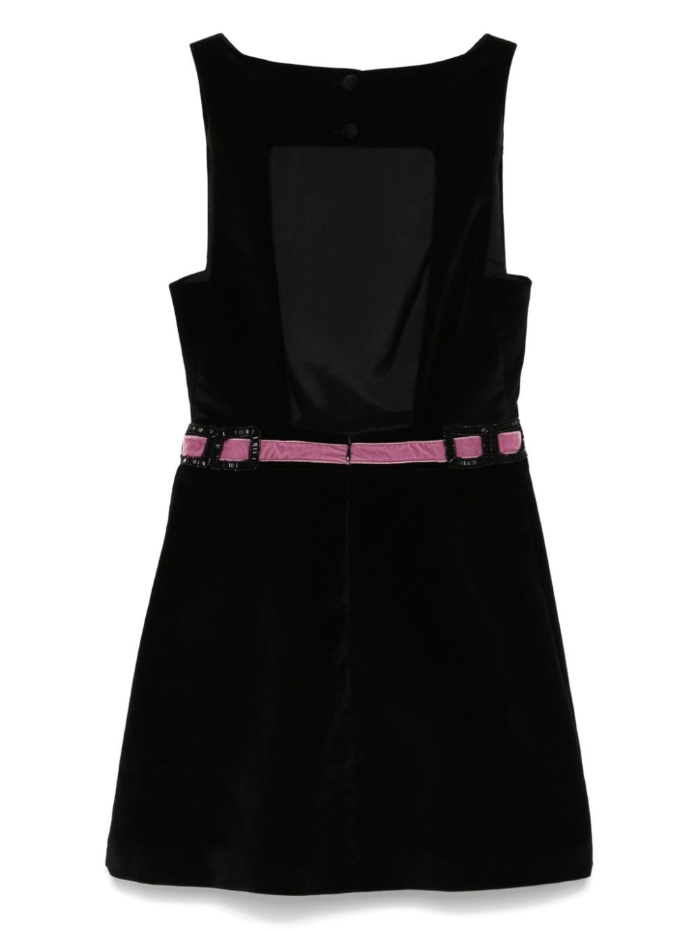 short dress, velvet, boat neckline, sleeveless, back closure with buttons and zip, back neckline, waist detail with pink velvet and jais ribbon, flared bottomComposition: 100% cottonWashing instructions: dry clean