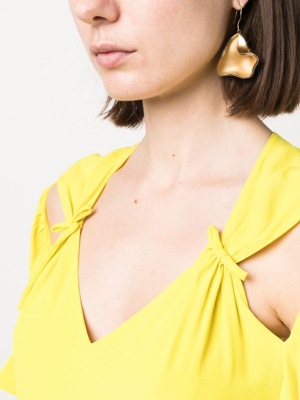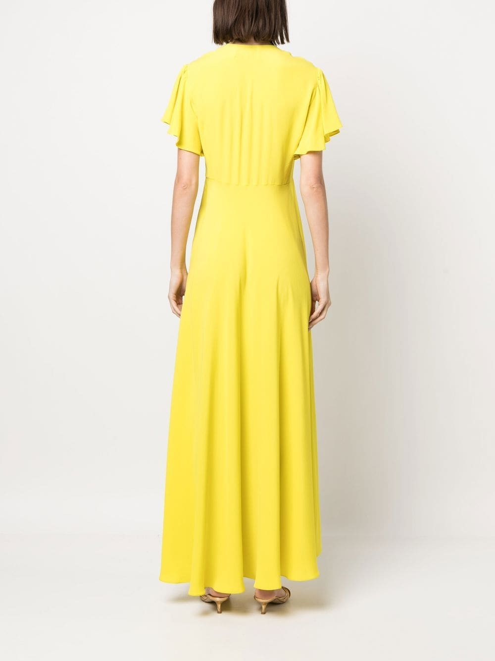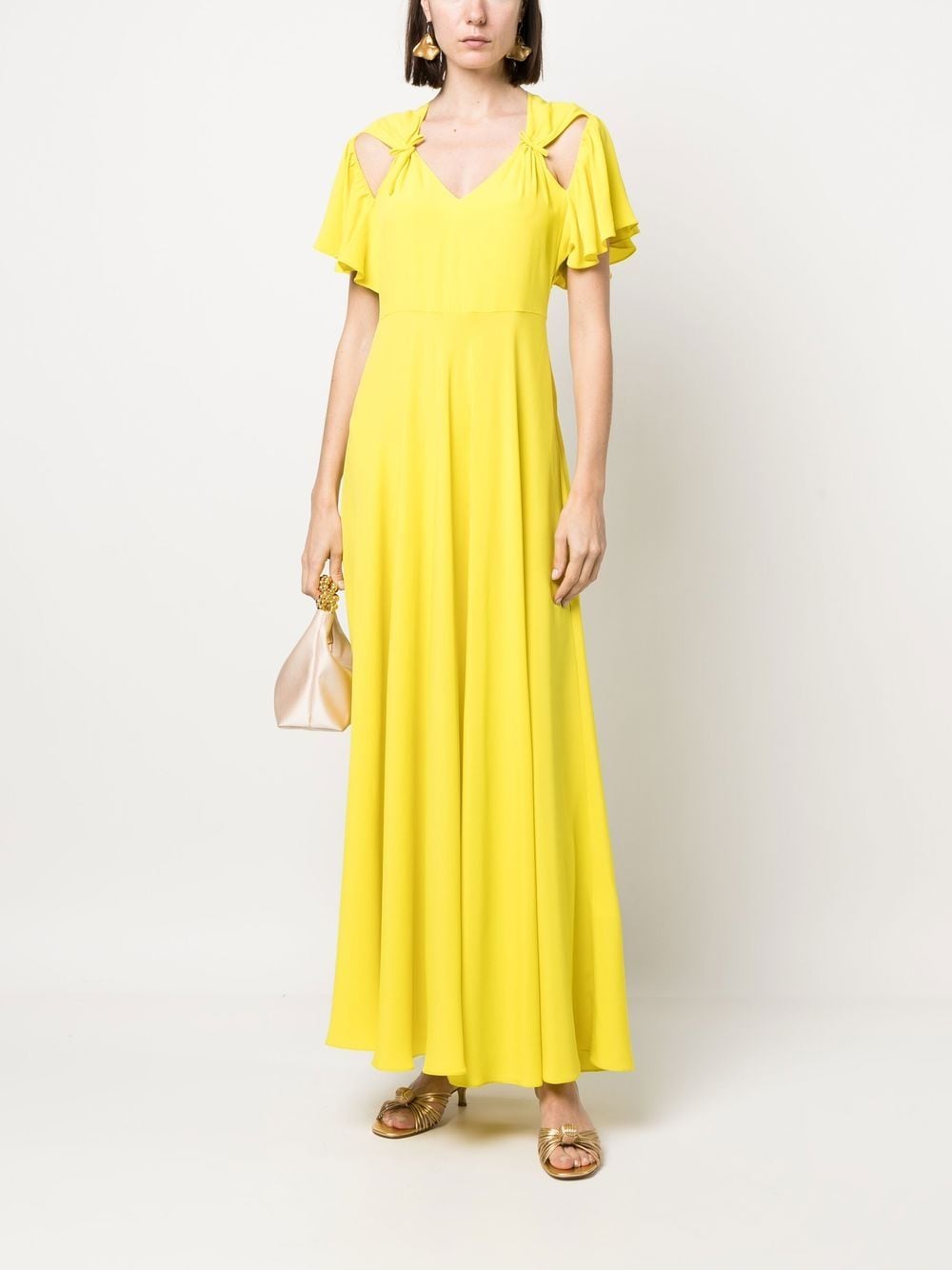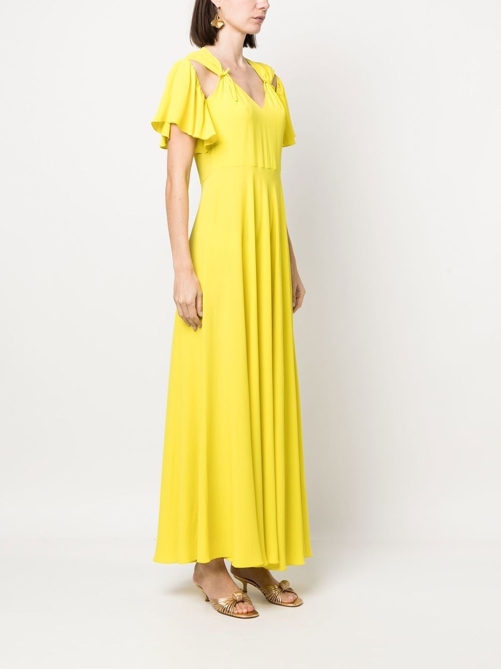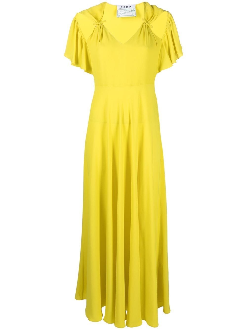 long dress, V-neck, side portholes, bows, short bell sleeves, flared bottom, unlinedComposition: 89% acetate 31% silkWashing instructions: dry clean