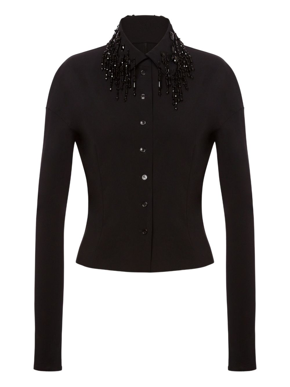 camicia, collo con frange in cristallo, chiusura con bottoni, manica lunga da drappeggiare