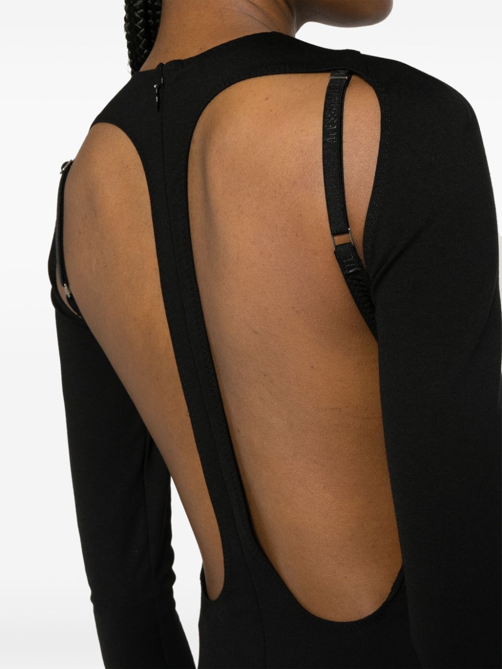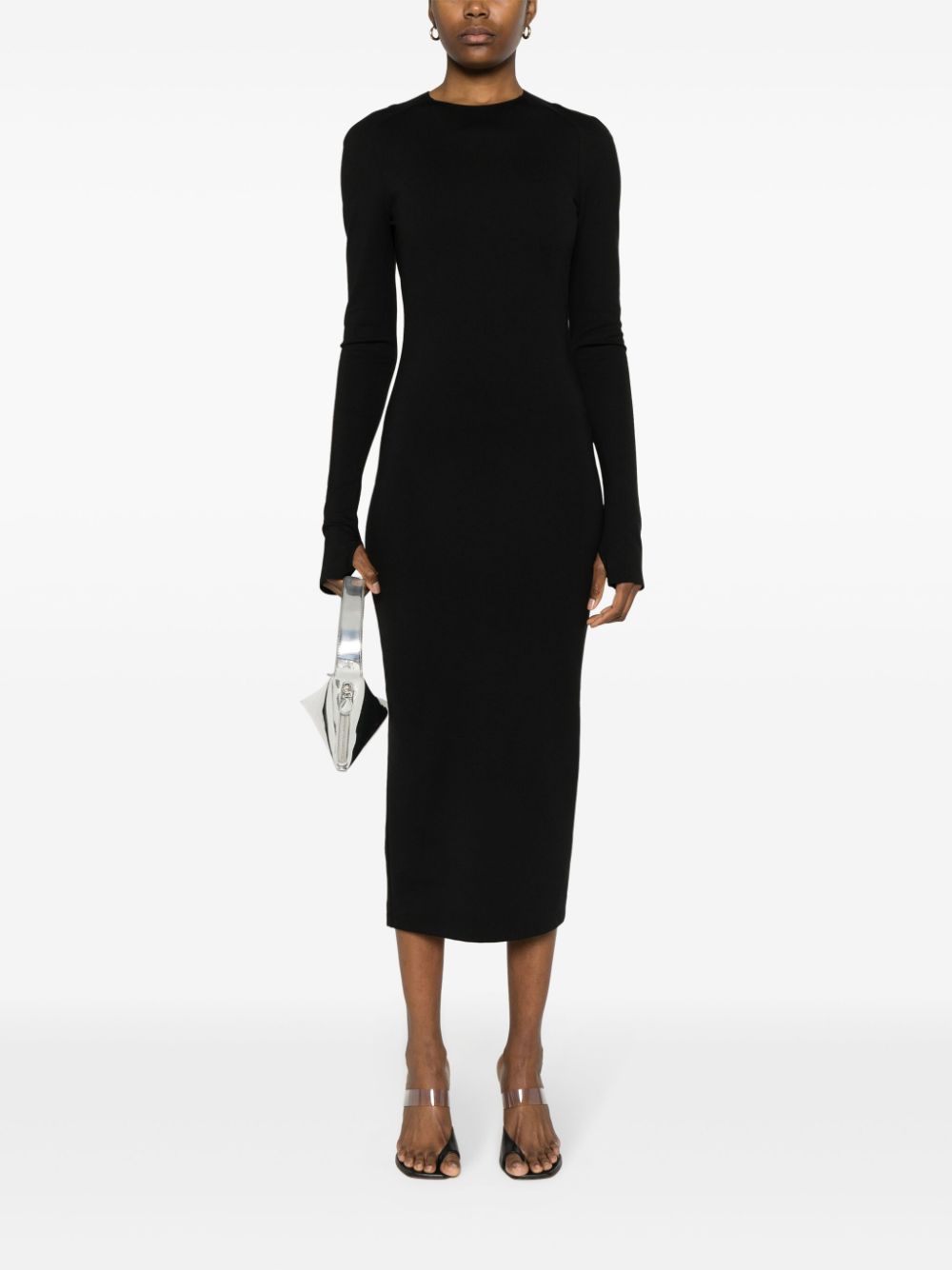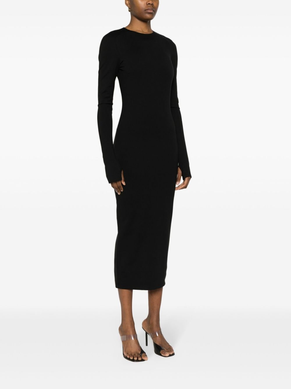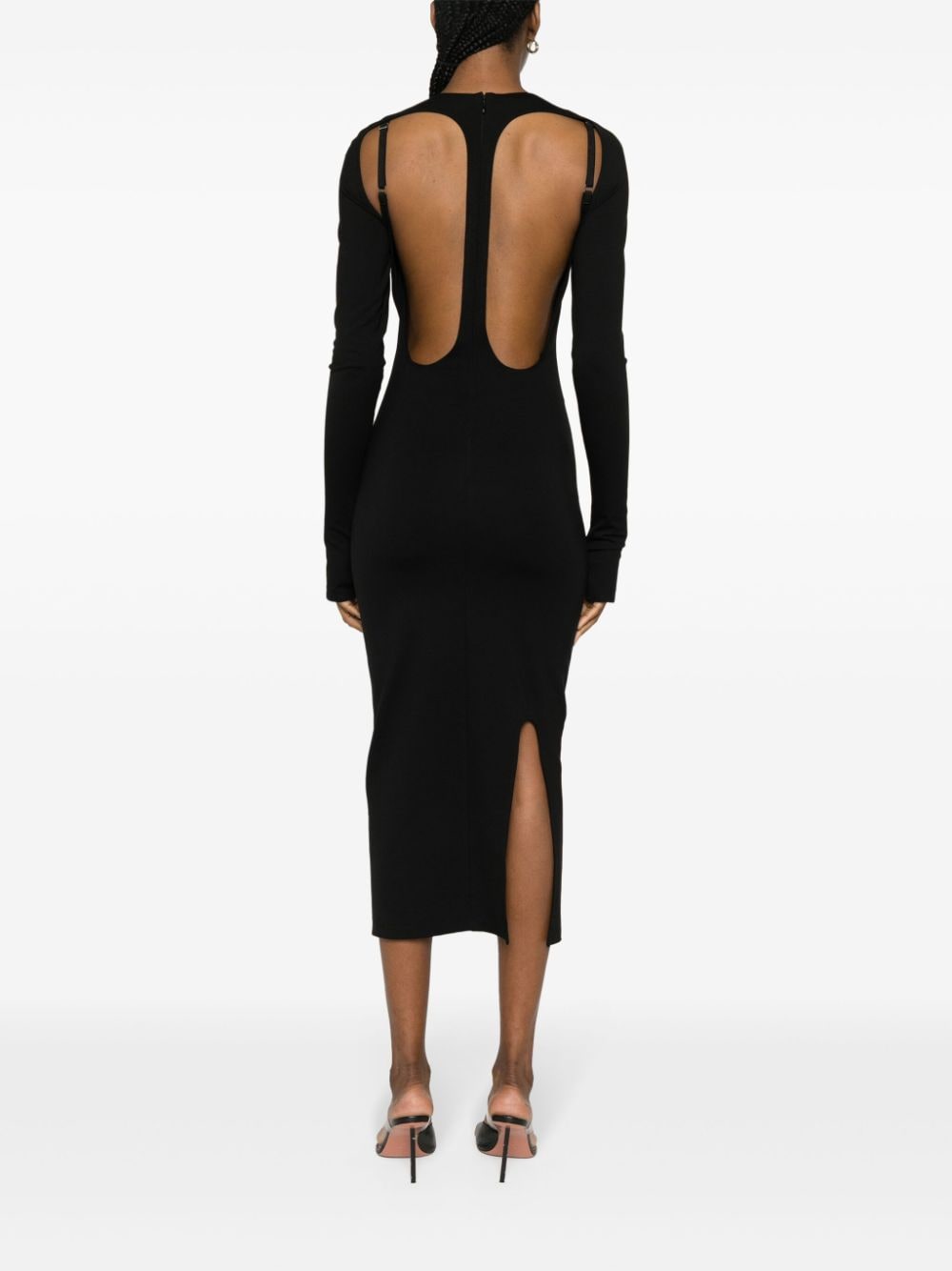 abito midi, girocollo, manica lunga, schiena nuda con bretelle, polsi con foro per manica a guanto, chiusura posteriore con zip, spacco posteriore Composizione: rayon 68%, poliammide 27%, spandex/elastam 5% Istruzioni per il lavaggio: lavare in lavatrice