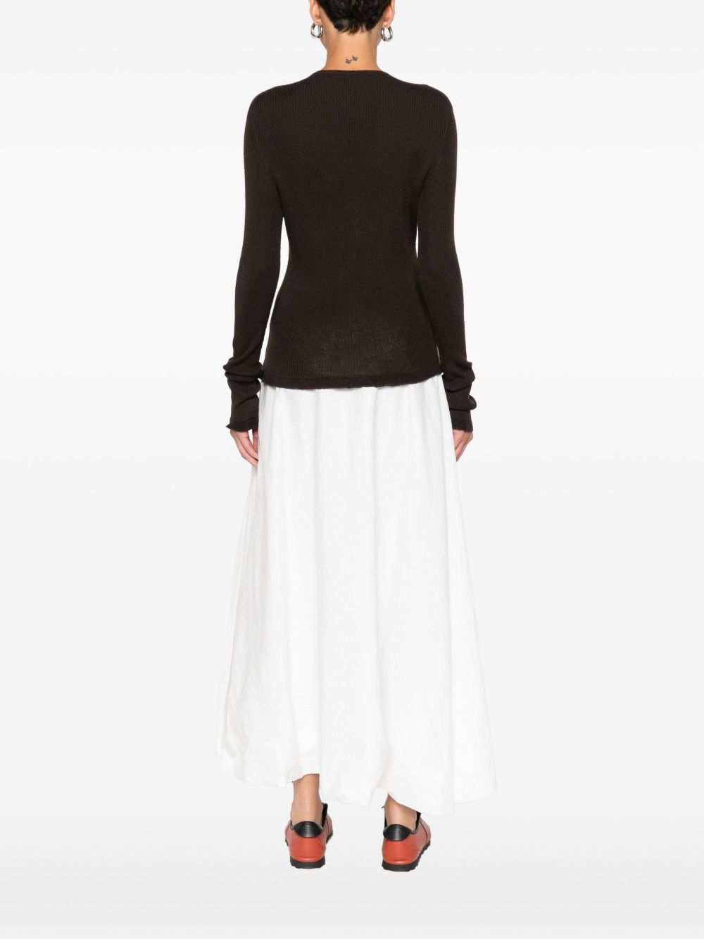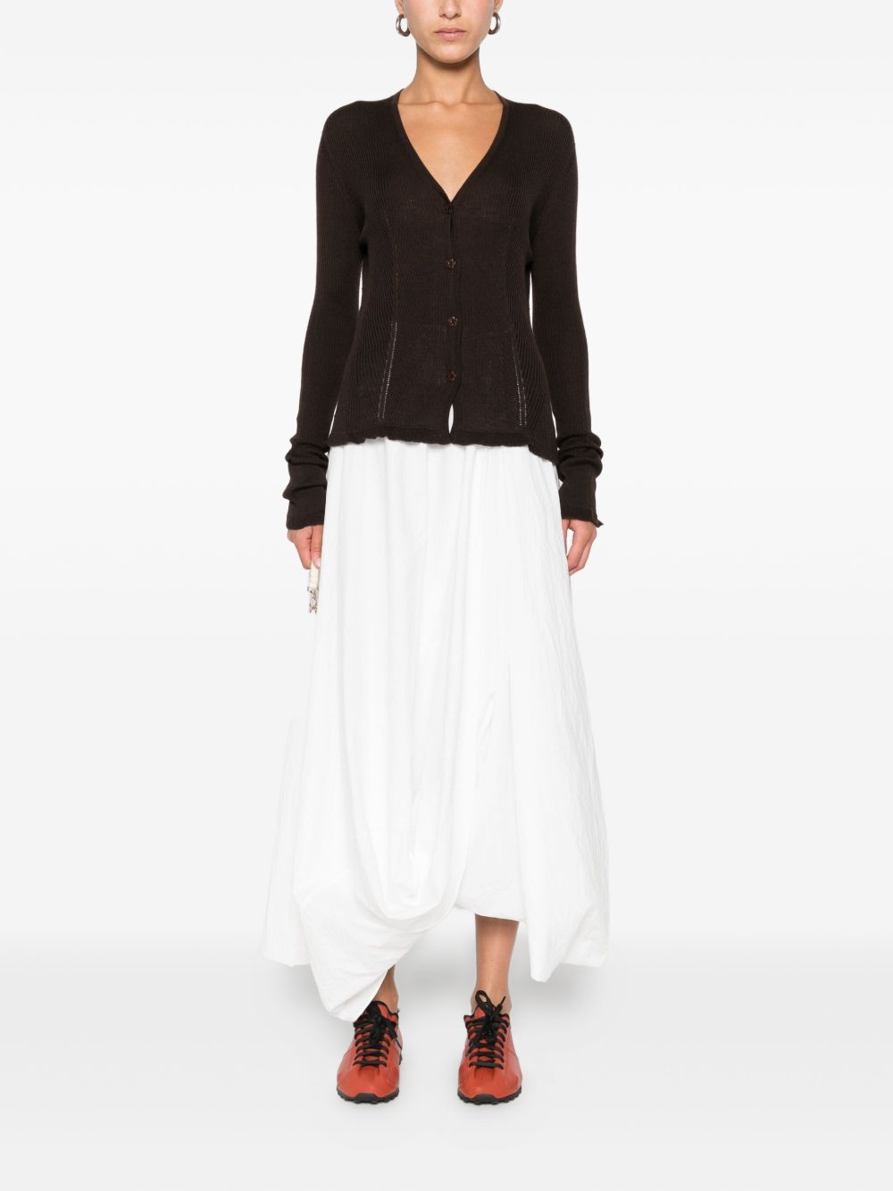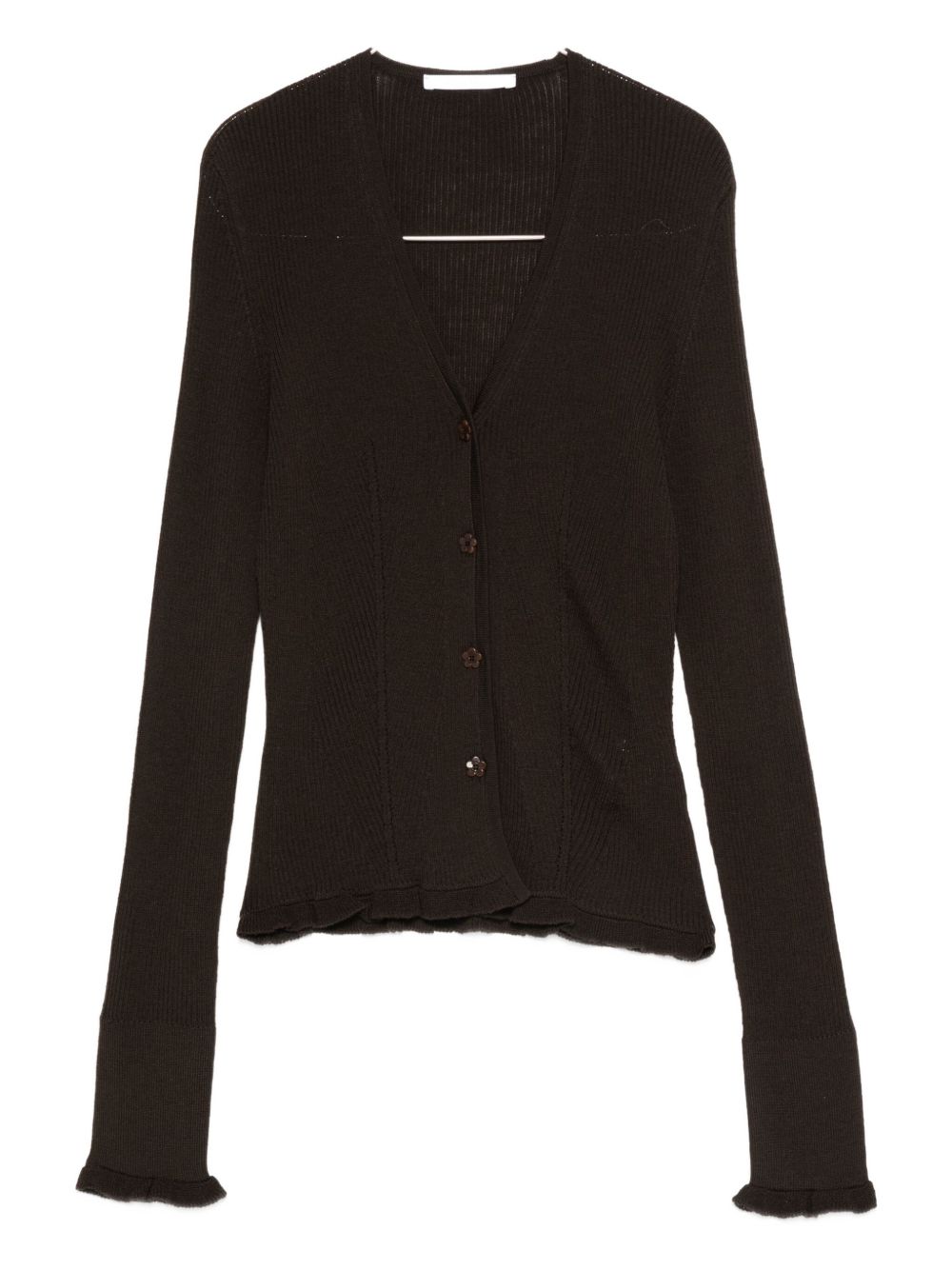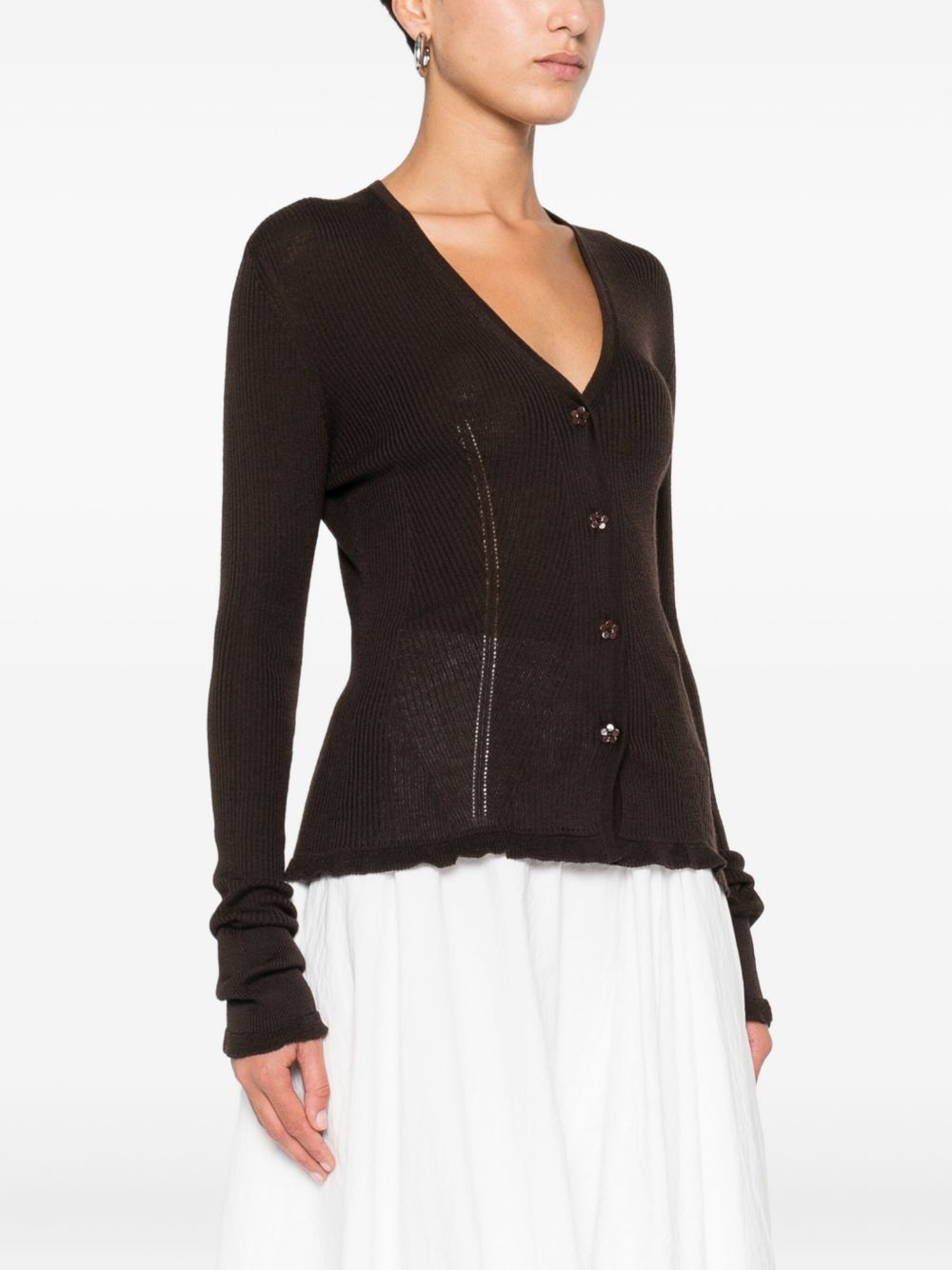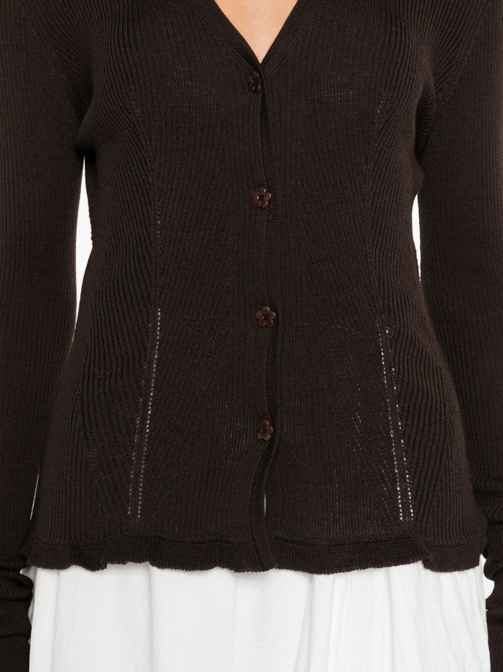 cardigan, scollo a v, maglia a costine, chiusura con bottoni a motivo floreale, manica lunga, bordo polsi e fondo con rouches