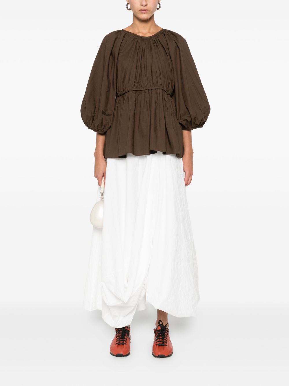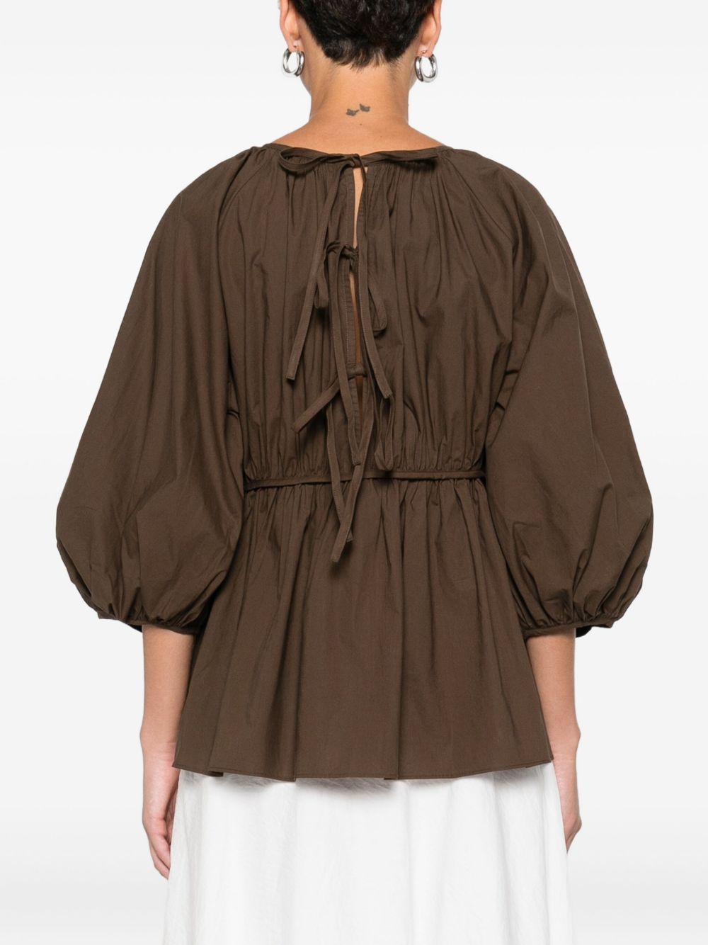 top, girocollo, manica a tre quarti ampia a sbuffo, drappeggio, chiusura posteriore con fiocchi, fondo svasato