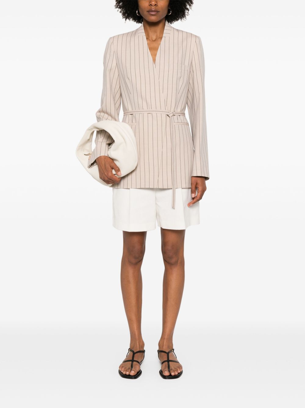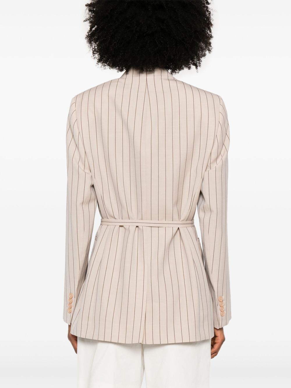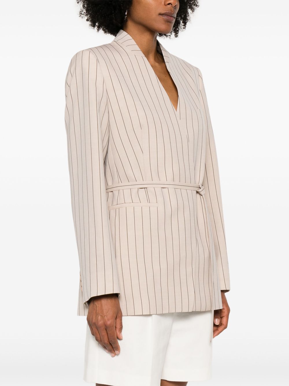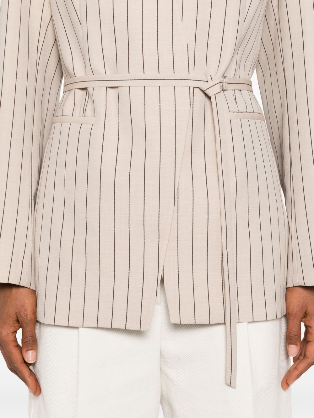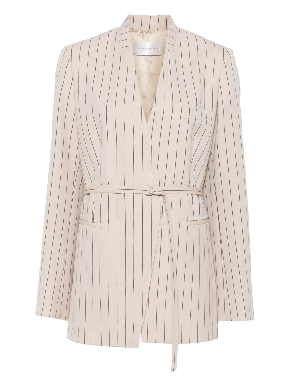 giacca, tessuto gessato, senza collo, scollo a v, foderata, tasche a filo laterali, taschino, spacco posteriore, manica lunga, polsi con bottoni e asole aperte, chiusura con cintura removibile Composizione: 100% lana Istruzioni per il lavaggio: lavare a secco