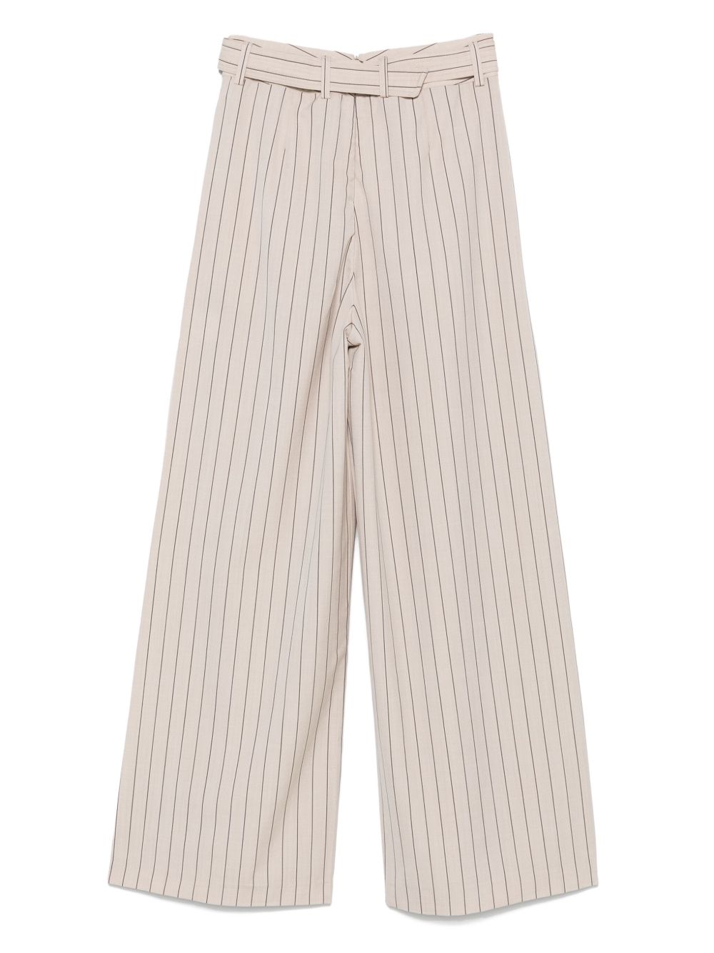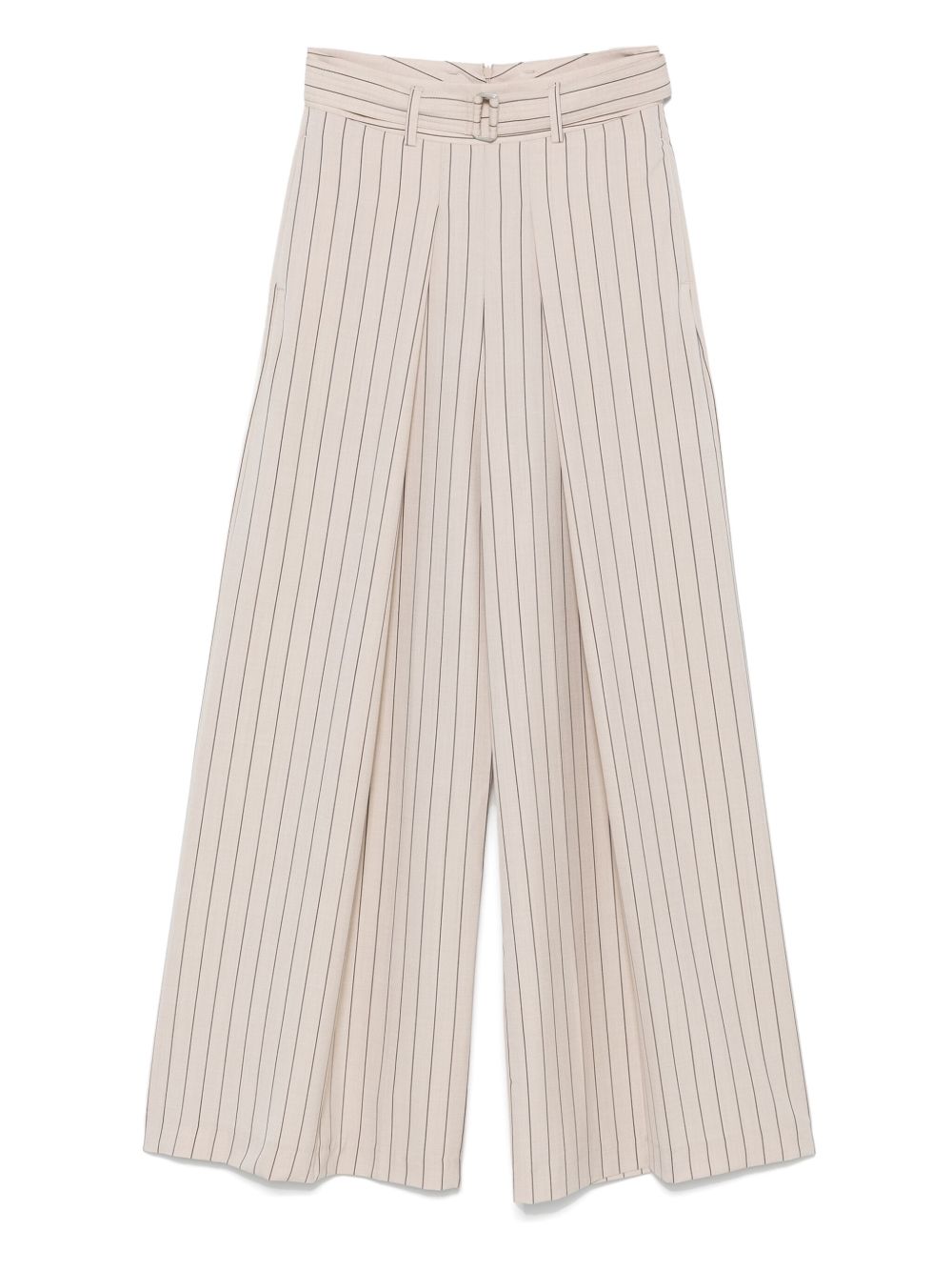 pantalone, vita alta, cintura removibile con passanti, chiusura posteriore con zip, tasche laterali, pences, gamba larga , tessuto gessato Composizione: 100% lana Istruzioni per il lavaggio: lavare a secco