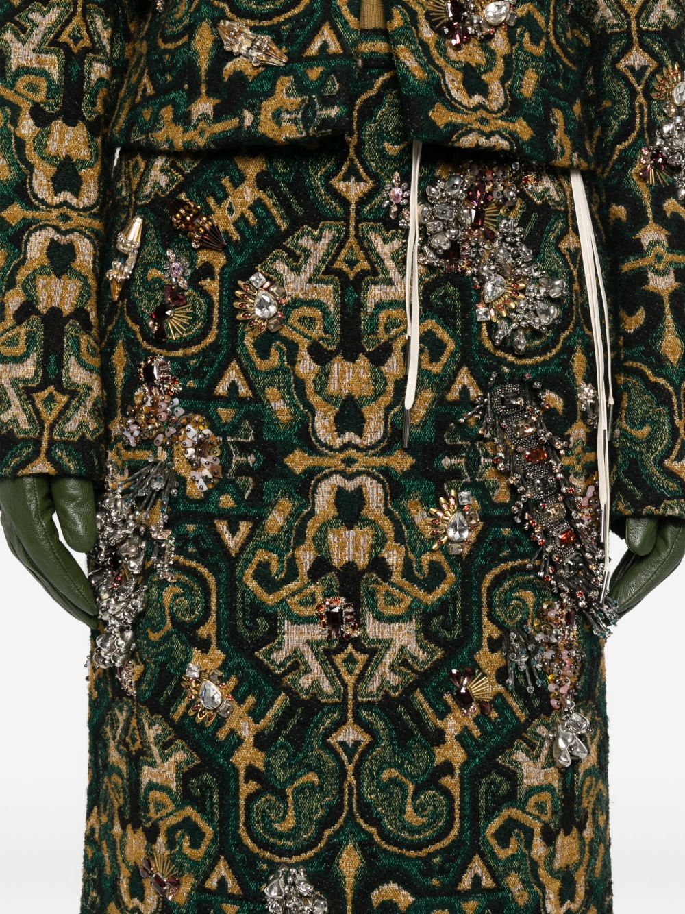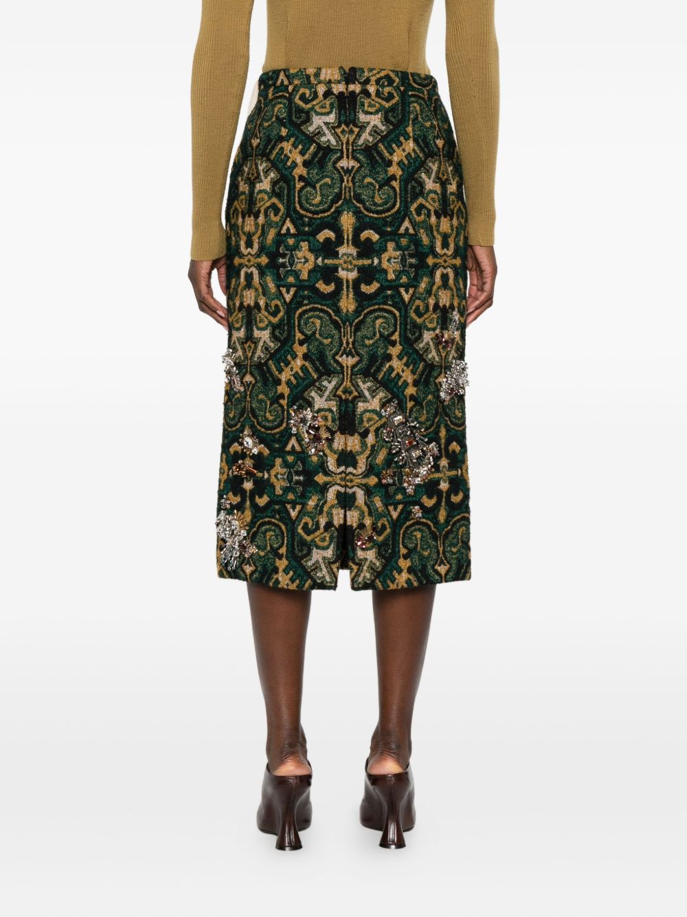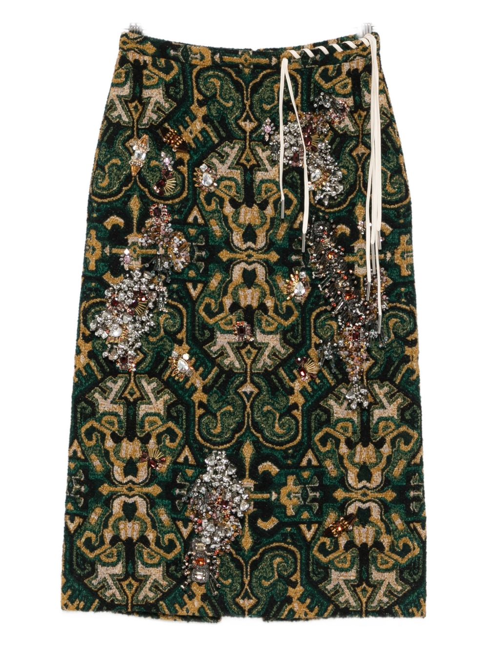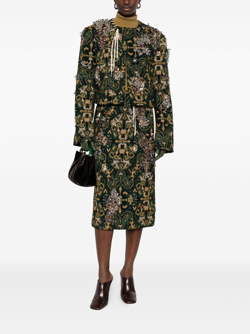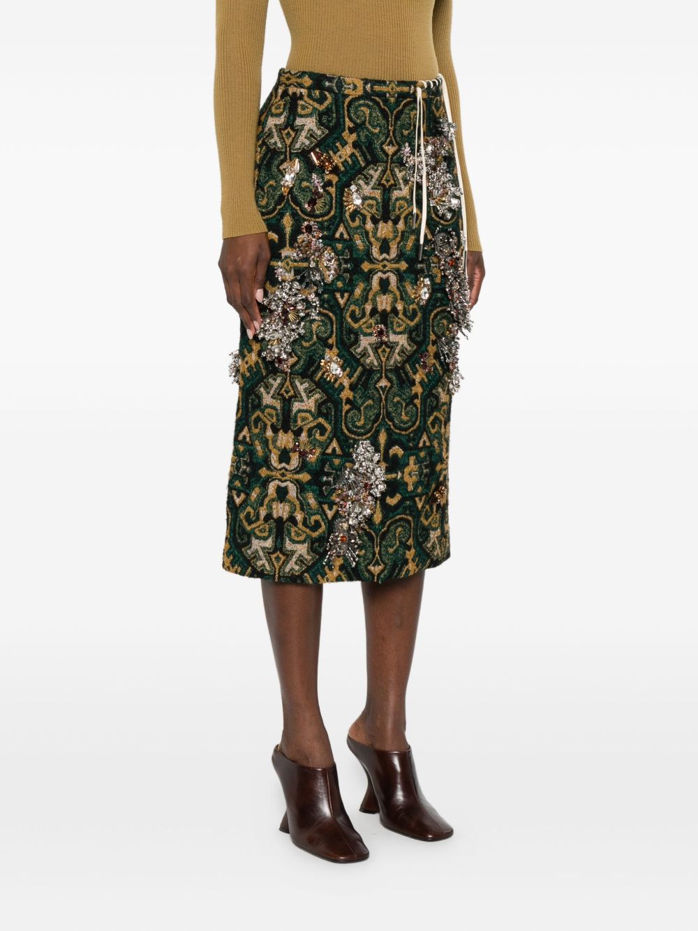gonna a tubino, tessuto jaquard con motivo geometrico, dettaglio laccio a contrasto con pendenti , applicazioni di cristalli e perline, spacco posteriore, chiusura con zip posteriore, foderata
