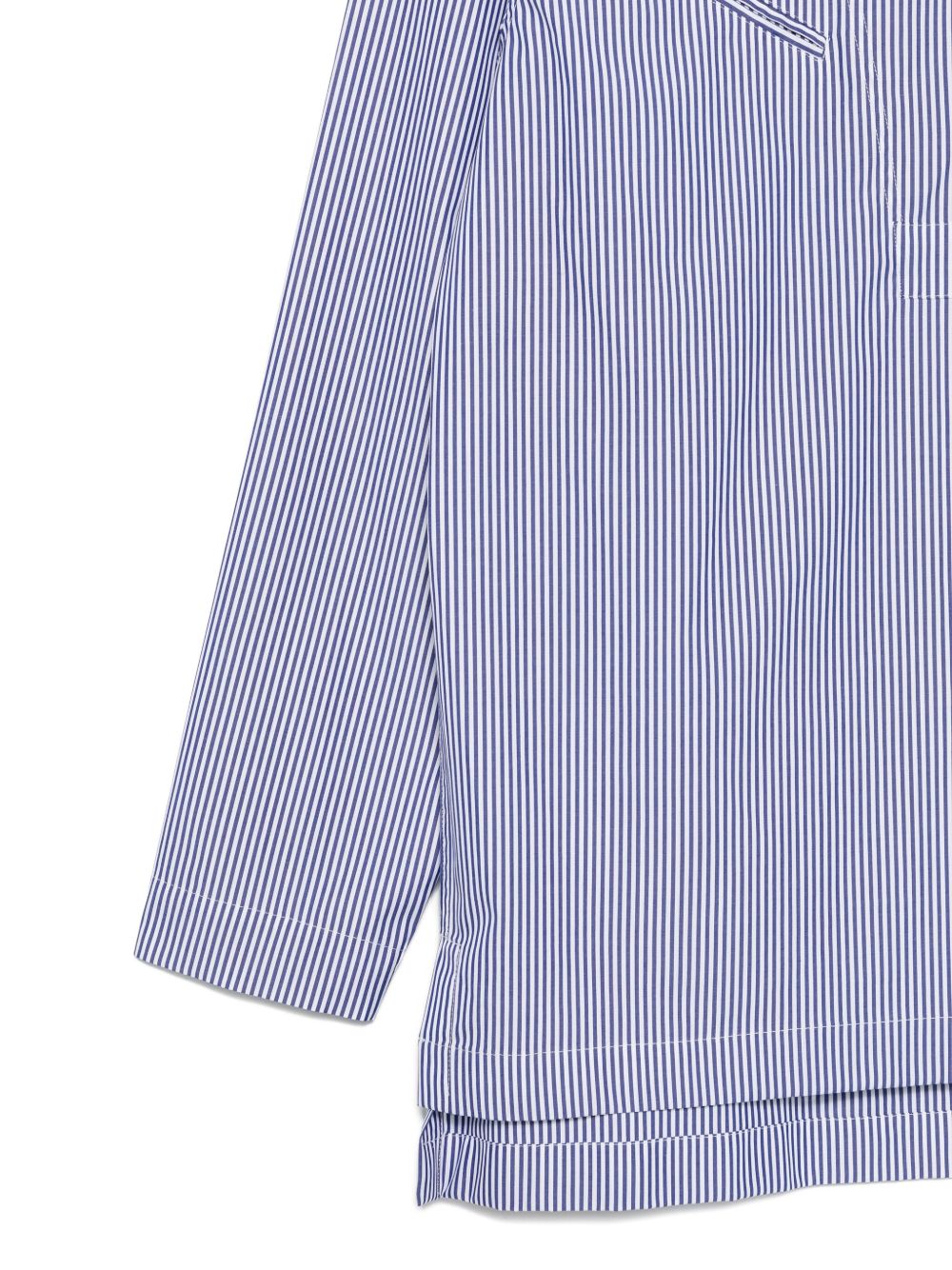 tunica, colletto a punta, chiusura con bottoni, scollo a v, tasche frontali oblique, spacchi laterali, maniche lunghe, popeline a righe