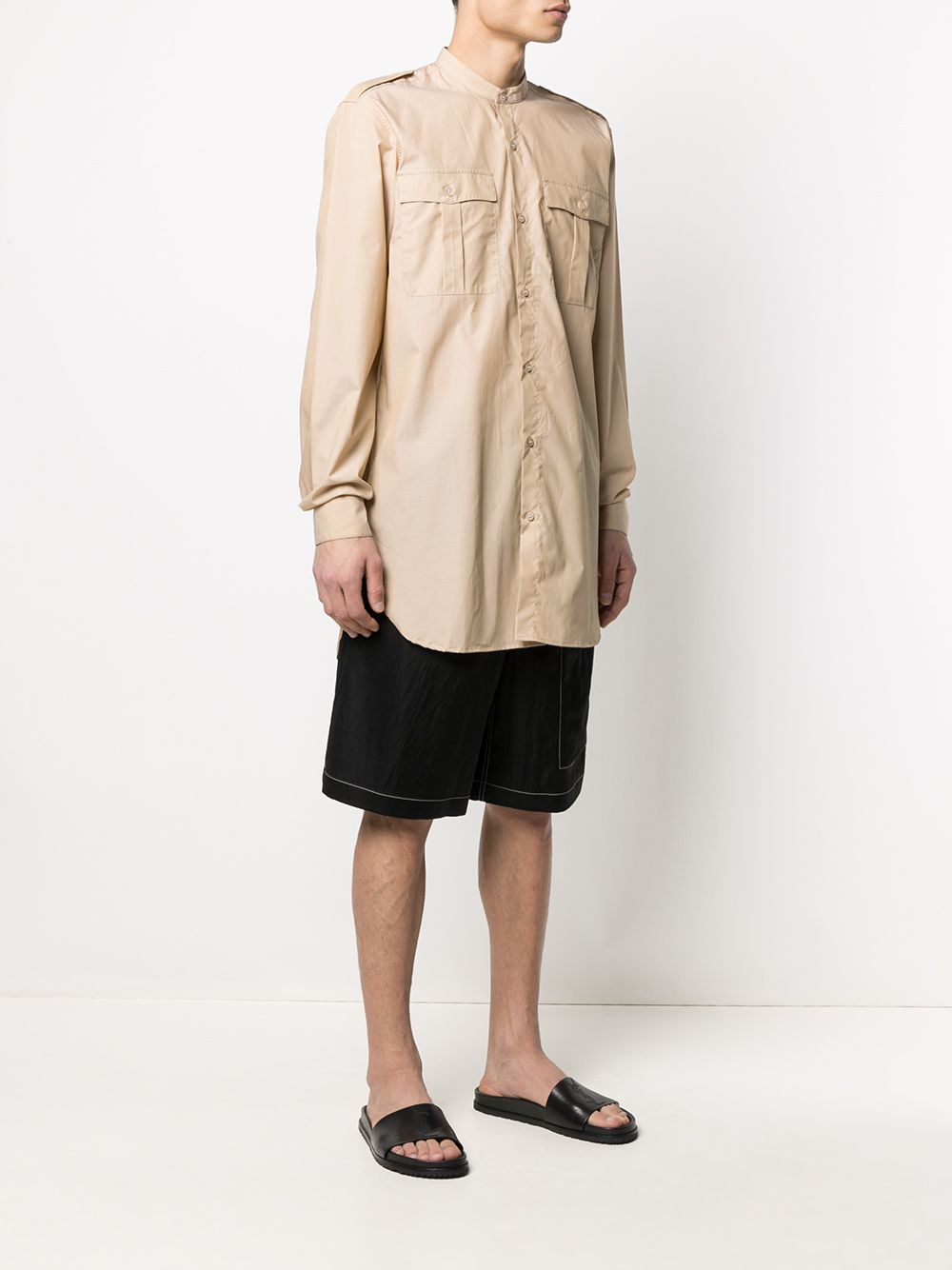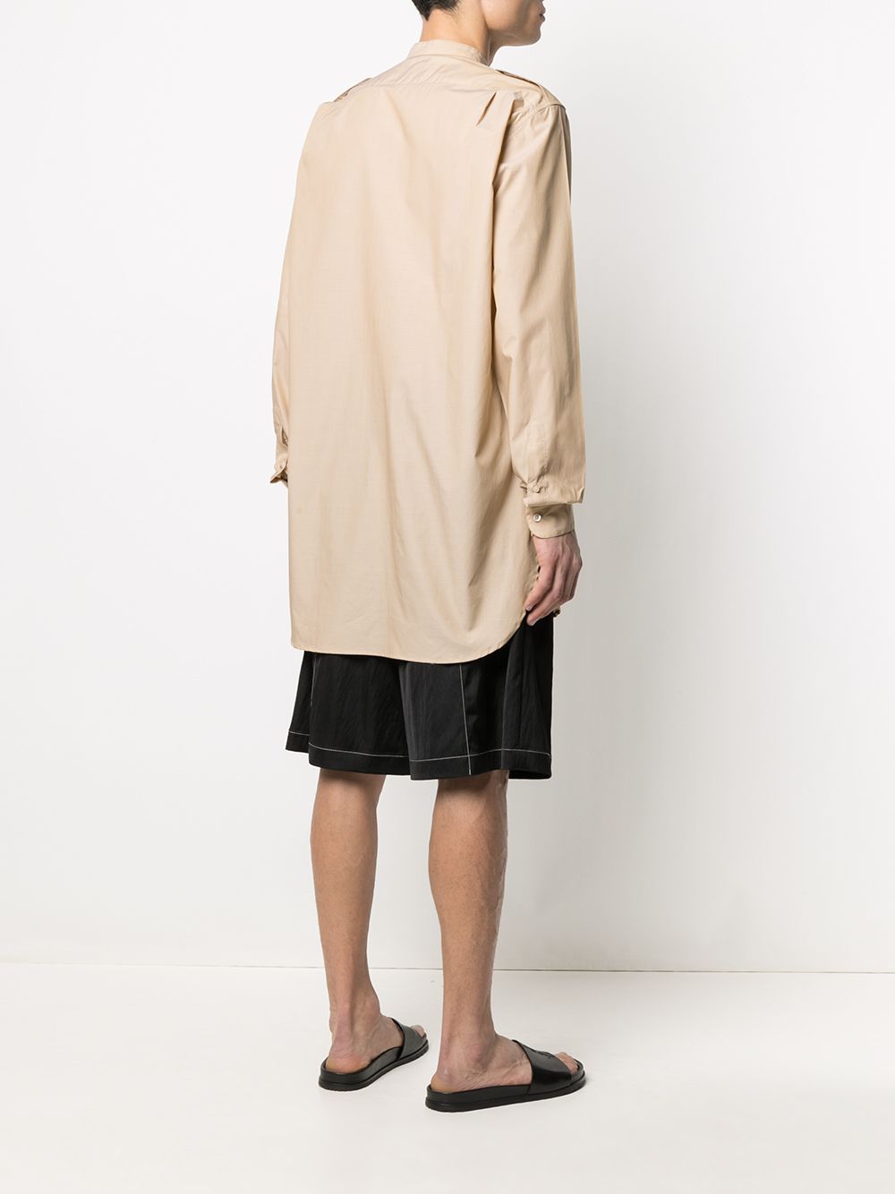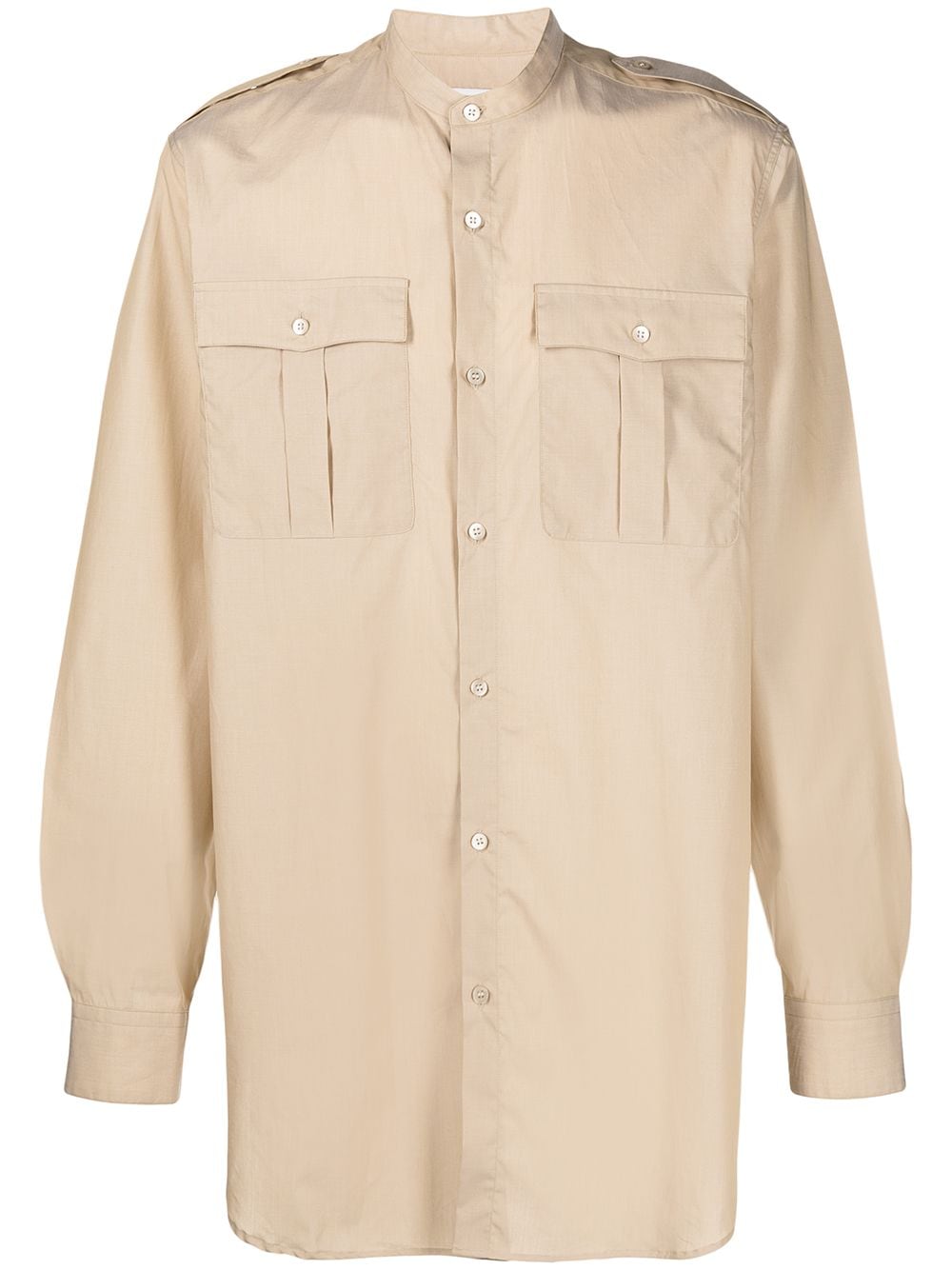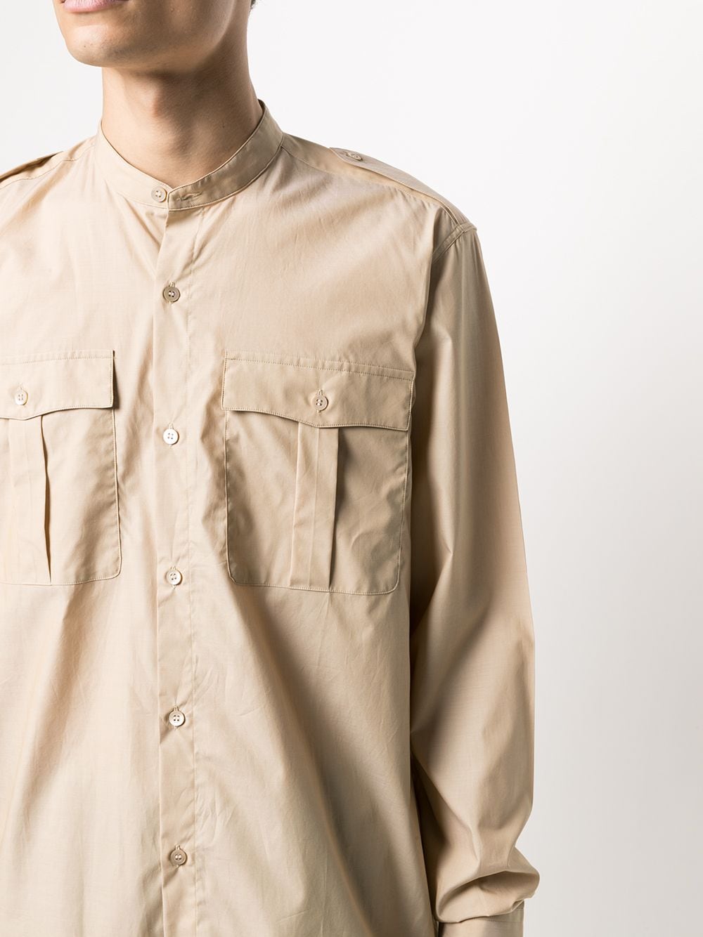 Camicia stile militare con colletto alla coreana, abbottonatura frontale, maniche lunghe, polsini con bottoni, spalline, due tasche applicate sul petto e orlo curvo. Composizione Cotone 100% Istruzioni per il lavaggio Lavare in lavatrice