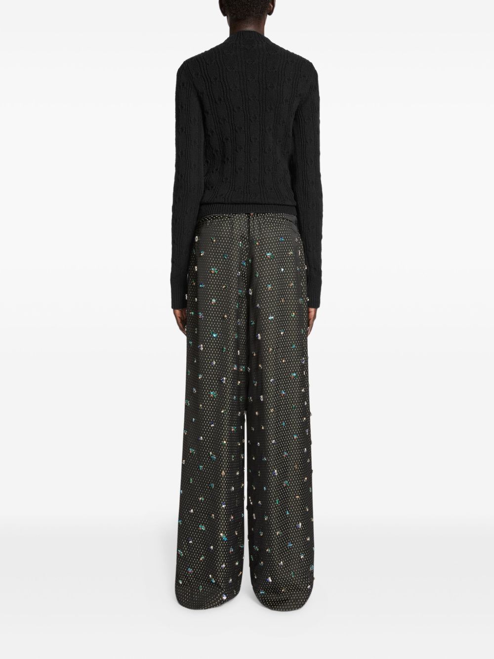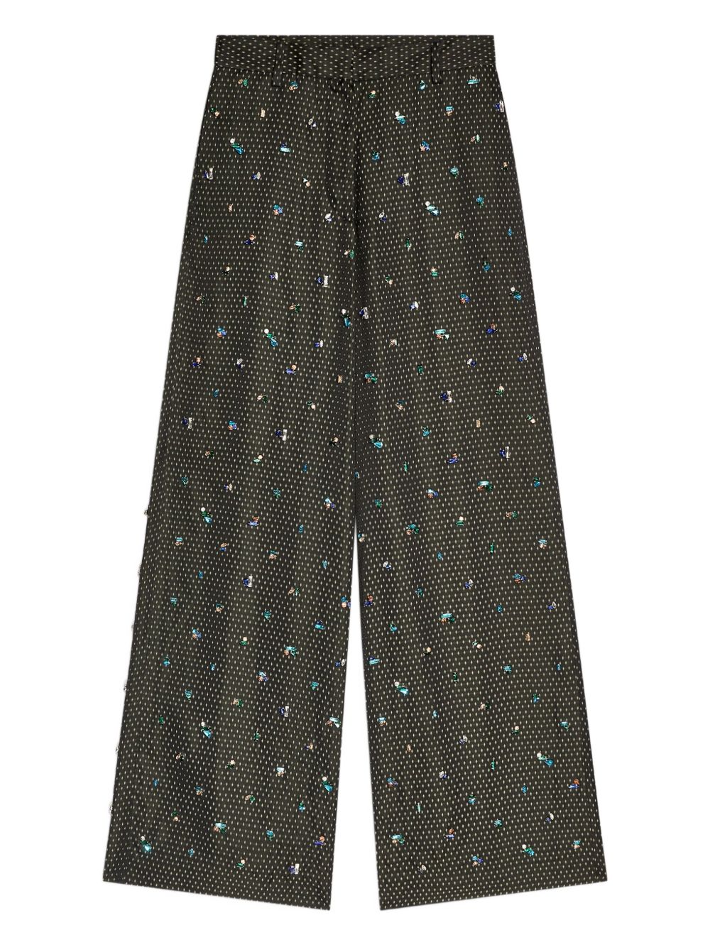 pantalone, tessuto con disegno cravatta, cristalli applicati multicolor, chiusura con gancio e zip, passanti per cintura, cintura removibile, tasche laterali e posteriori, pences, gamba larga