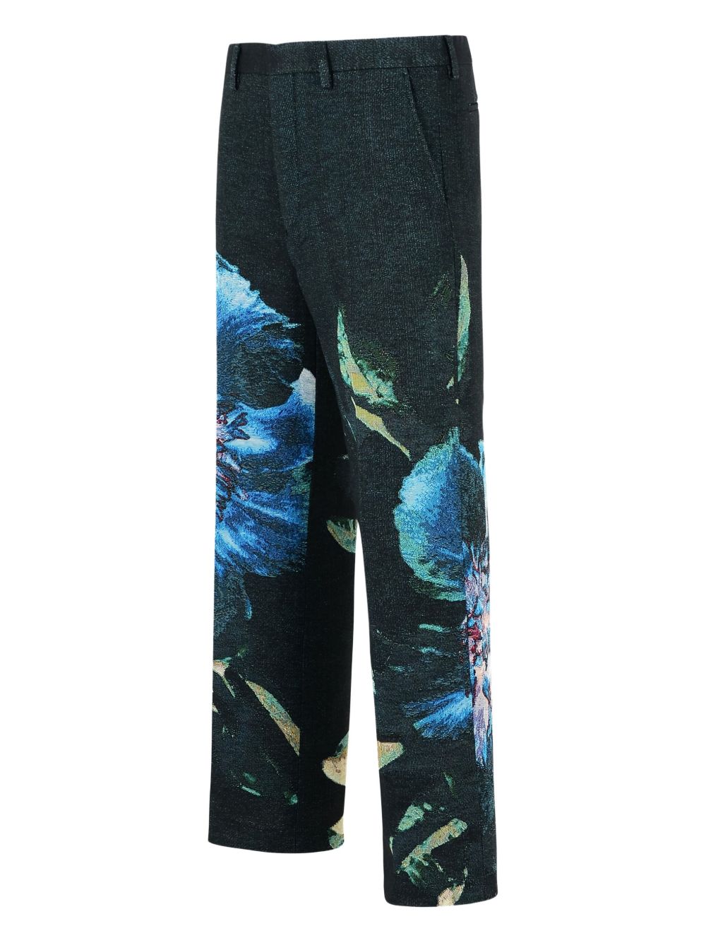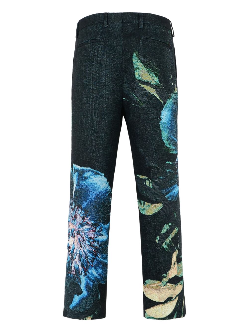 pantalone, tessuto jaquard con motivo floreale, tasche anteriori e posteriori, chiusura con gancio e zip, passanti per cintura, gamba diritta