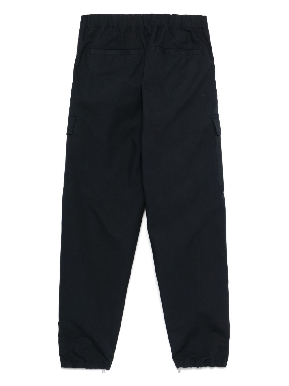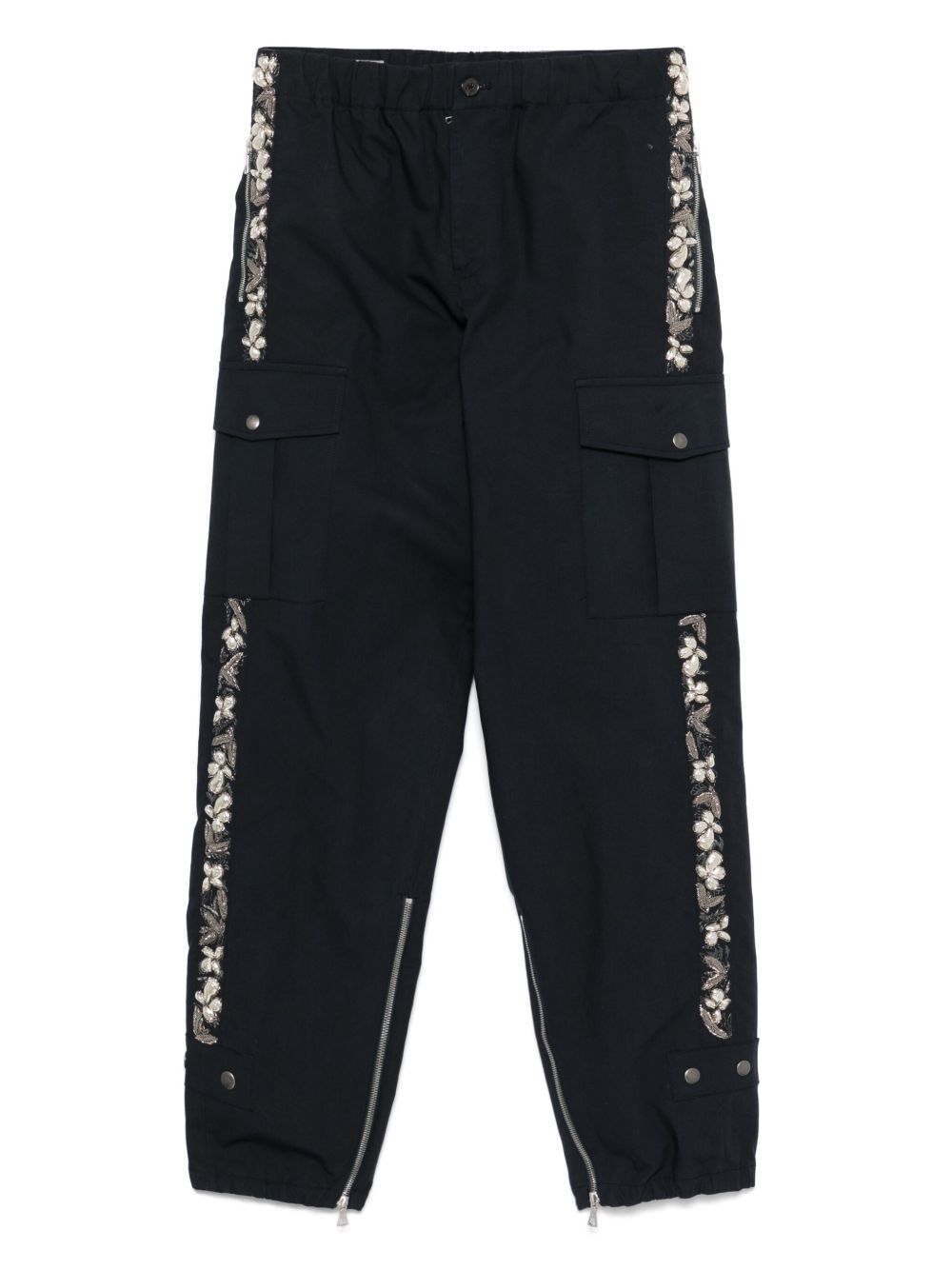 pantalone cargo, vita elasticizzata, chiusura con bottone e zip, tasche laterali con zip, tasche a filo posteriori, ricamo e applicazioni in argento, tasconi laterali su gamba con pattine e bottoni a pressione, gamba larga, fondo con elastico e zip laterale Composizione: 100% cotone Istruzioni per il lavaggio: lavare a secco