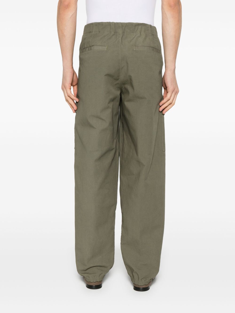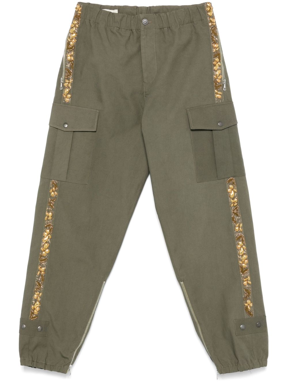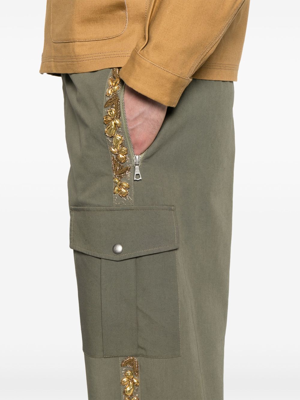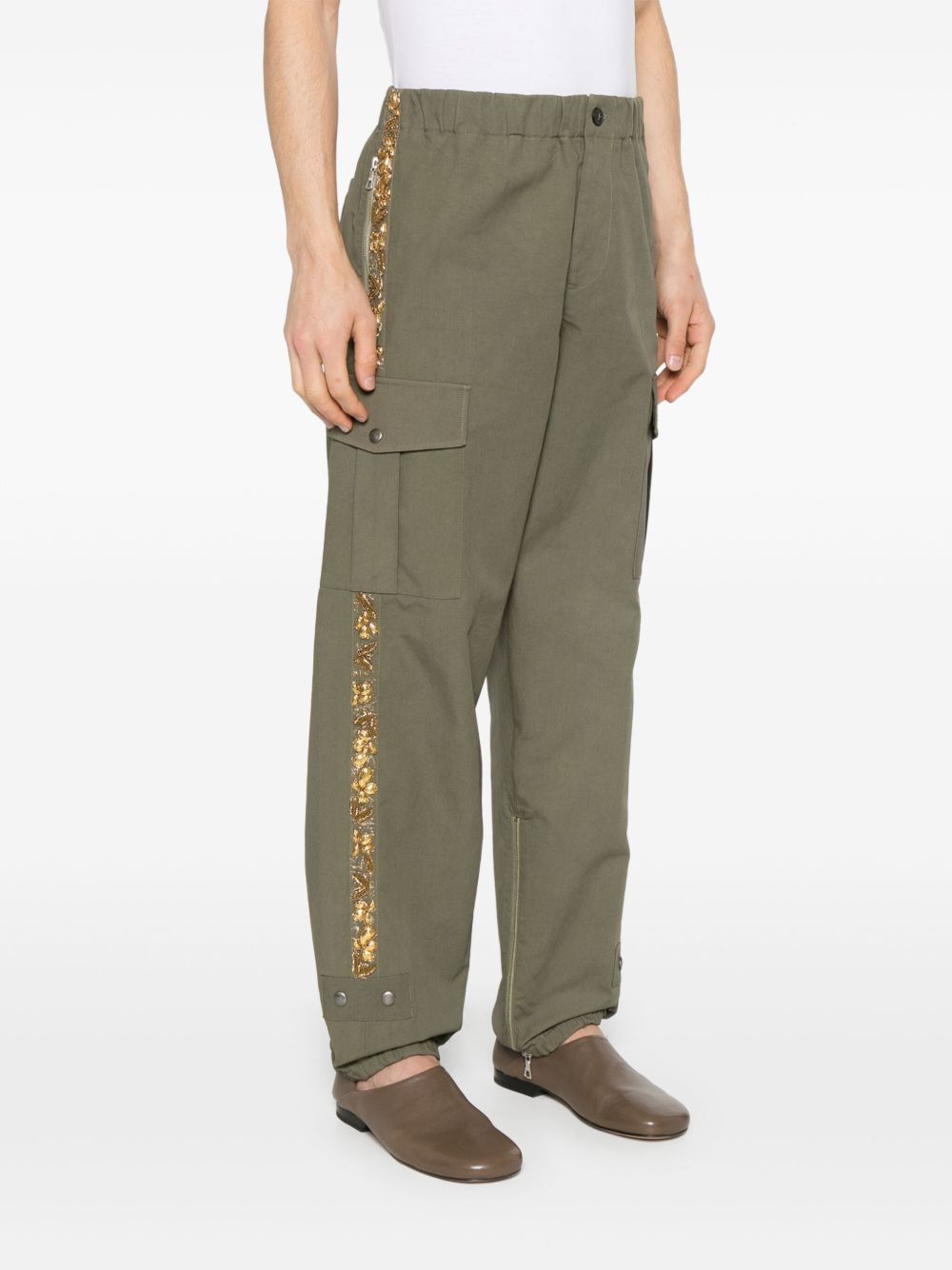 pantalone cargo, vita elasticizzata, chiusura con bottone e zip, tasche laterali con zip, tasche a filo posteriori, ricamo e applicazioni in argento, tasconi laterali su gamba con pattine e bottoni a pressione, gamba larga, fondo con elastico e zip laterale Composizione: 100% cotone Istruzioni per il lavaggio: lavare a secco