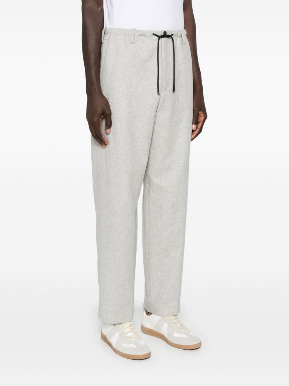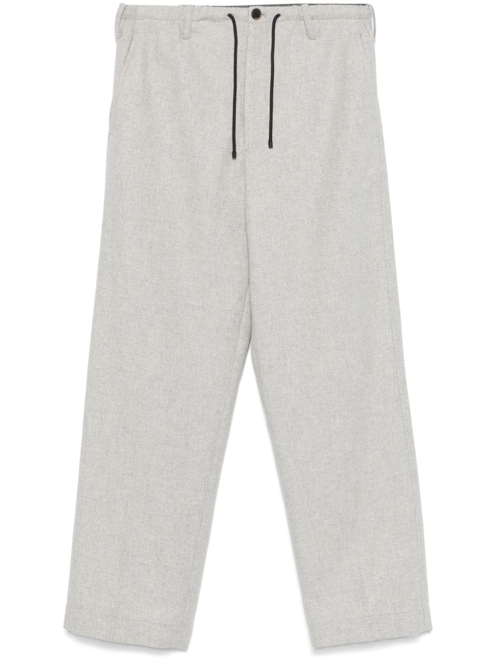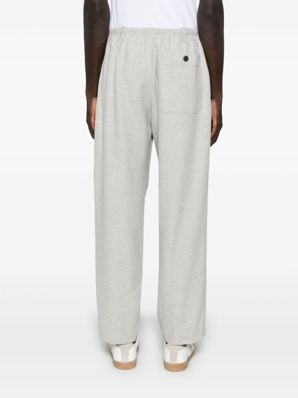 pantalone , vita con elastico e coulisse, passanti per cintura, chiusura con bottone e zip, gamba larga, tasche laterali, tasca applicata posteriore Composizione: 90% lana 10% cashmere Istruzioni per il lavaggio: lavare a secco