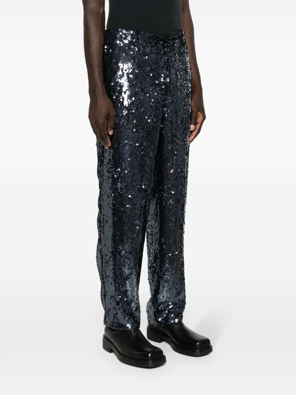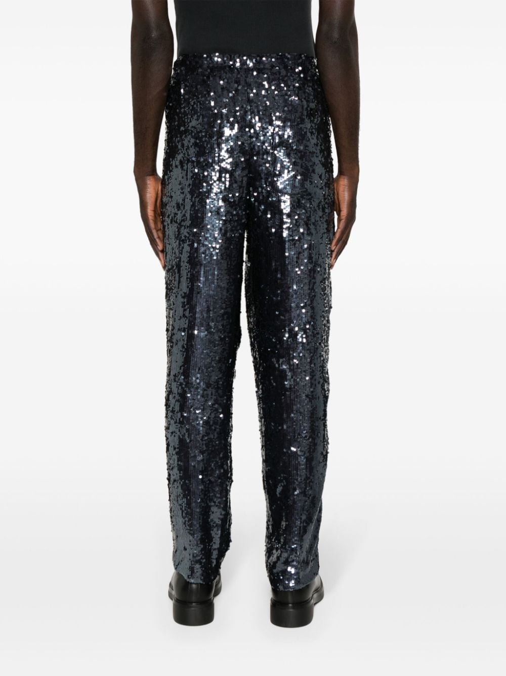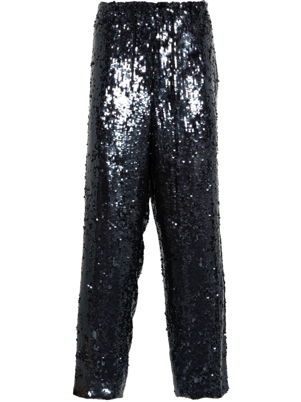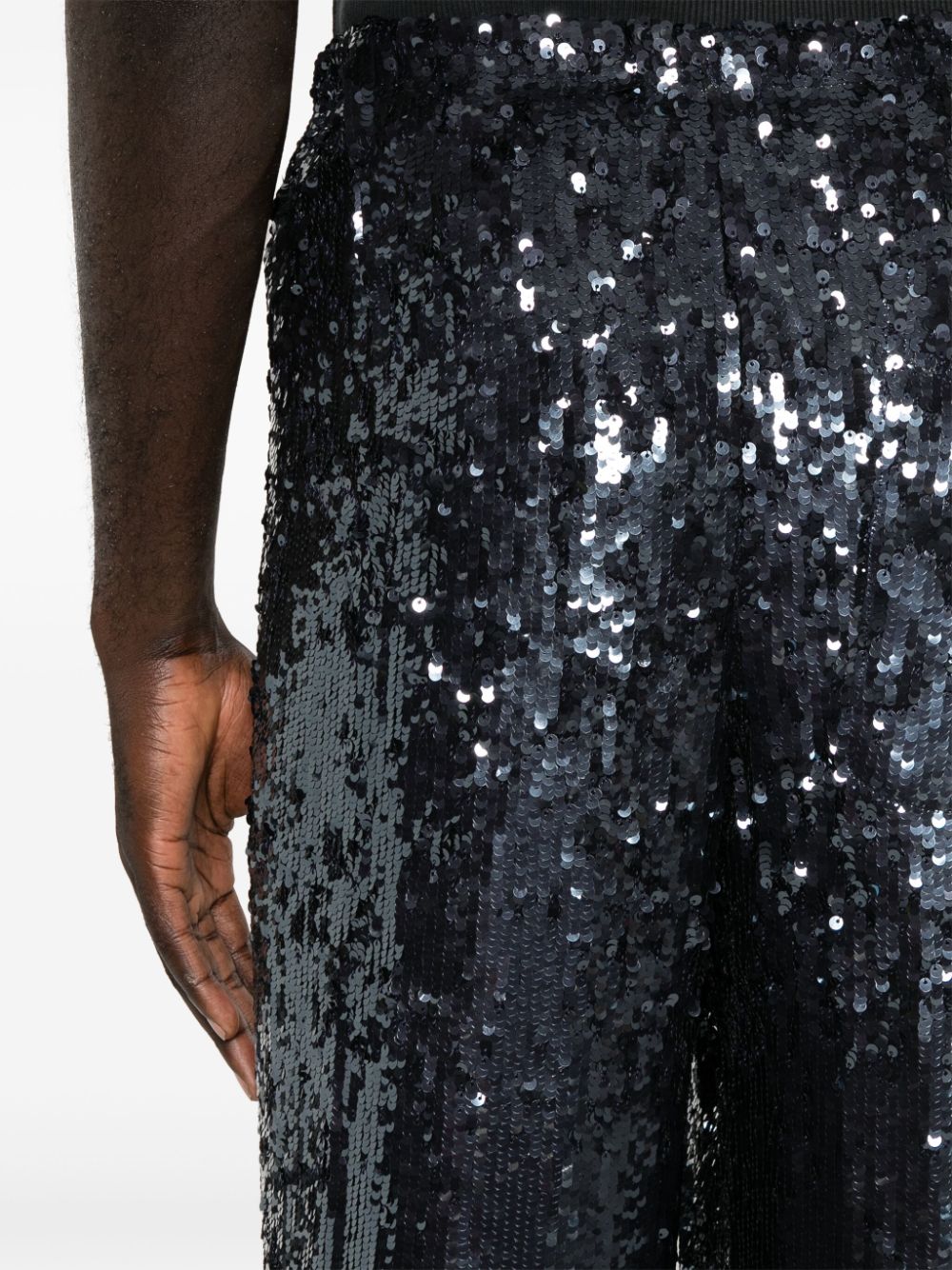 pantalone, paillettes, elastico in vita, coulisse, passanti, tasche, chiusura con bottone e zip, gamba larga Composizione : 100% viscosa Istruzioni per il lavaggio: lavare a secco
