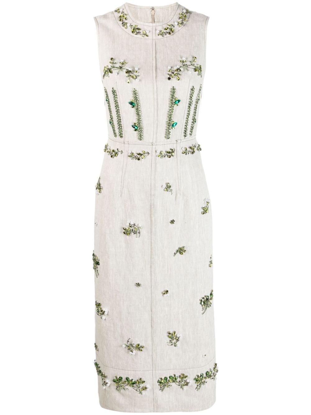 abito midi, girocollo, senza maniche, chiusura con zip posteriore, ricamo con cristalli e perle, foderatoComposizione: 100% linoIstruzioni per il lavaggio: lavare a secco