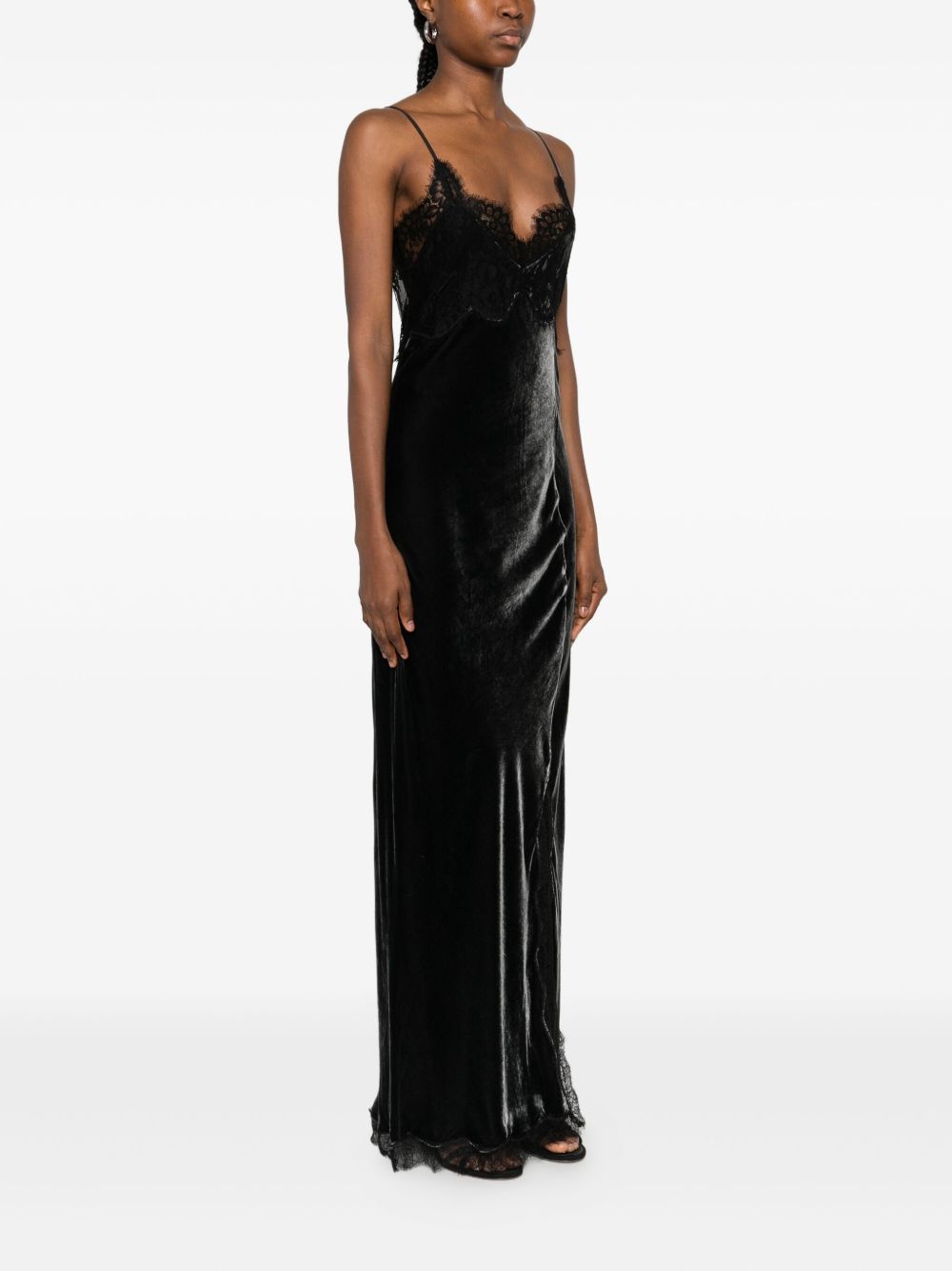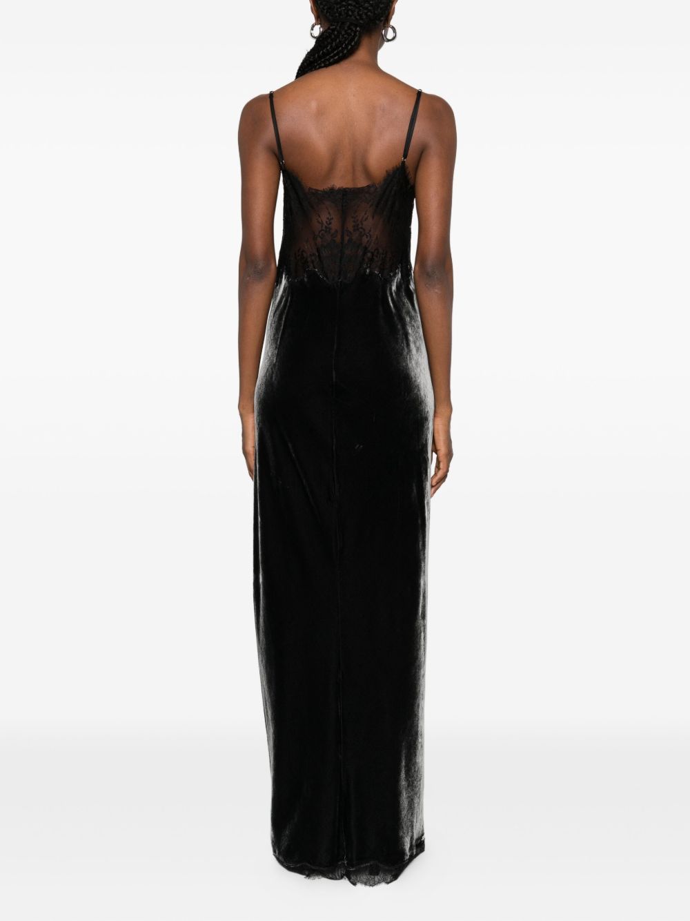 abito sottoveste lungo, bretelle sottili regolabili, velluto liscio, bordi in pizzo, spacco laterale