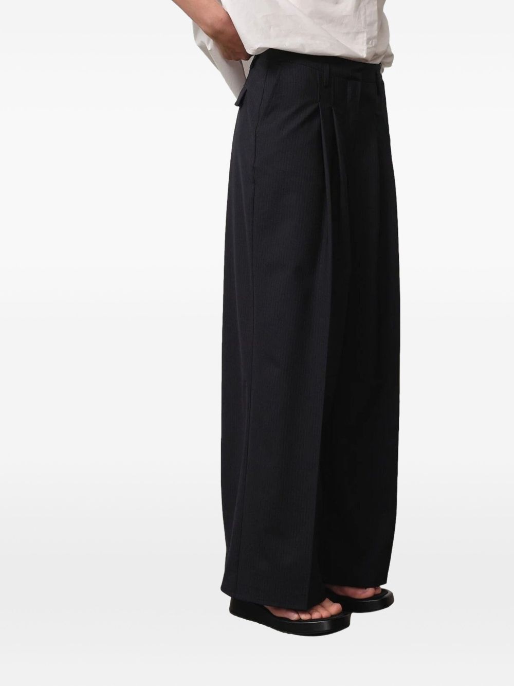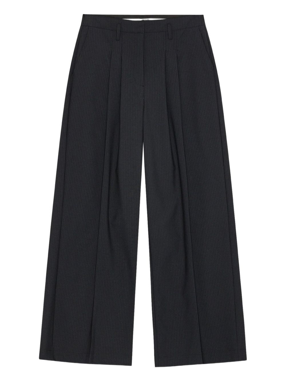 pantalone sartoriale, tessuto gessato, gamba larga, pences, passanti per cintura, tasche laterali, tasche posteriori con pattine e bottoni, chiusura con gancio e zip