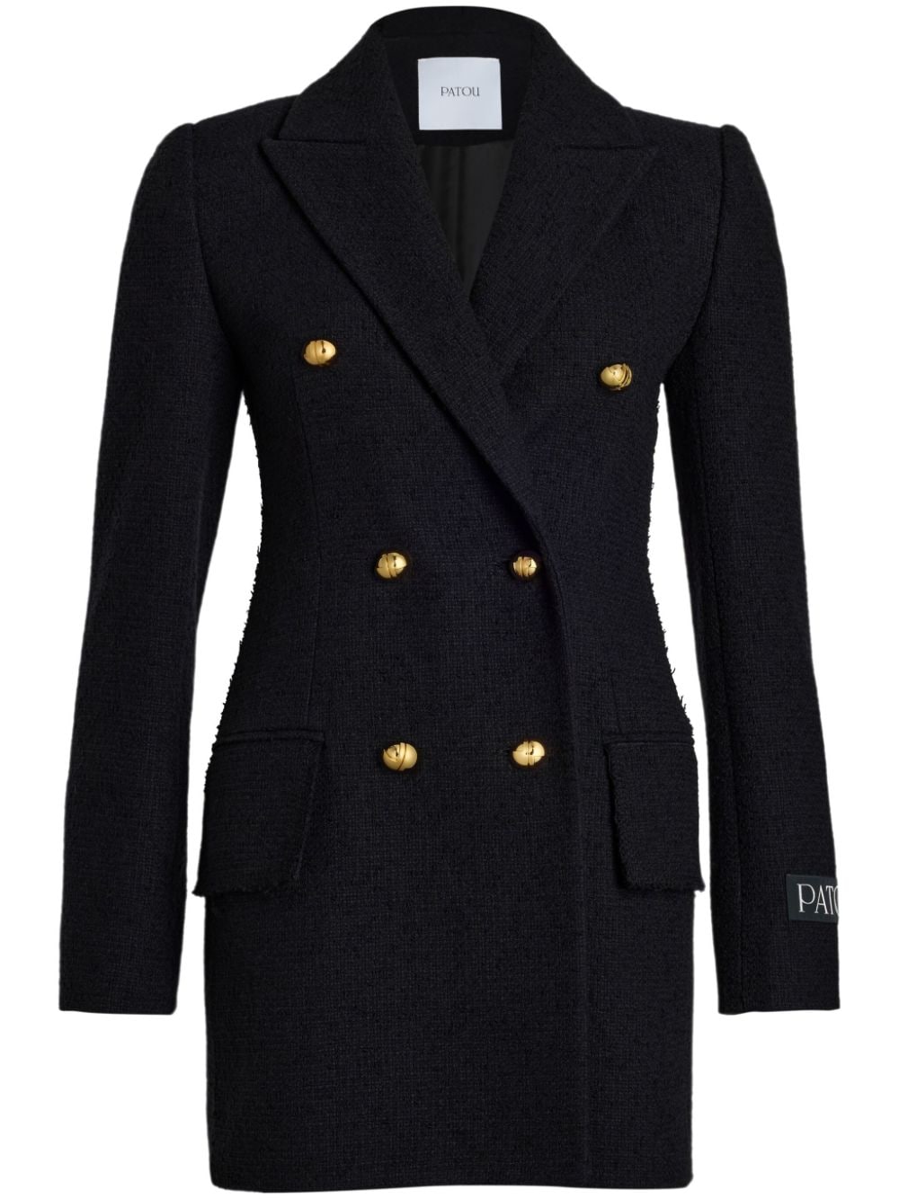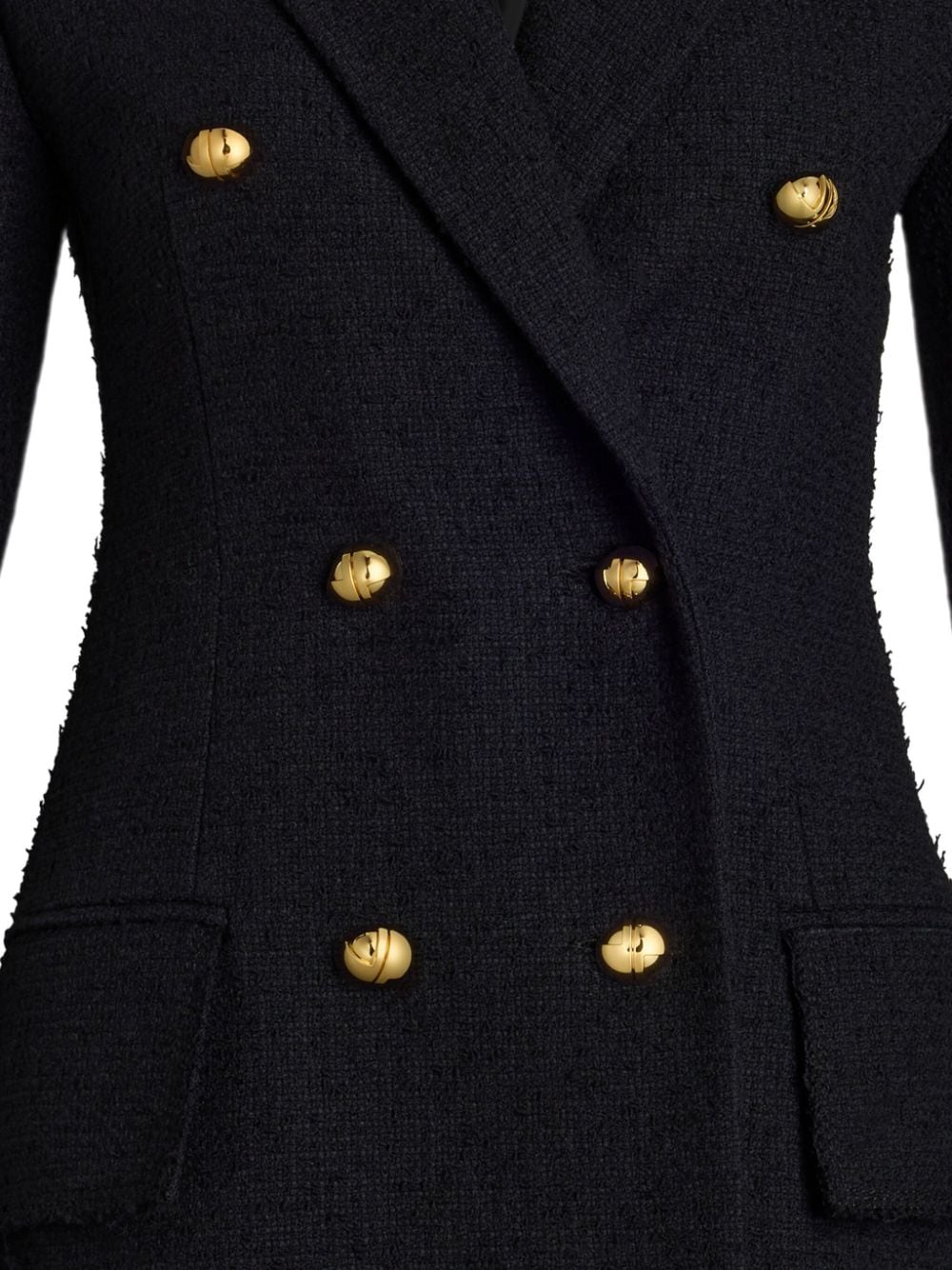 giacca, oppure, abito corto, doppio petto, revers a lancia, tessuto bouclé, chiusura con bottoni dorati a sfera e con logo, tasche laterali con pattine, spacco posteriore, foderata Composizione: 53% lana vergine 41% cotone 6% poliammide Istruzioni per il lavaggio: lavare a secco