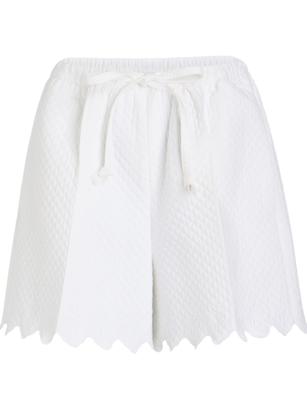 shorts, tessuto matelassè, vita elasticizzata, coulisse, tasche laterali, logo ricamato, fondo smerlato con ricamo floreale Composizione: 83% viscosa, 17% poliammide Istruzioni per il lavaggio: lavare a secco