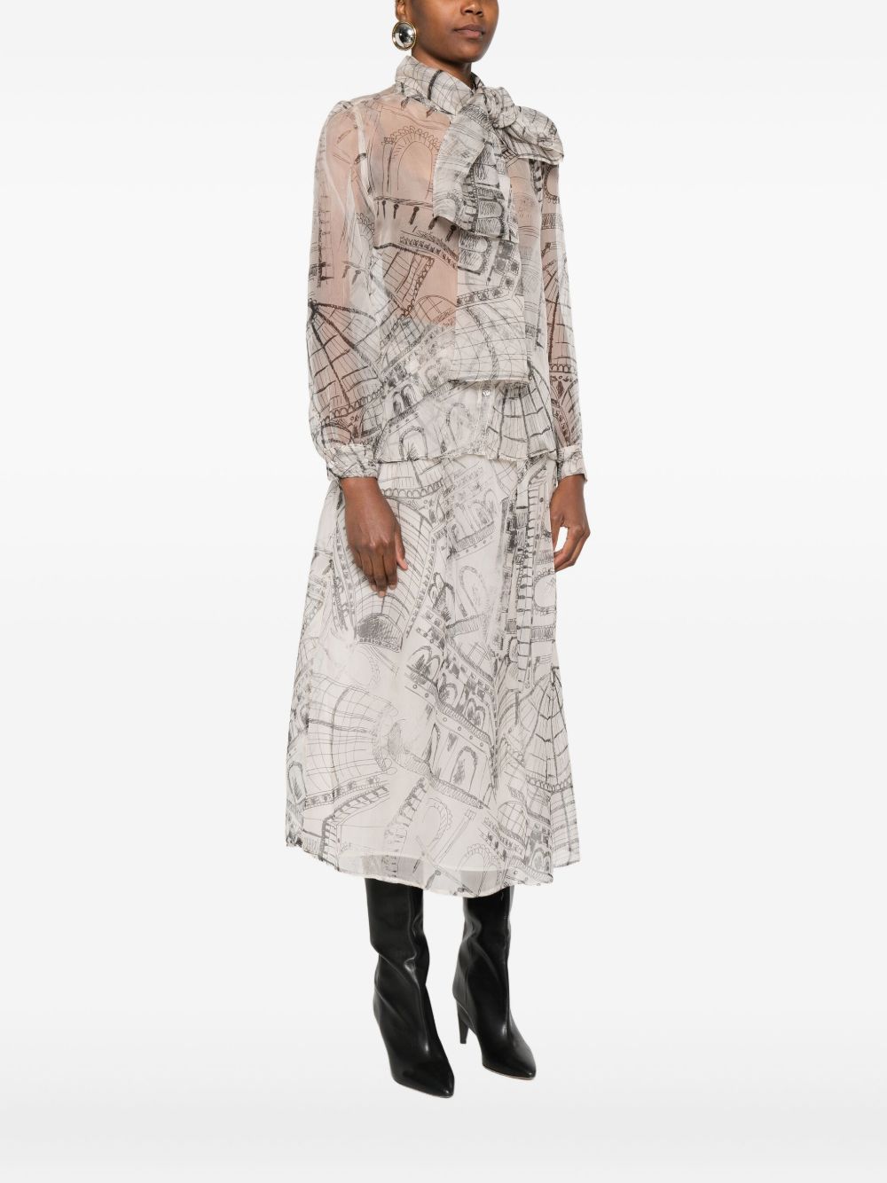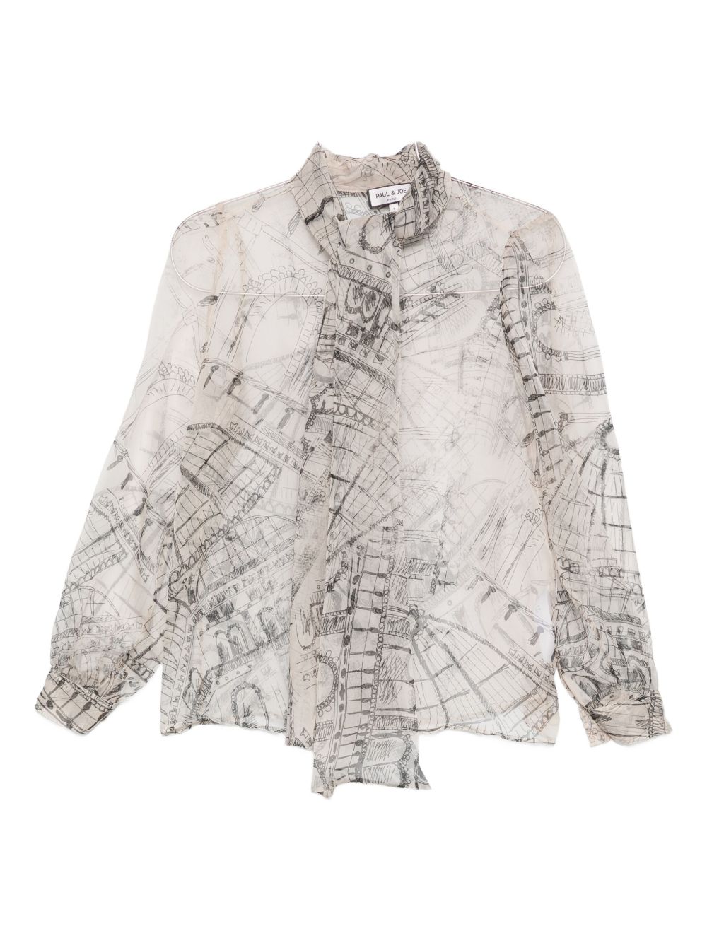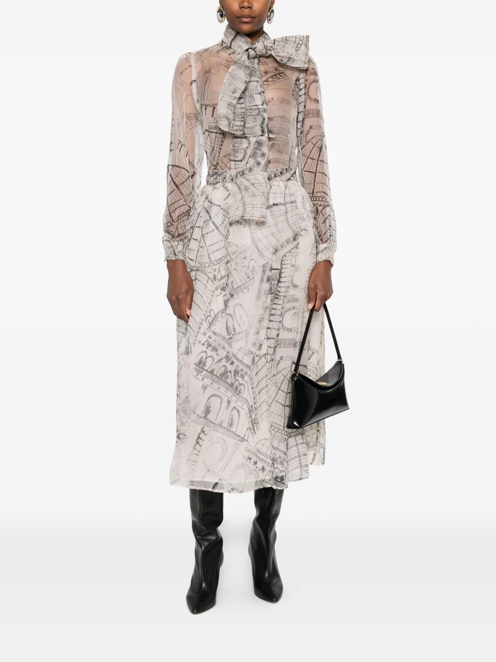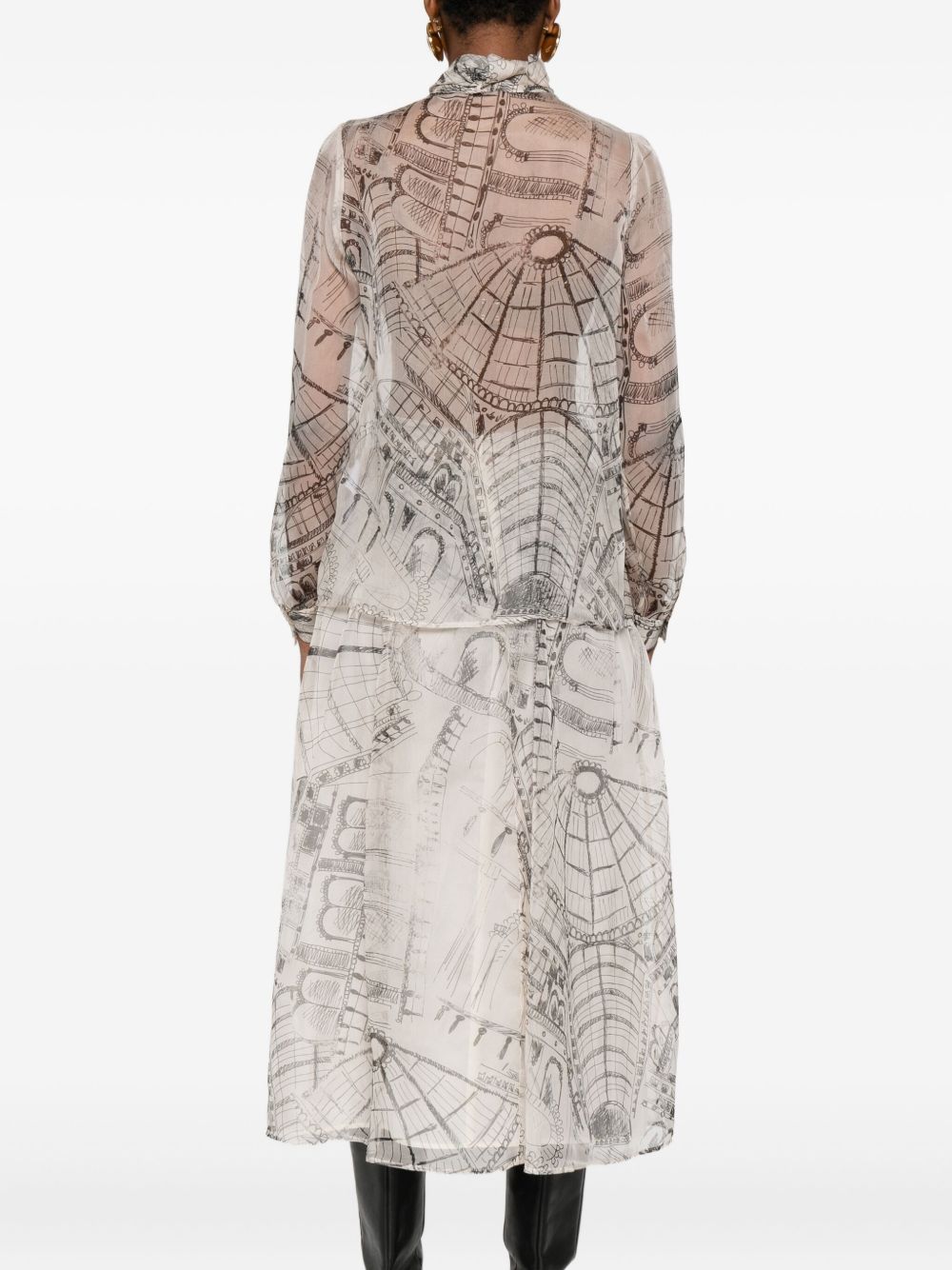 camicia, organza, stampa architettura, fiocco removibile, collo coreano, chiusura con bottoni, maniche lunghe, polsini con bottoni, semi-trasparente